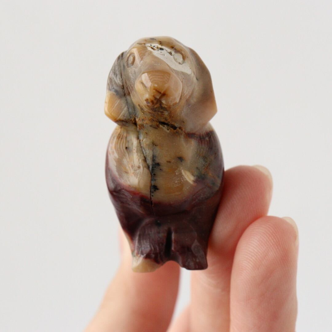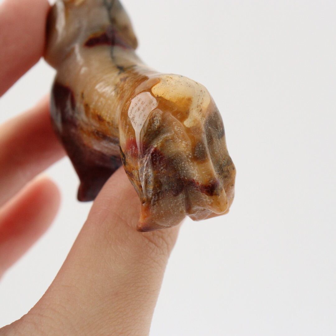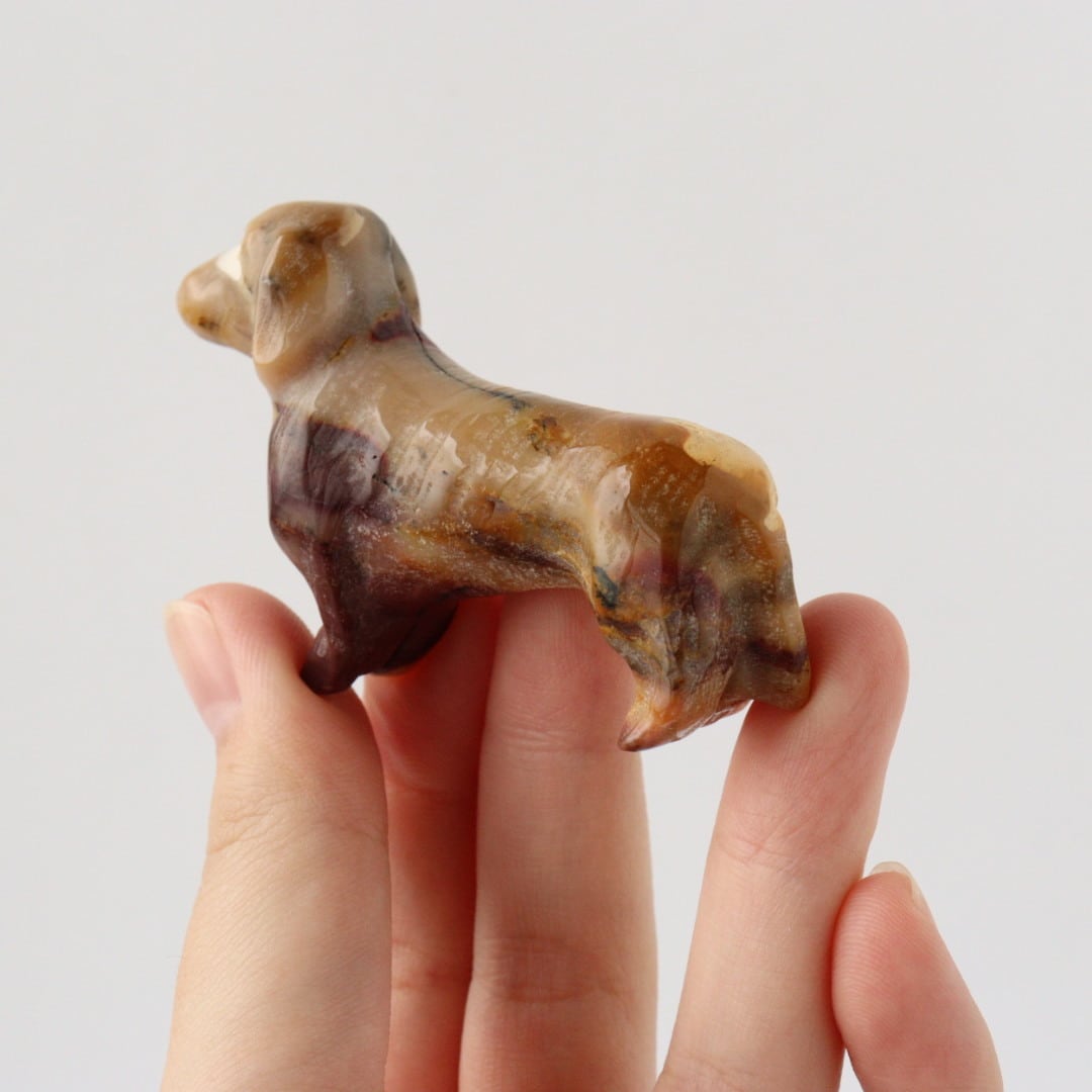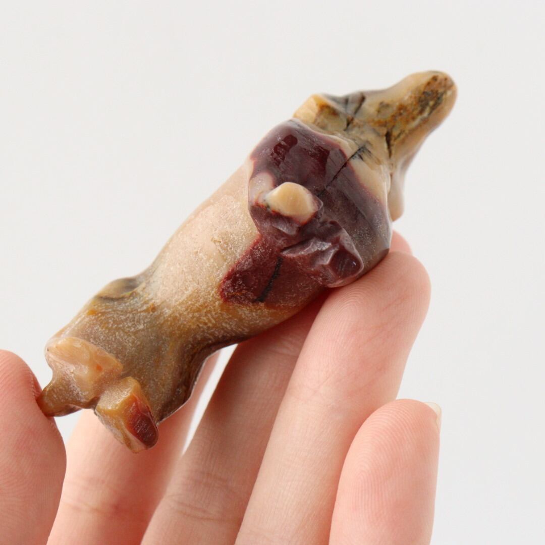 こちらは、イエロー、ブラウン、レッドが優しく入り混じり、ダックスフンドの形に磨かれたムーアカイト。ピクチャージャスパーのような自然の風合いがあり、素朴で温かな印象のひとつ です。