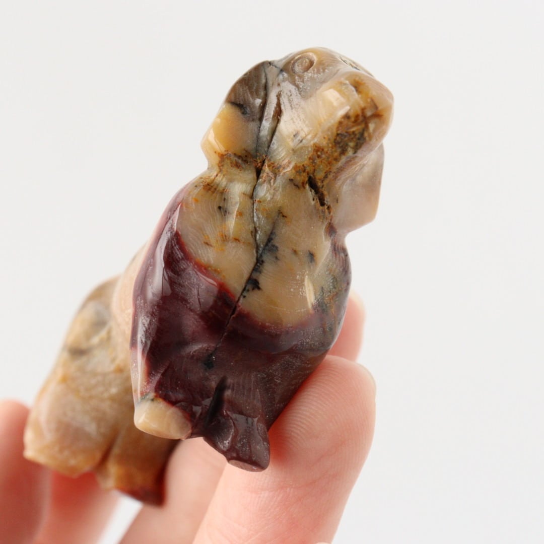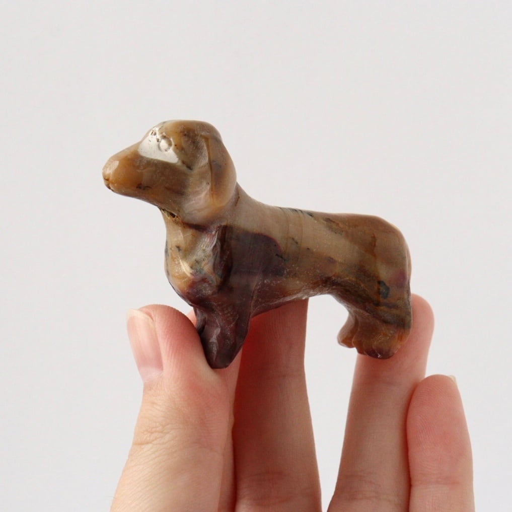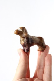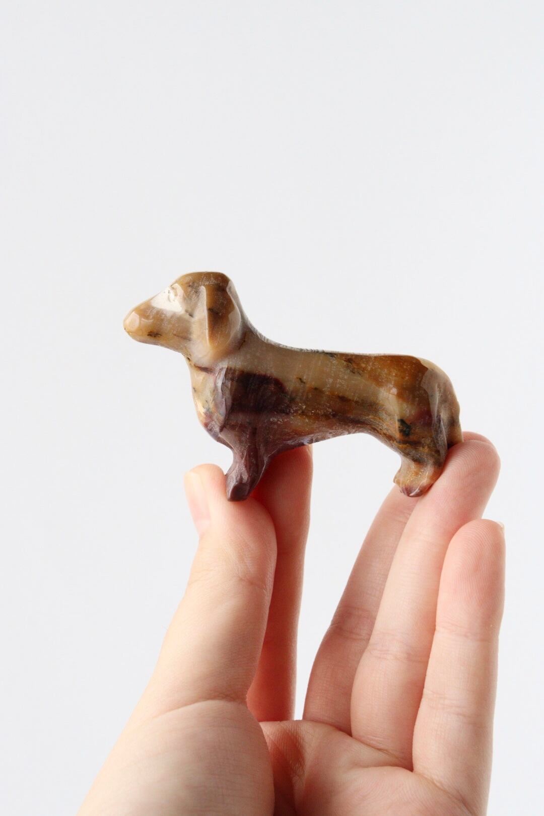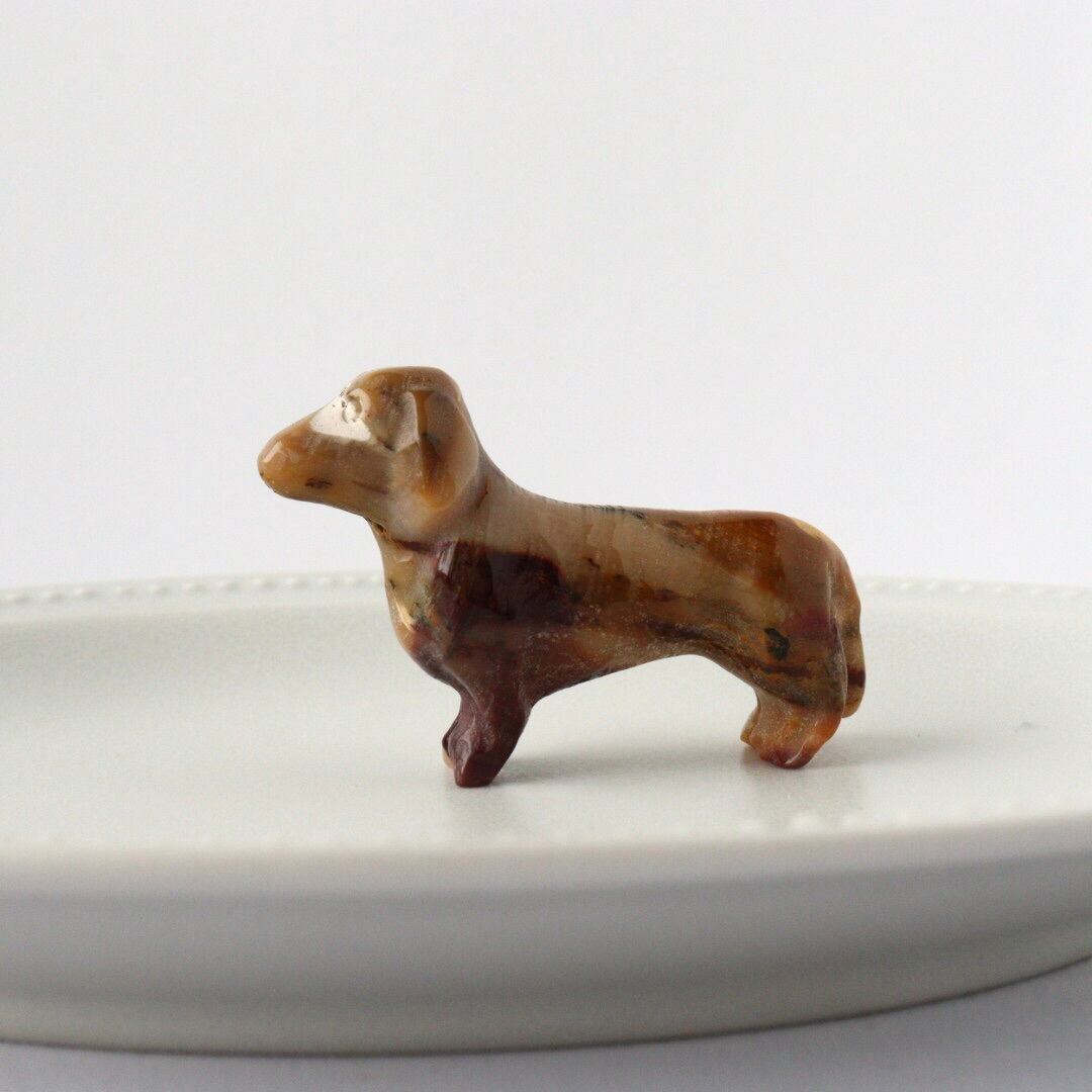 こちらは、イエロー、ブラウン、レッドが優しく入り混じり、ダックスフンドの形に磨かれたムーアカイト。ピクチャージャスパーのような自然の風合いがあり、素朴で温かな印象のひとつ です。
