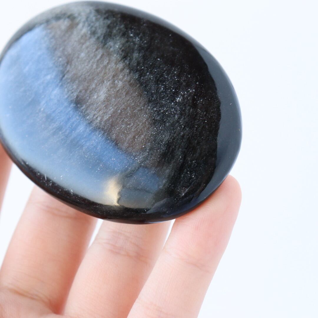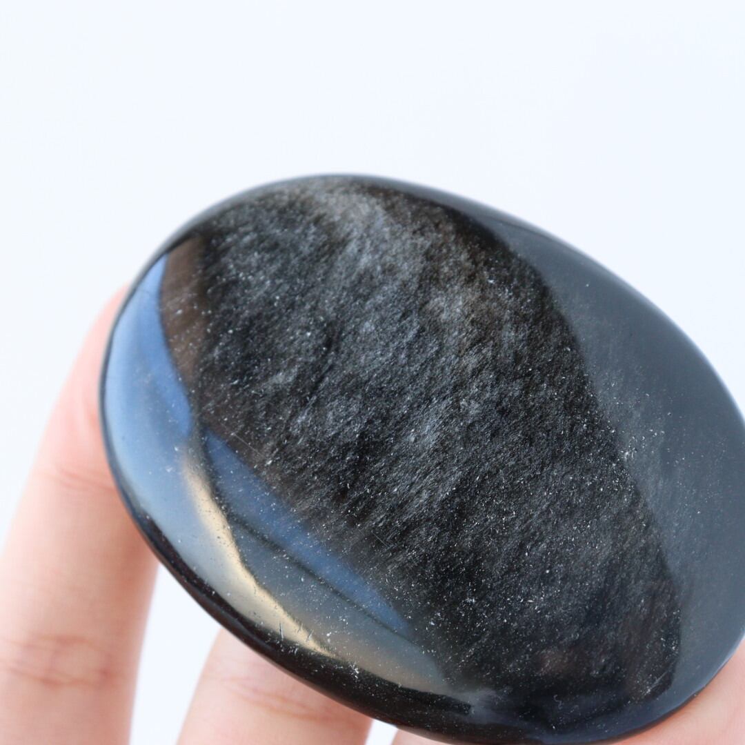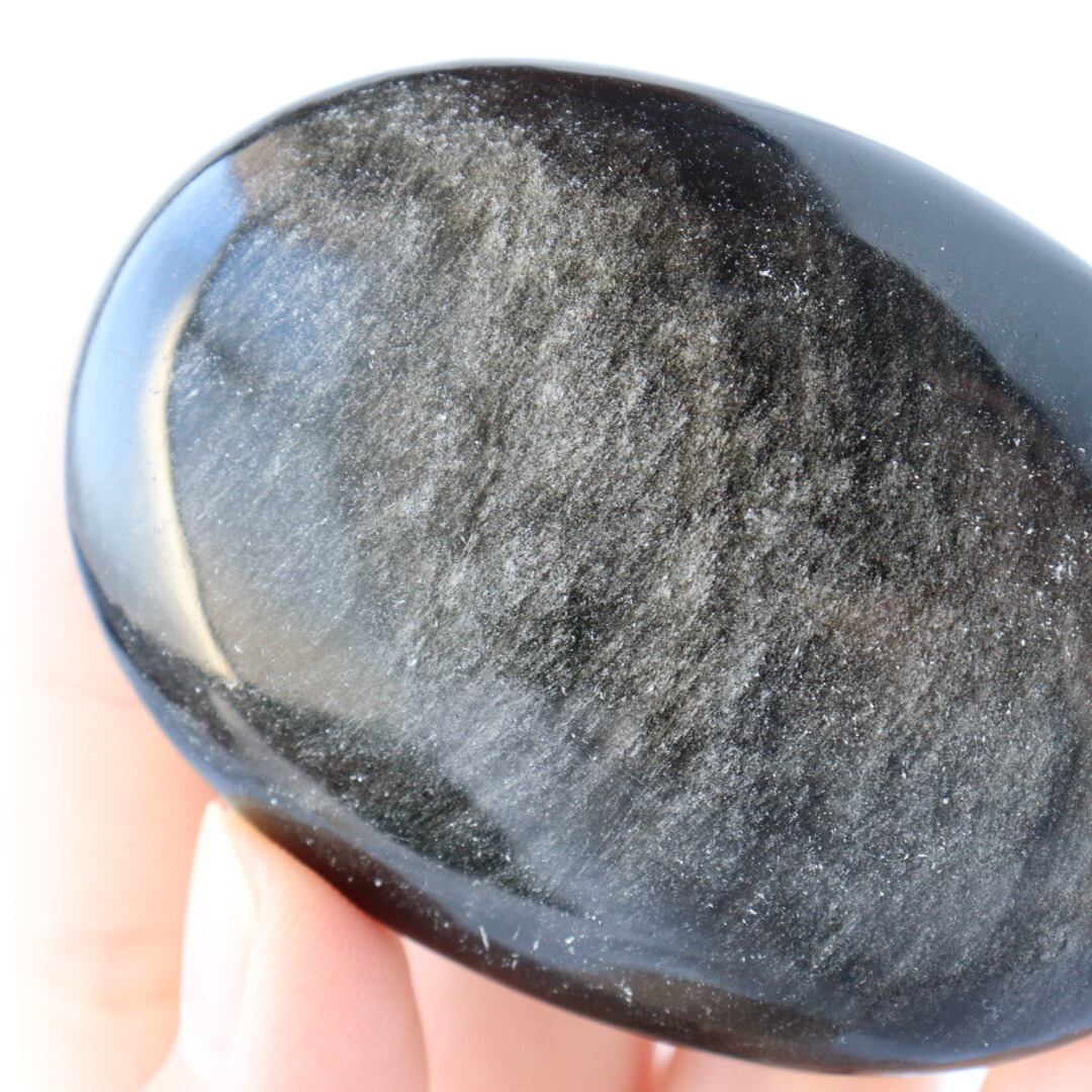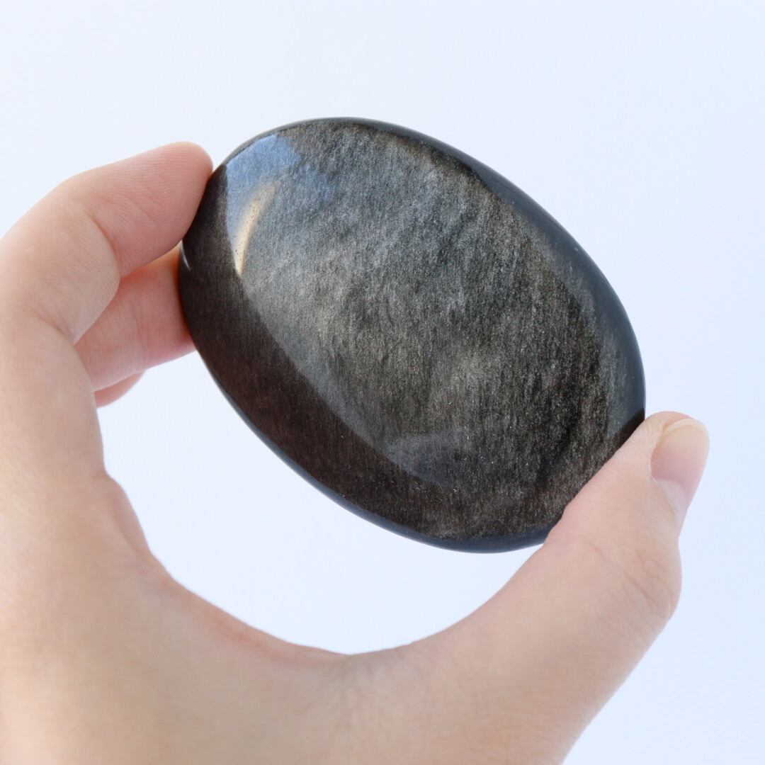 シルバーの繊細なきらめきが一面に広がる、シルバーオブシディアンの握り石。