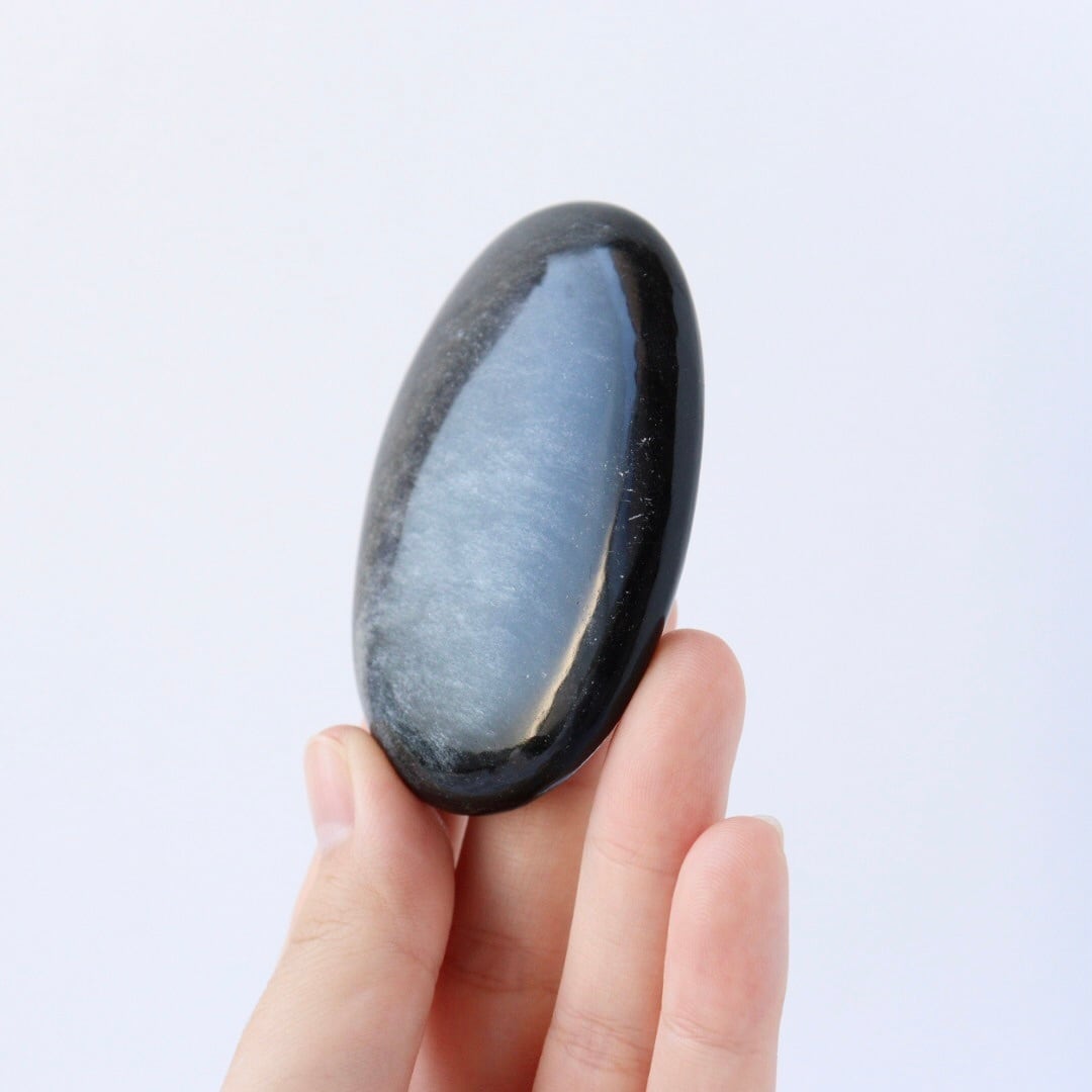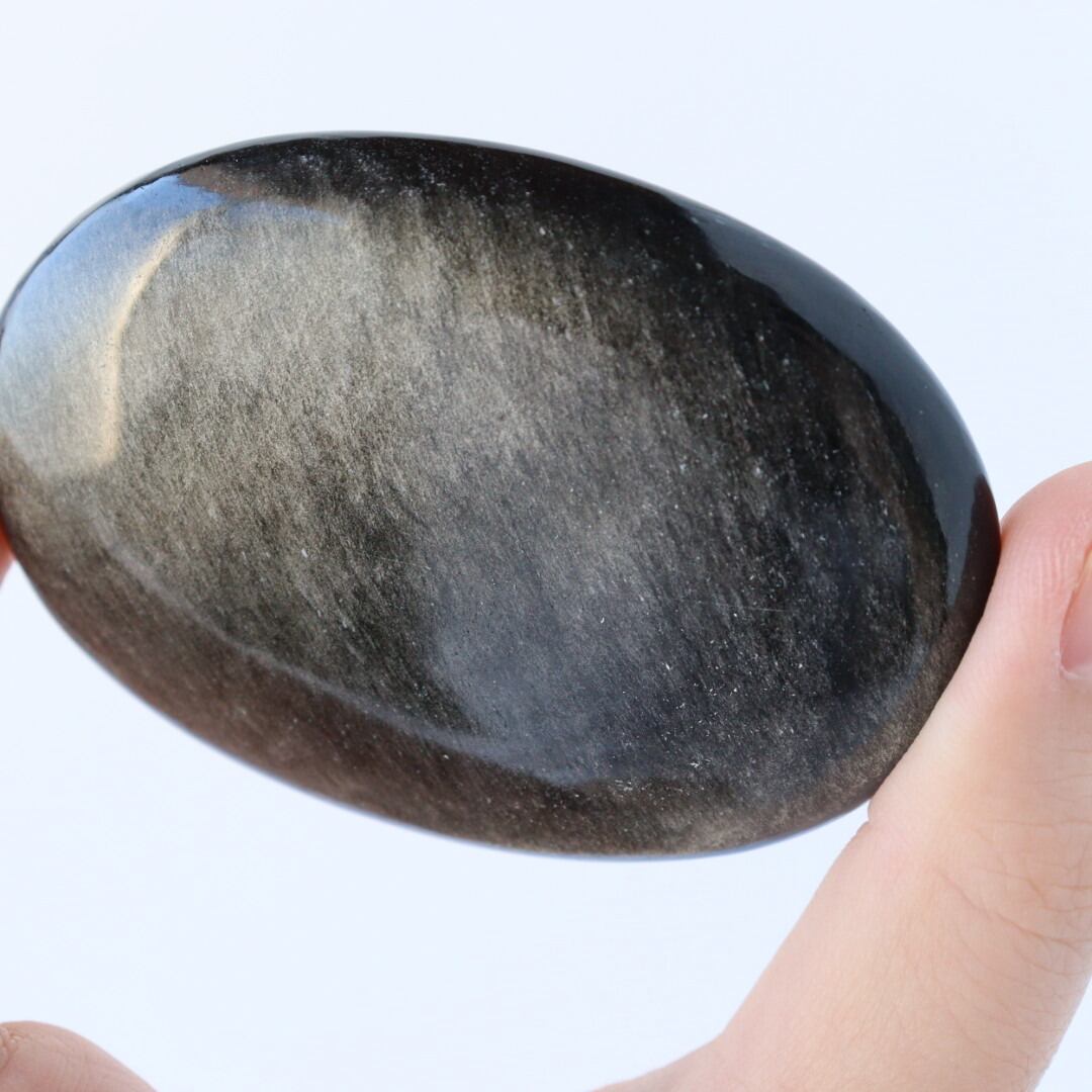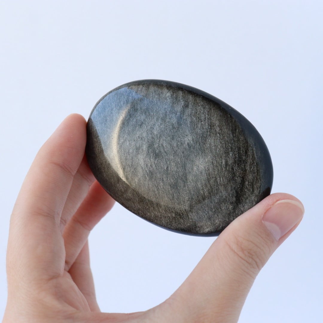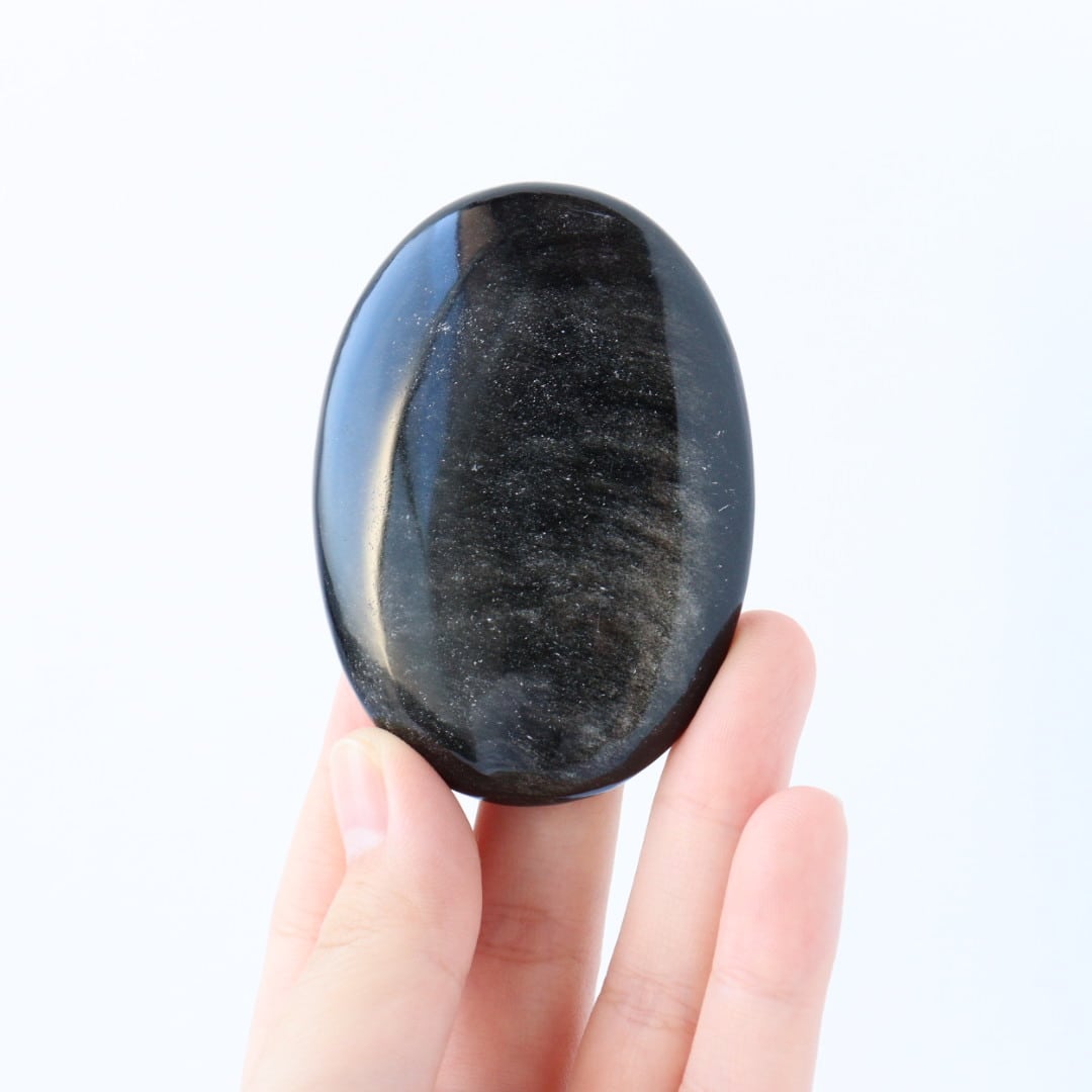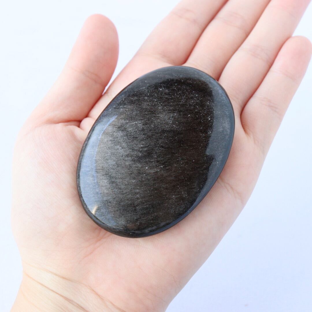 シルバーの繊細なきらめきが一面に広がる、シルバーオブシディアンの握り石。