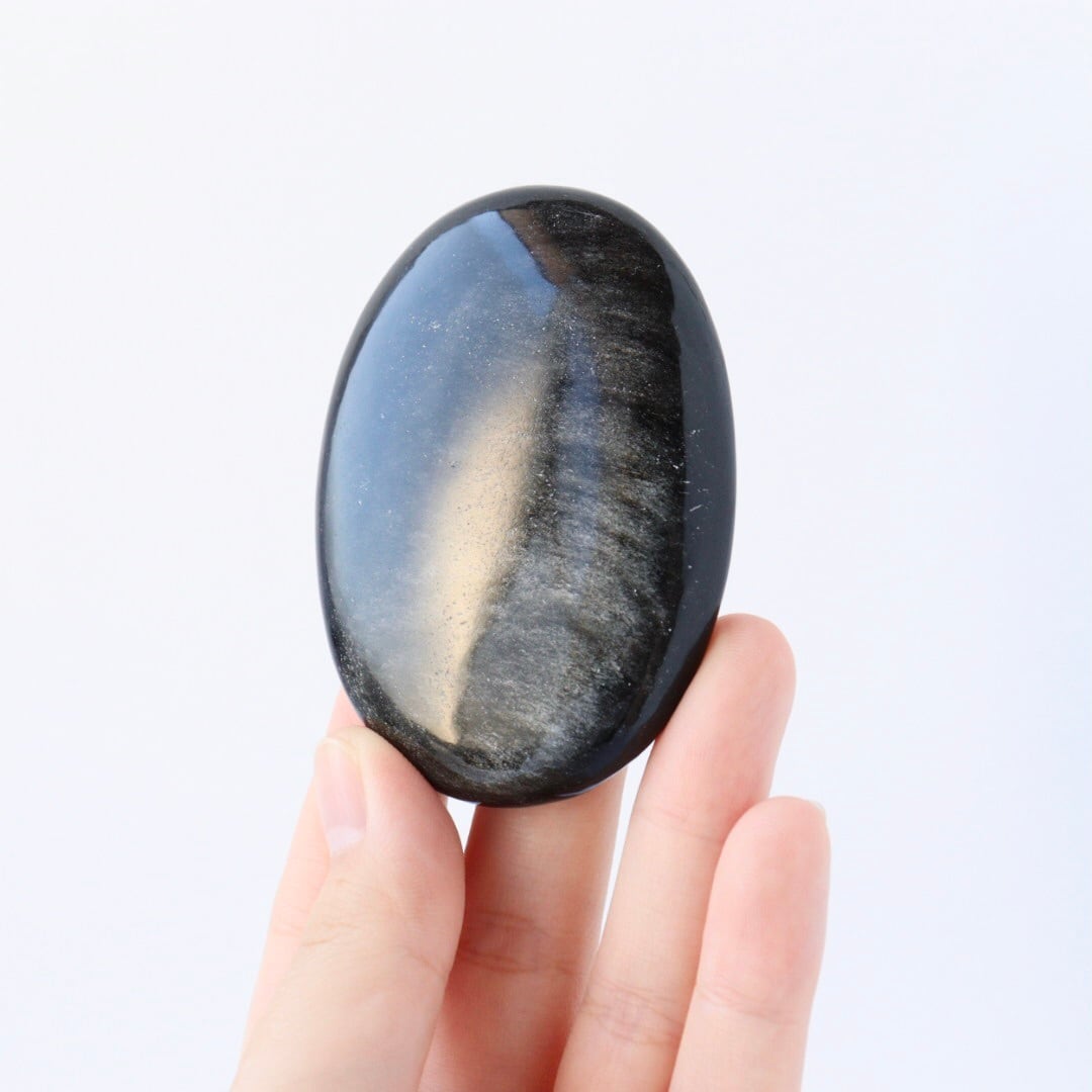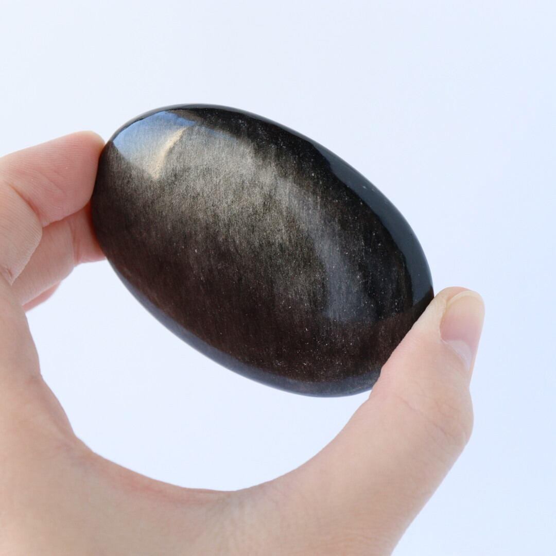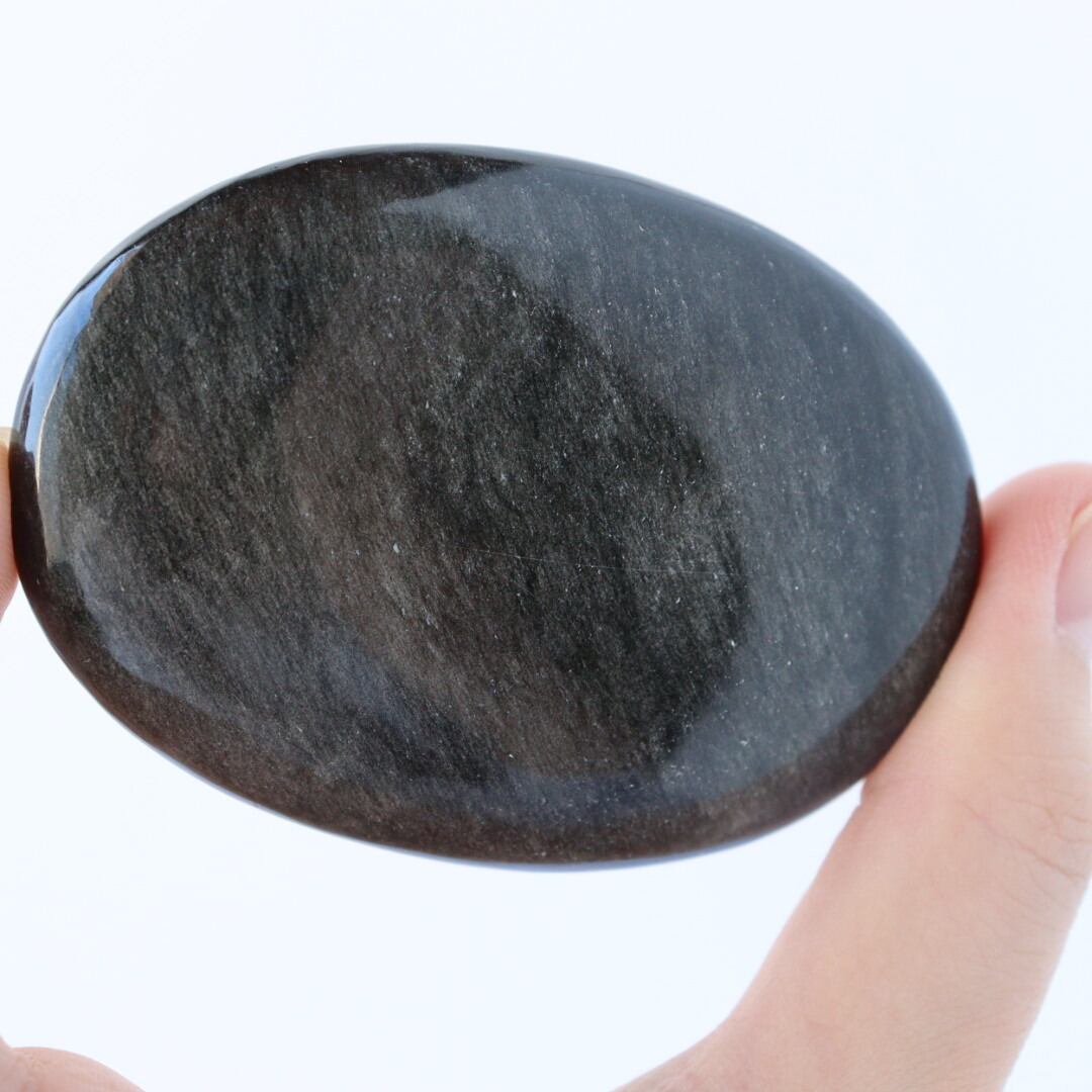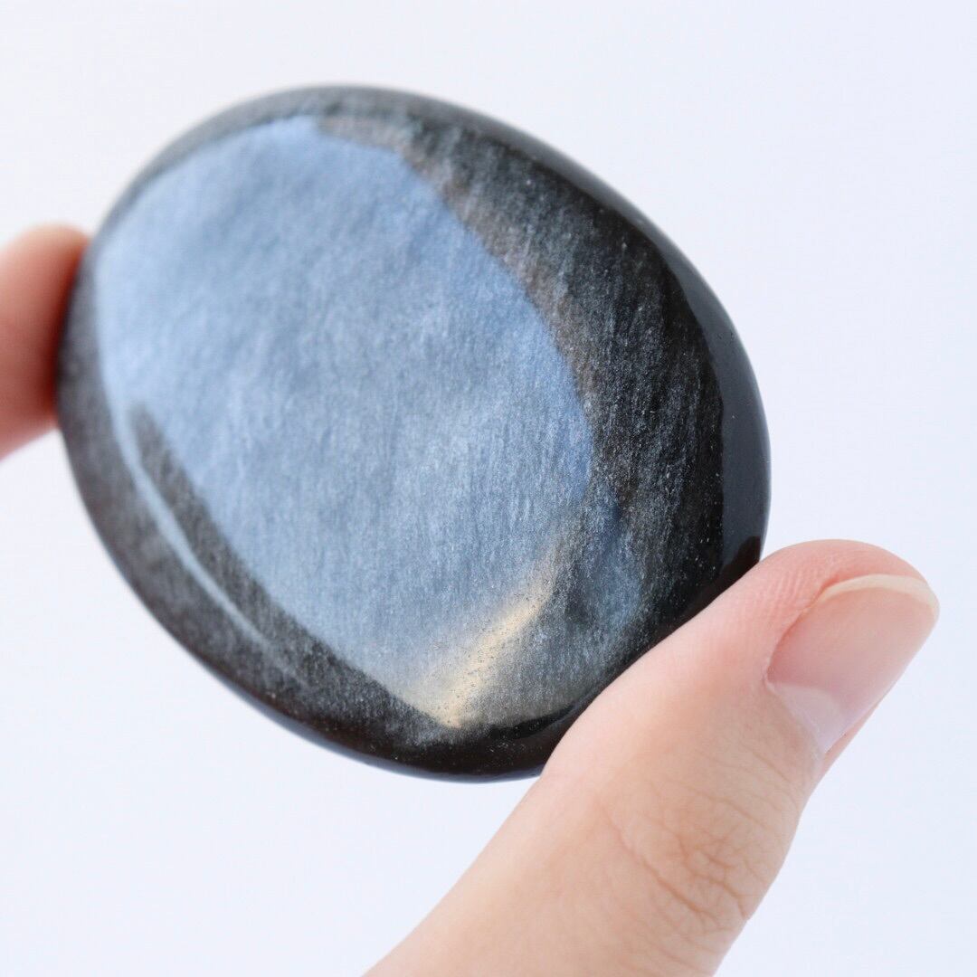 シルバーの繊細なきらめきが一面に広がる、シルバーオブシディアンの握り石。