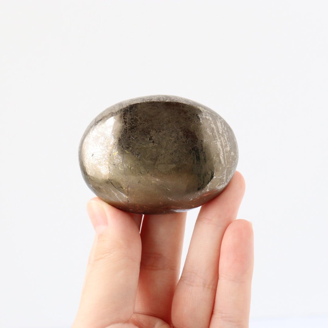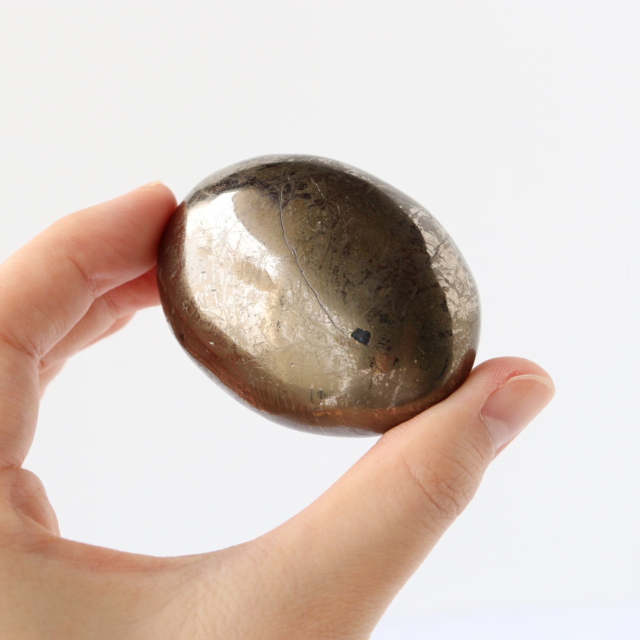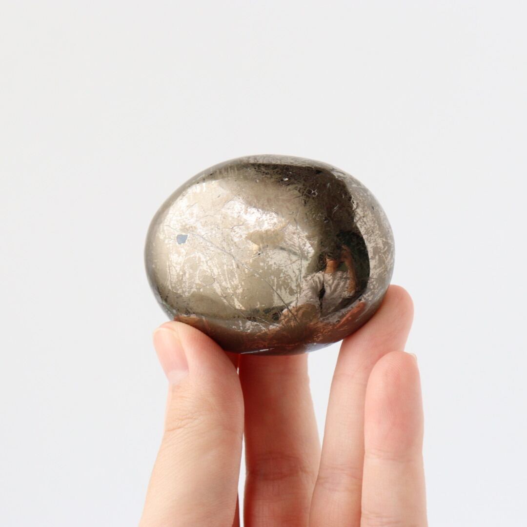 こちらは、美しいゴールドの輝きを放つパイライトの握り石。