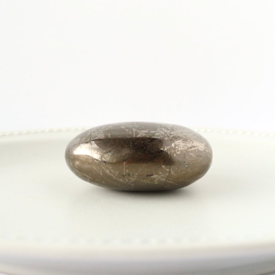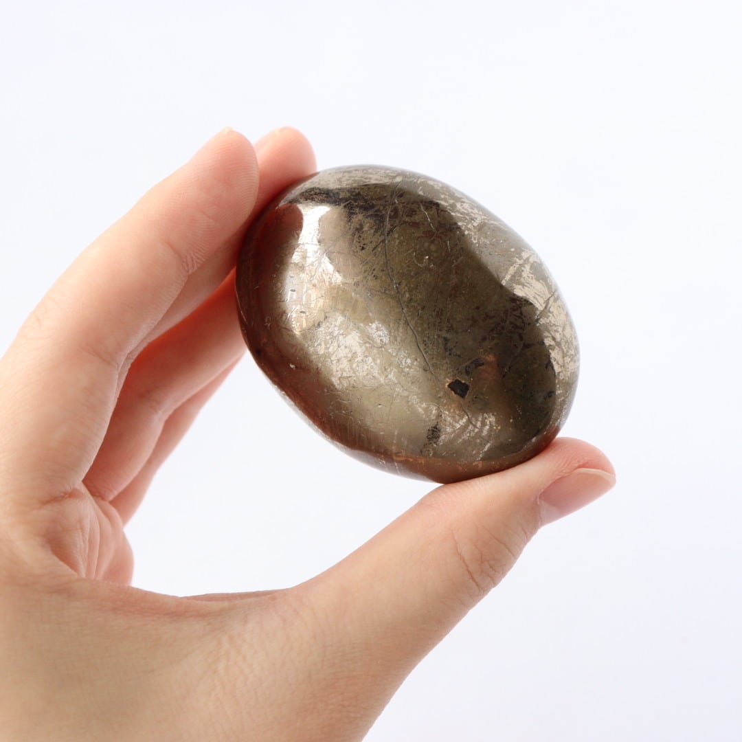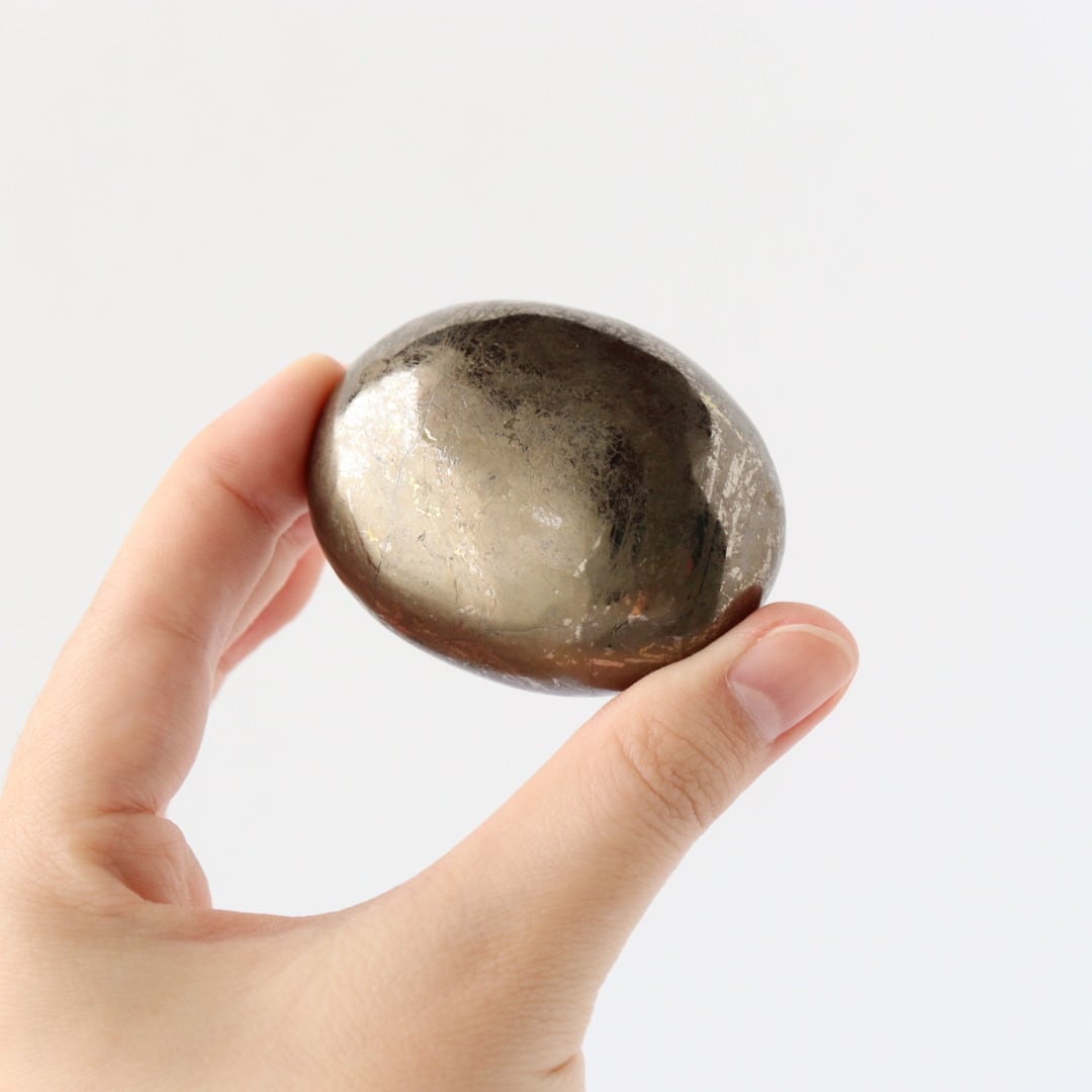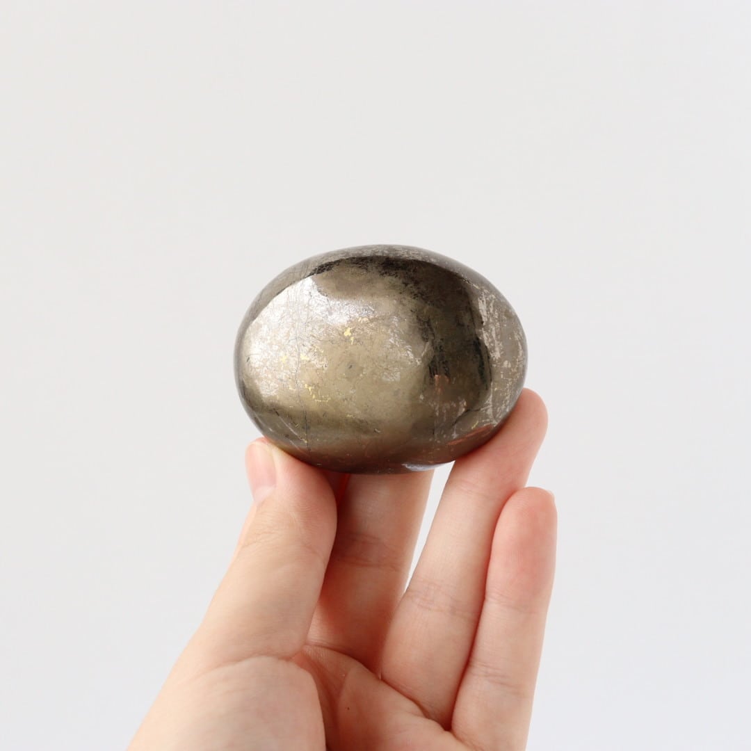 こちらは、美しいゴールドの輝きを放つパイライトの握り石。