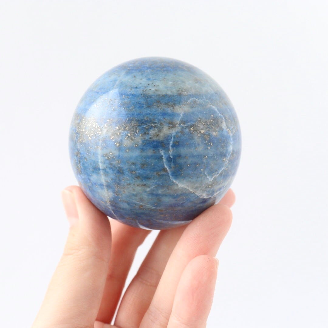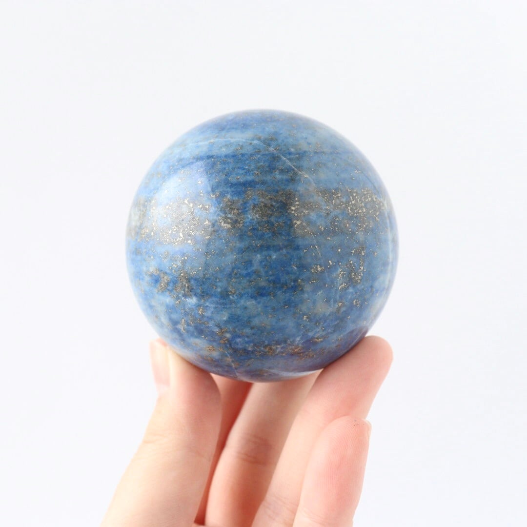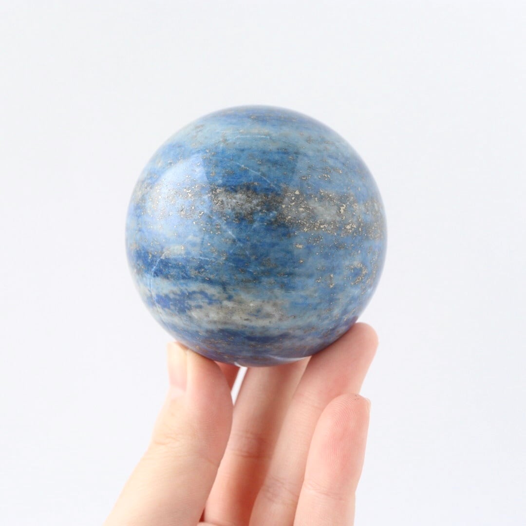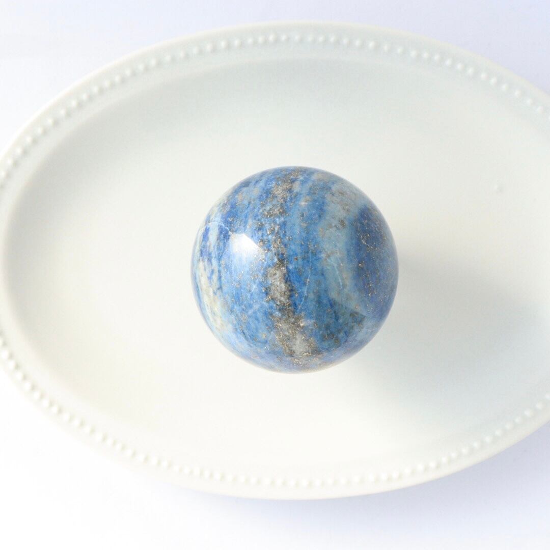 澄んだ夜気に溶け込む月明かりのような、明るくやさしいブルーが印象的なラピスラズリのスフィア。スカイブルーにも似た軽やかな色調の中に、パイライトが点々と散り、月の光が強い夜に見上げた星空のような情景を思わせる、美しく心に残る佇まいです。
