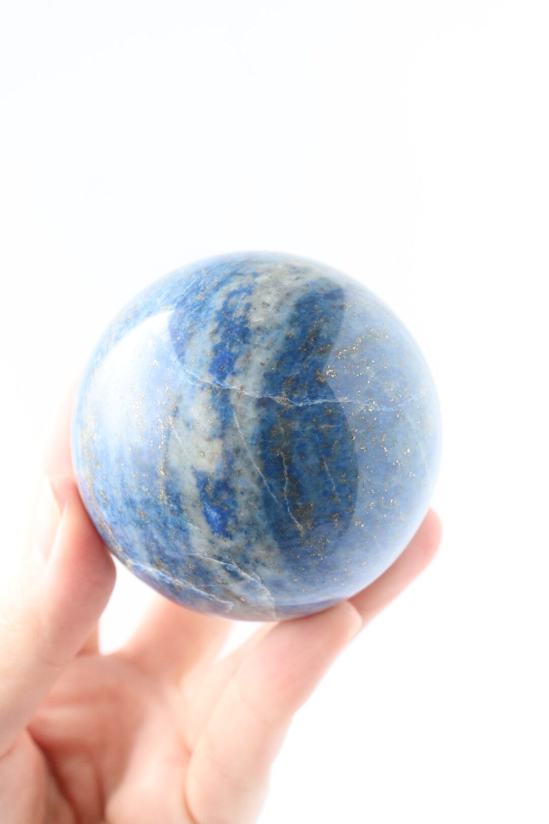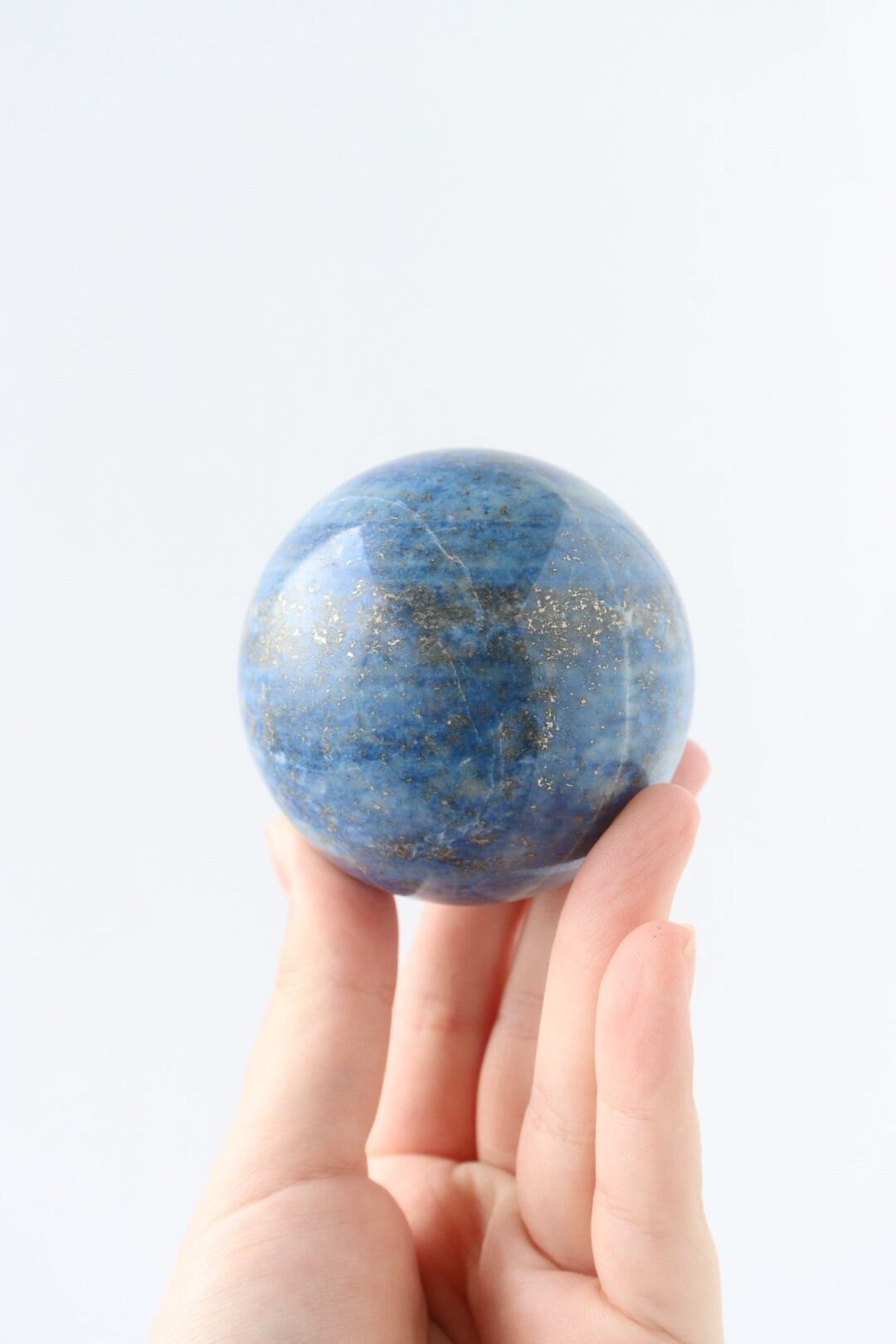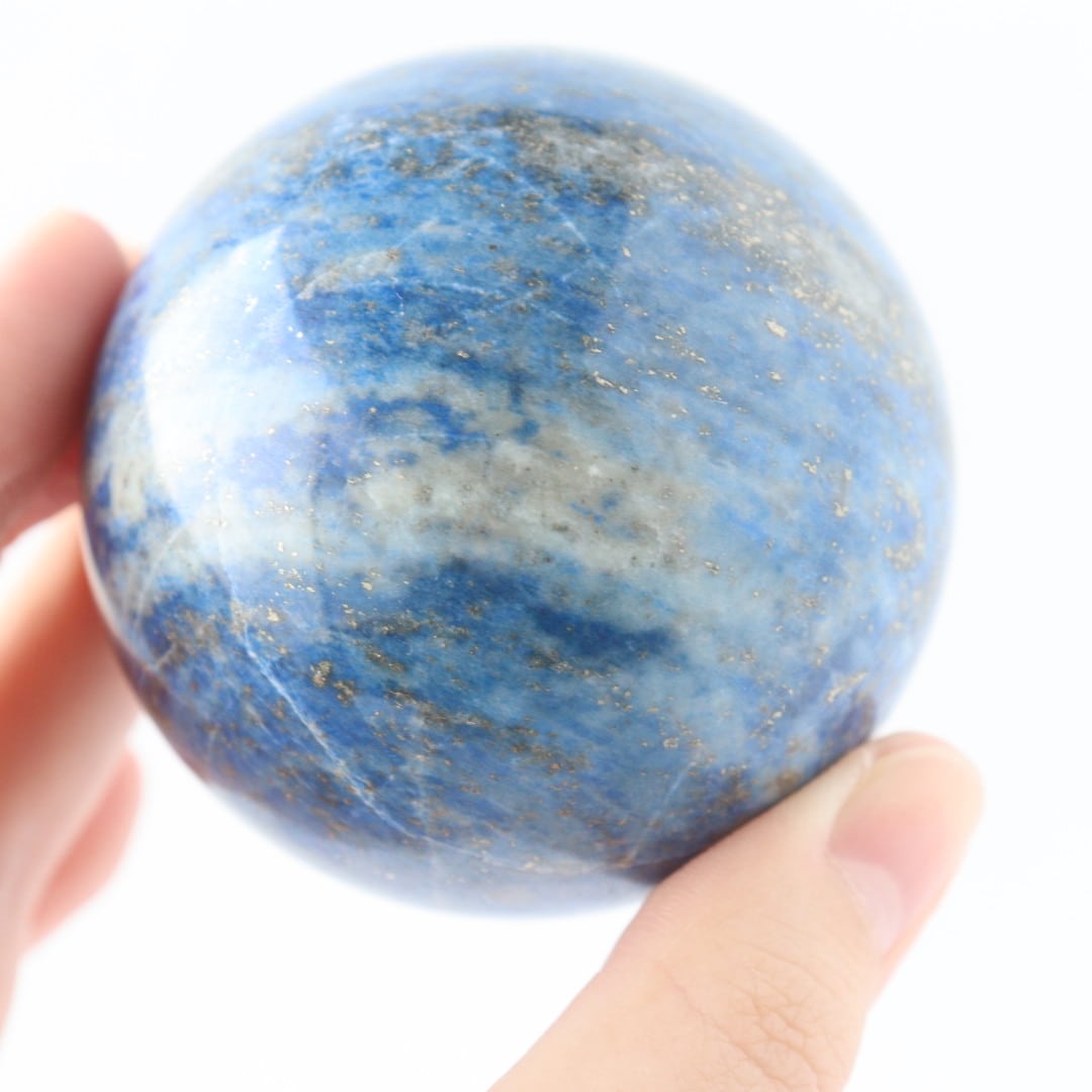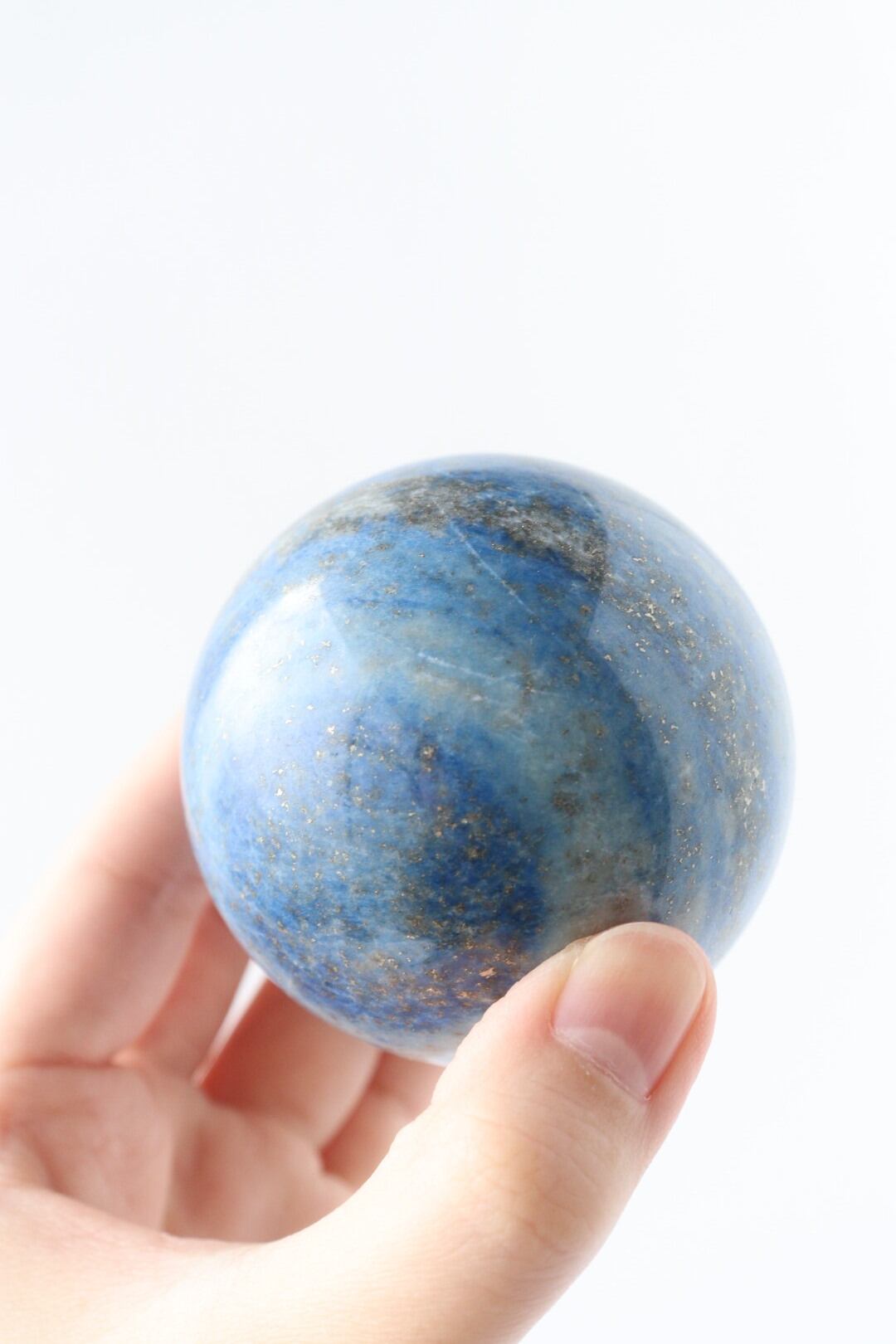 澄んだ夜気に溶け込む月明かりのような、明るくやさしいブルーが印象的なラピスラズリのスフィア。スカイブルーにも似た軽やかな色調の中に、パイライトが点々と散り、月の光が強い夜に見上げた星空のような情景を思わせる、美しく心に残る佇まいです。