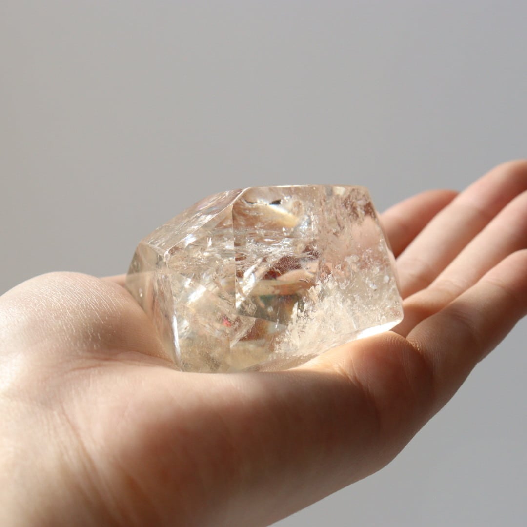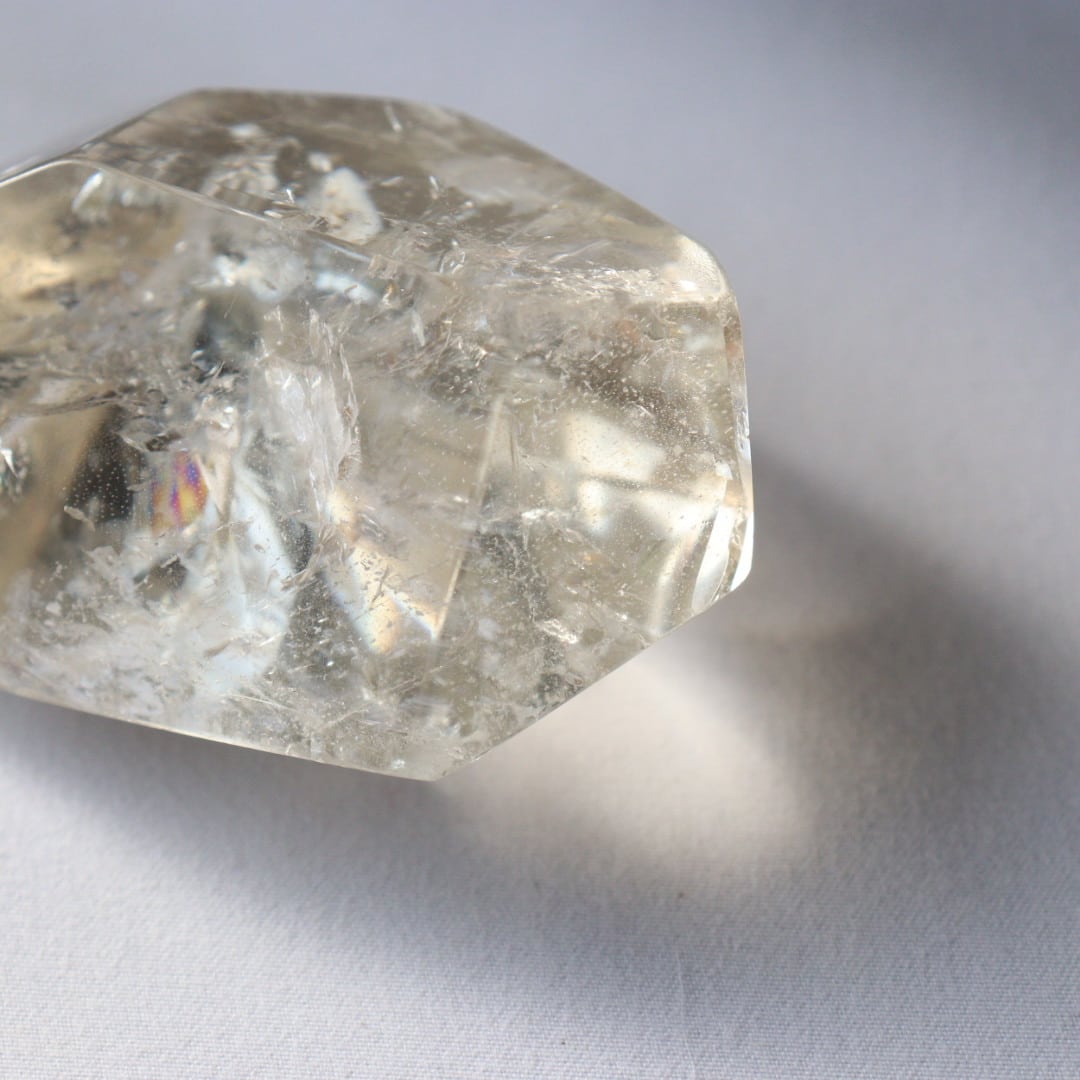 光をすっと通す淡い黄金色の中に、きらめく虹が静かに広がるシトリンのフリーフォーム。