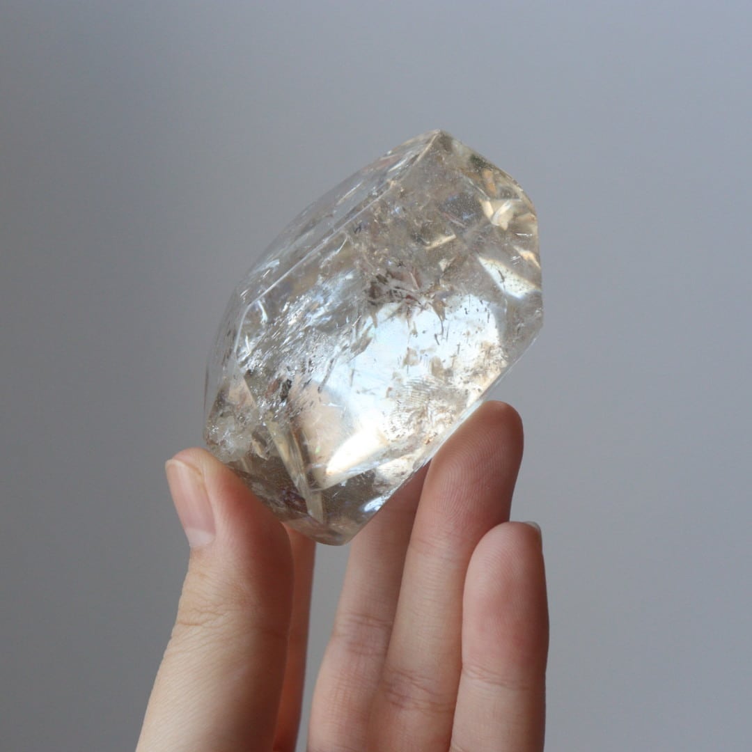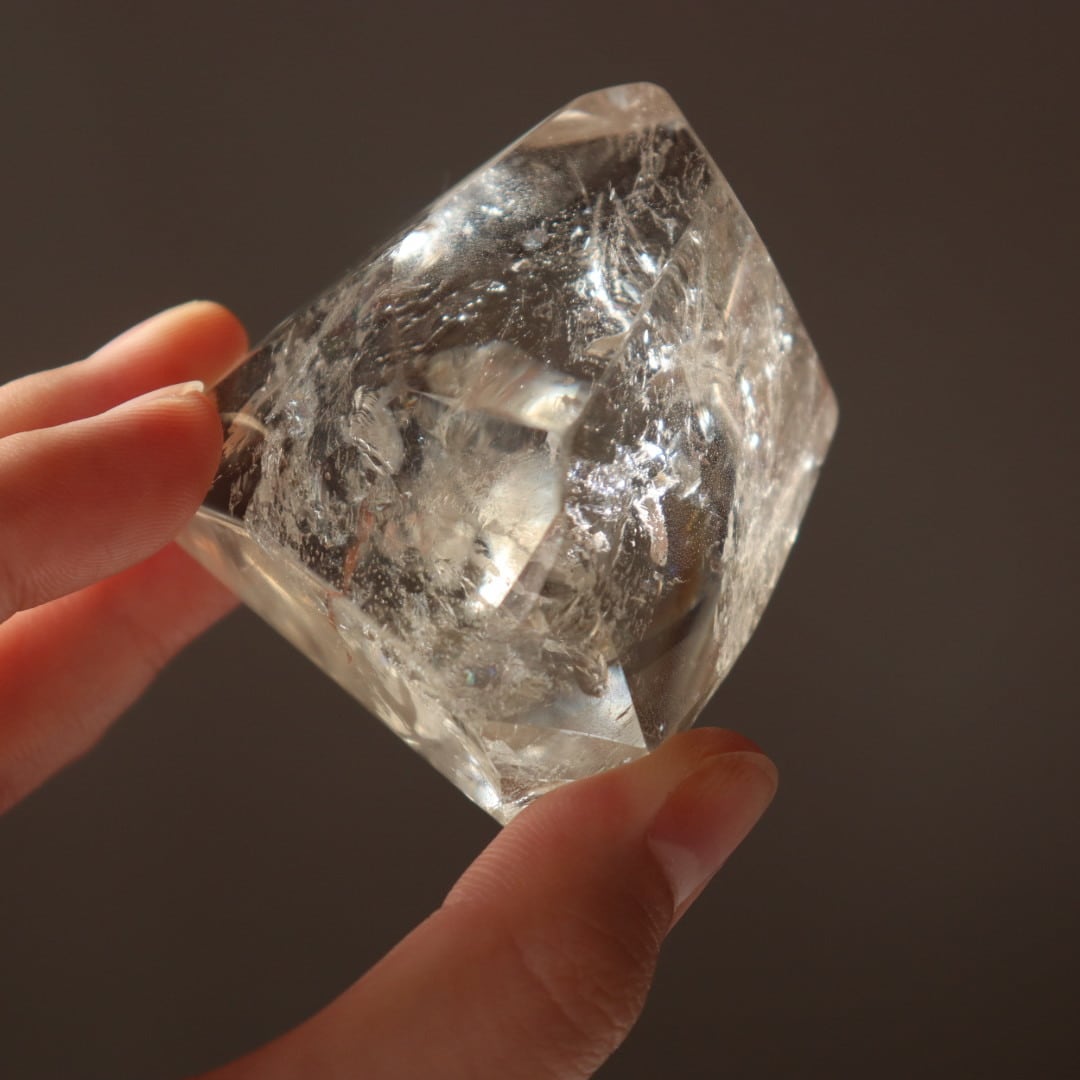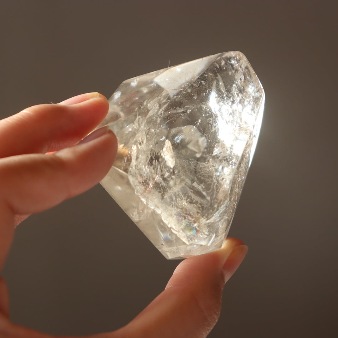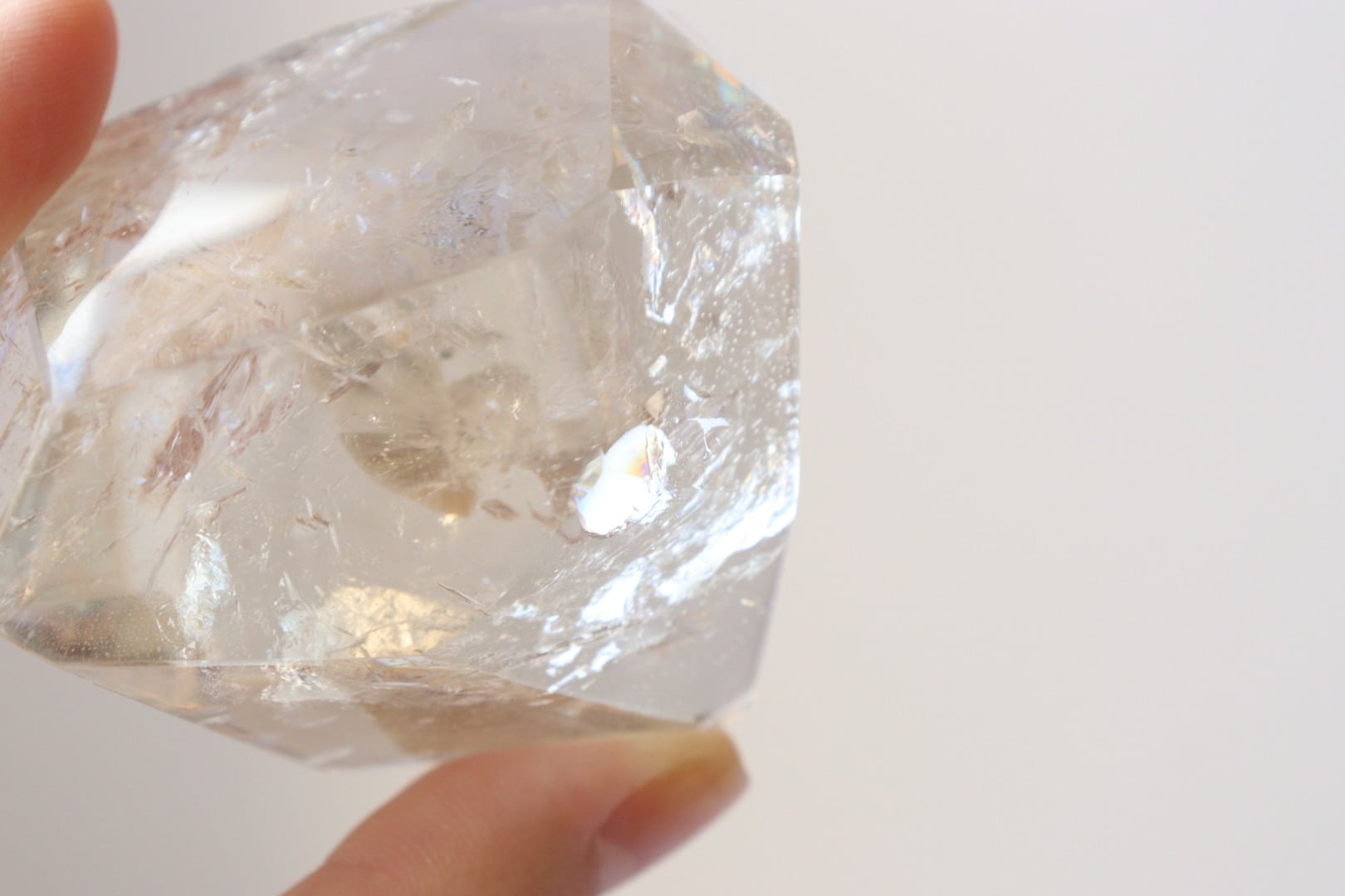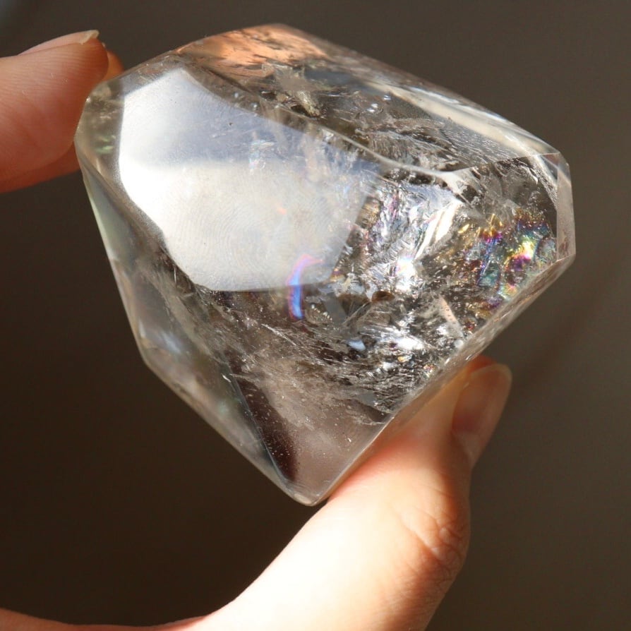 やさしく穏やかな発色は近年なかなか出会えない品質の高さを感じさせ、大きな大きな宝石のようにカットされた結晶内にはたくさんの大きな虹たちが内包されています。