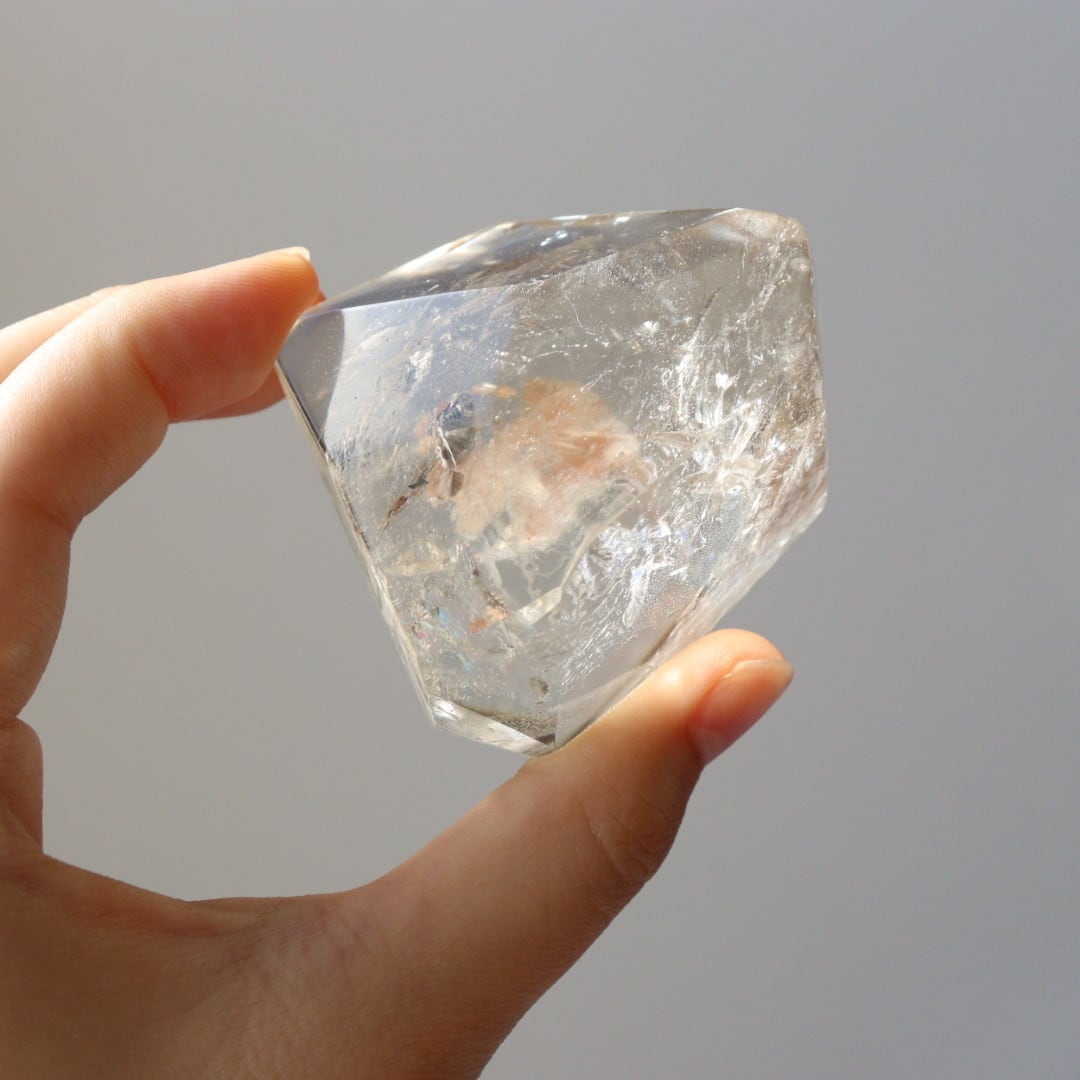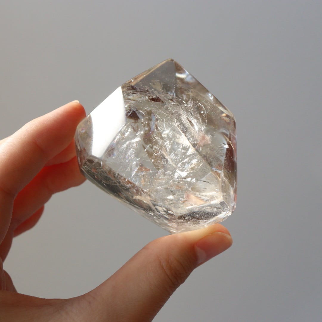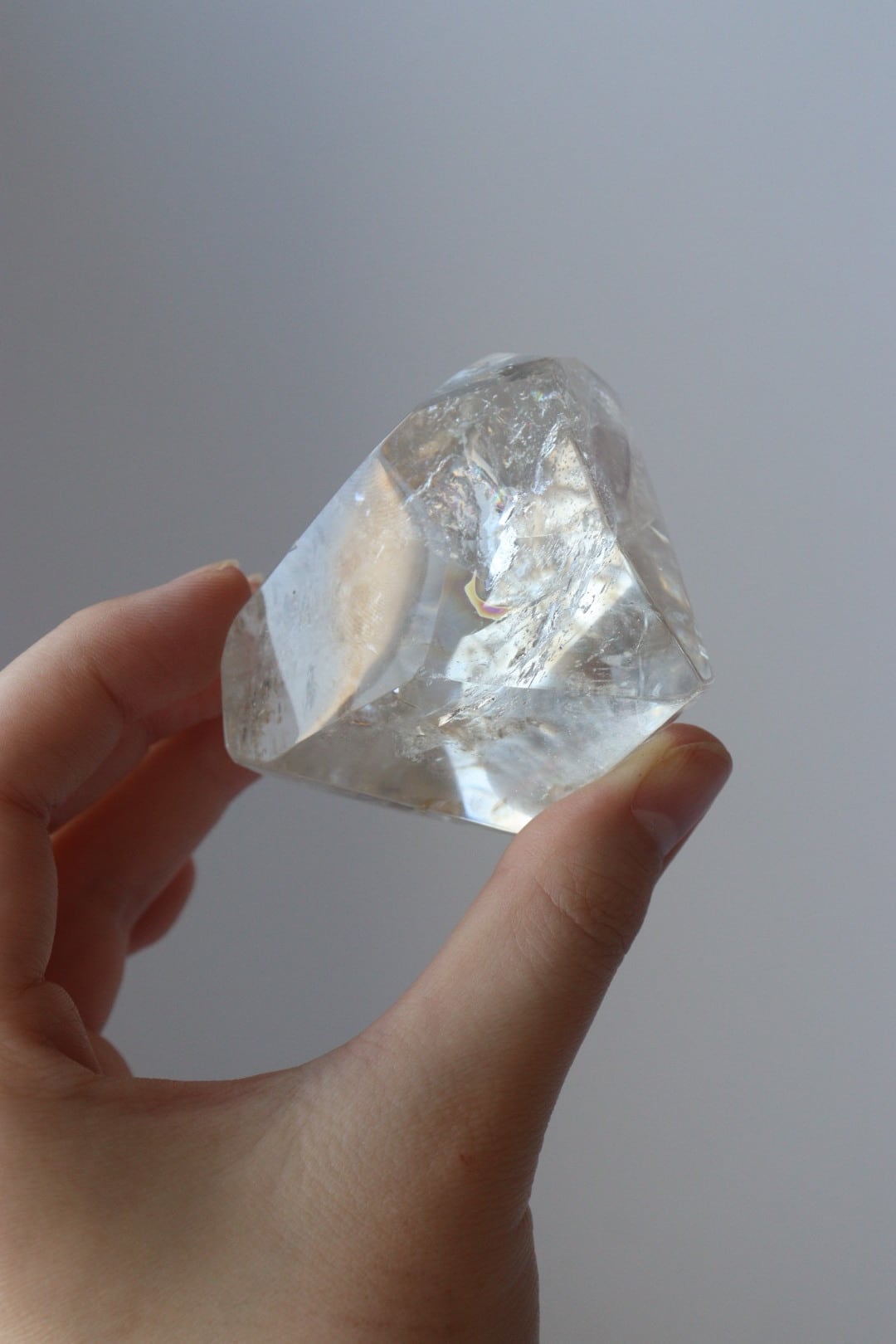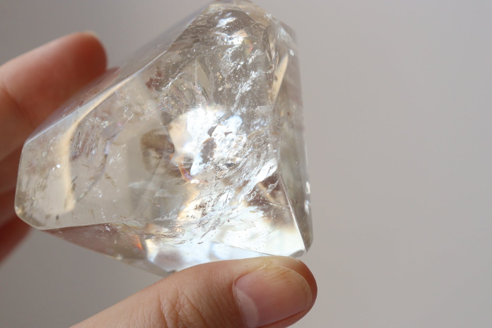 やさしく穏やかな発色は近年なかなか出会えない品質の高さを感じさせ、大きな大きな宝石のようにカットされた結晶内にはたくさんの大きな虹たちが内包されています。