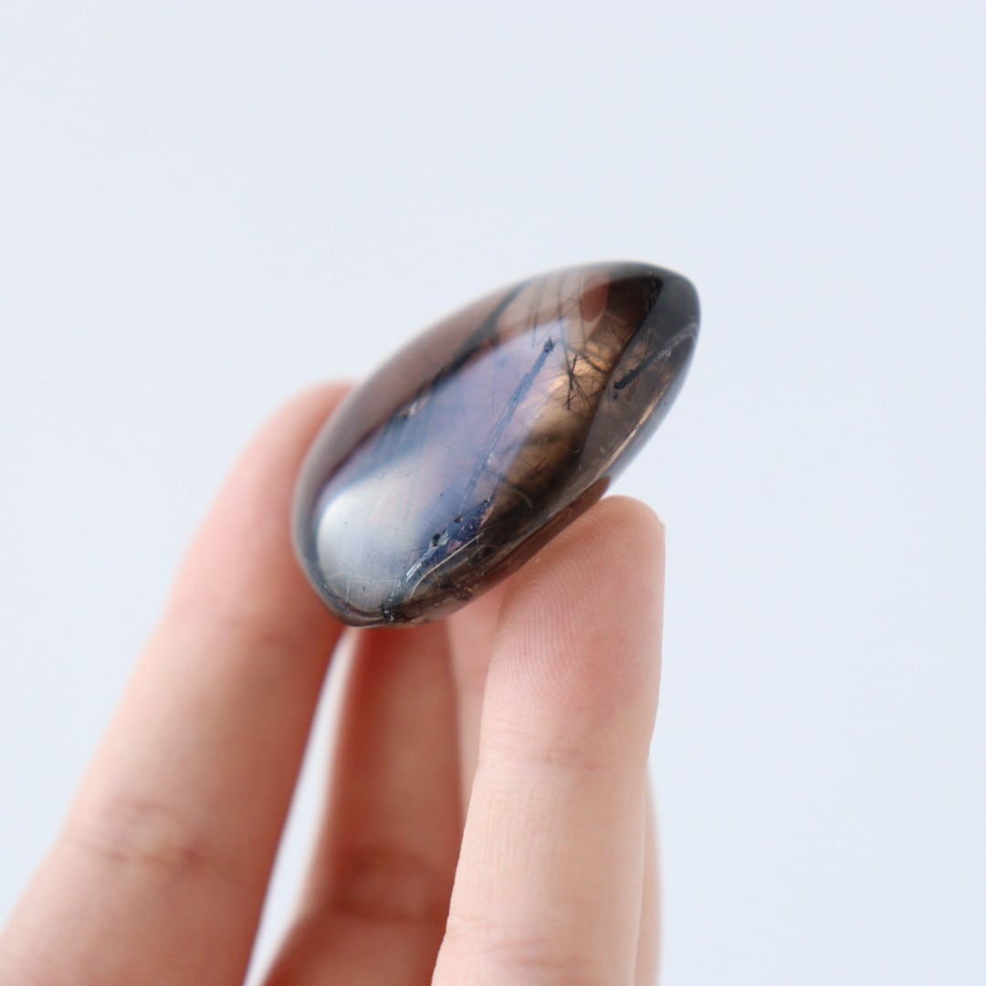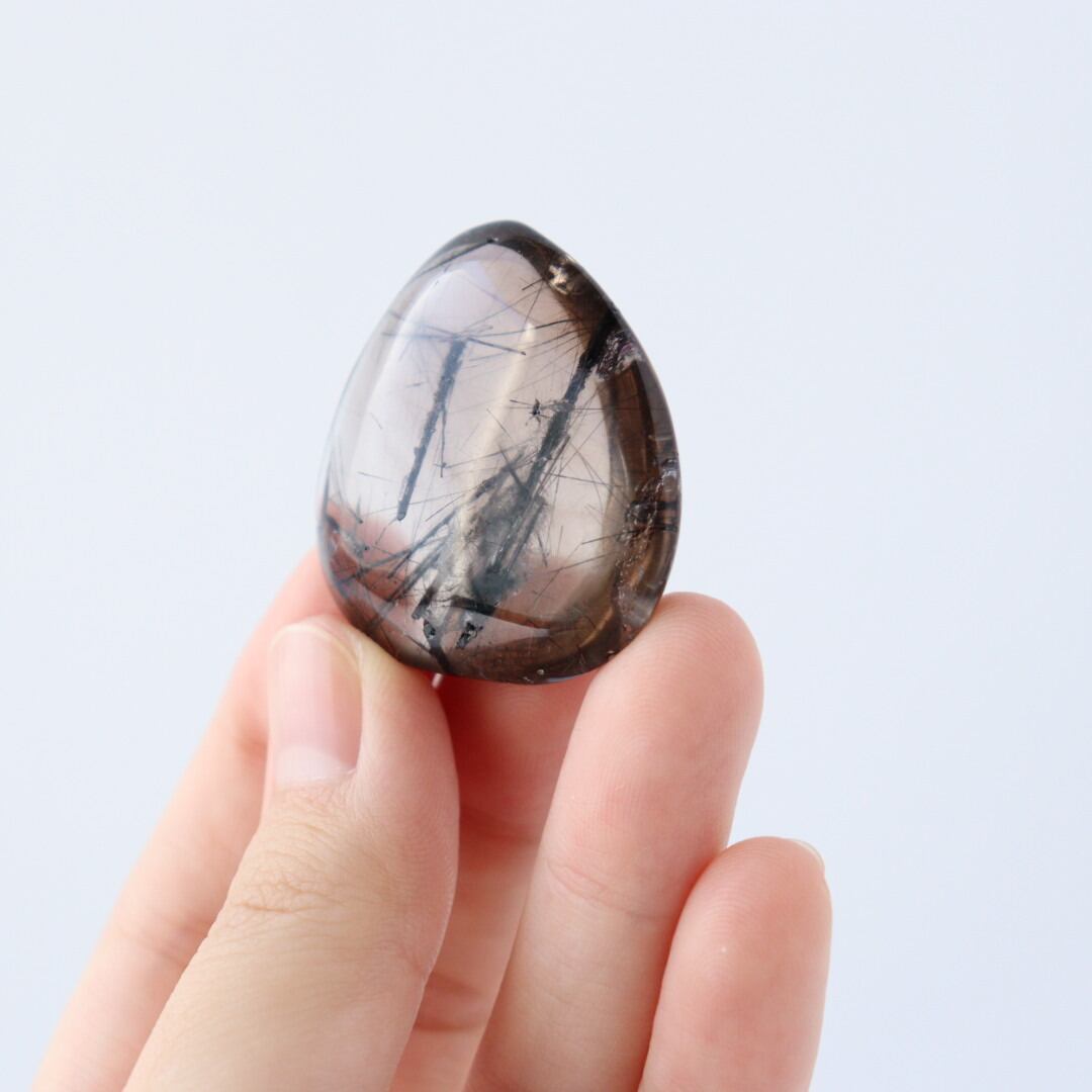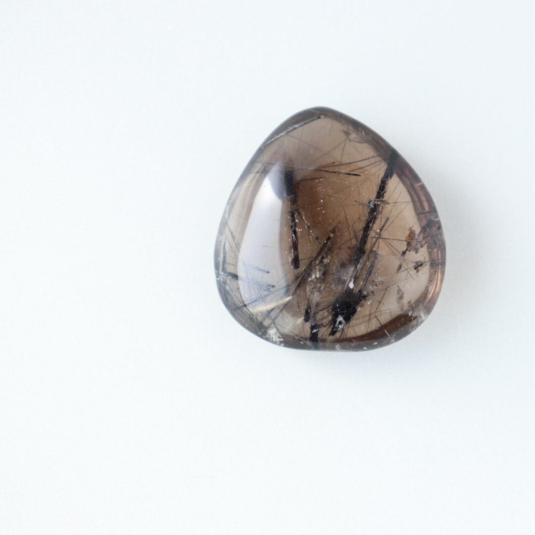 透明度の高いスモーキークォーツの中に、黒い線が自由に走る、ブラックルチルインスモーキークォーツのドロップシェイプ。