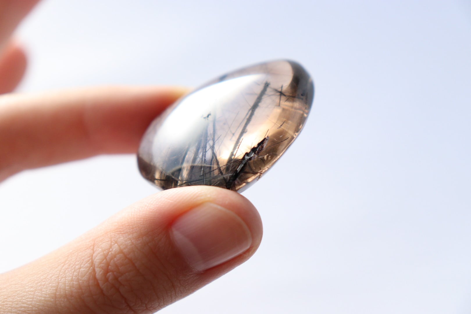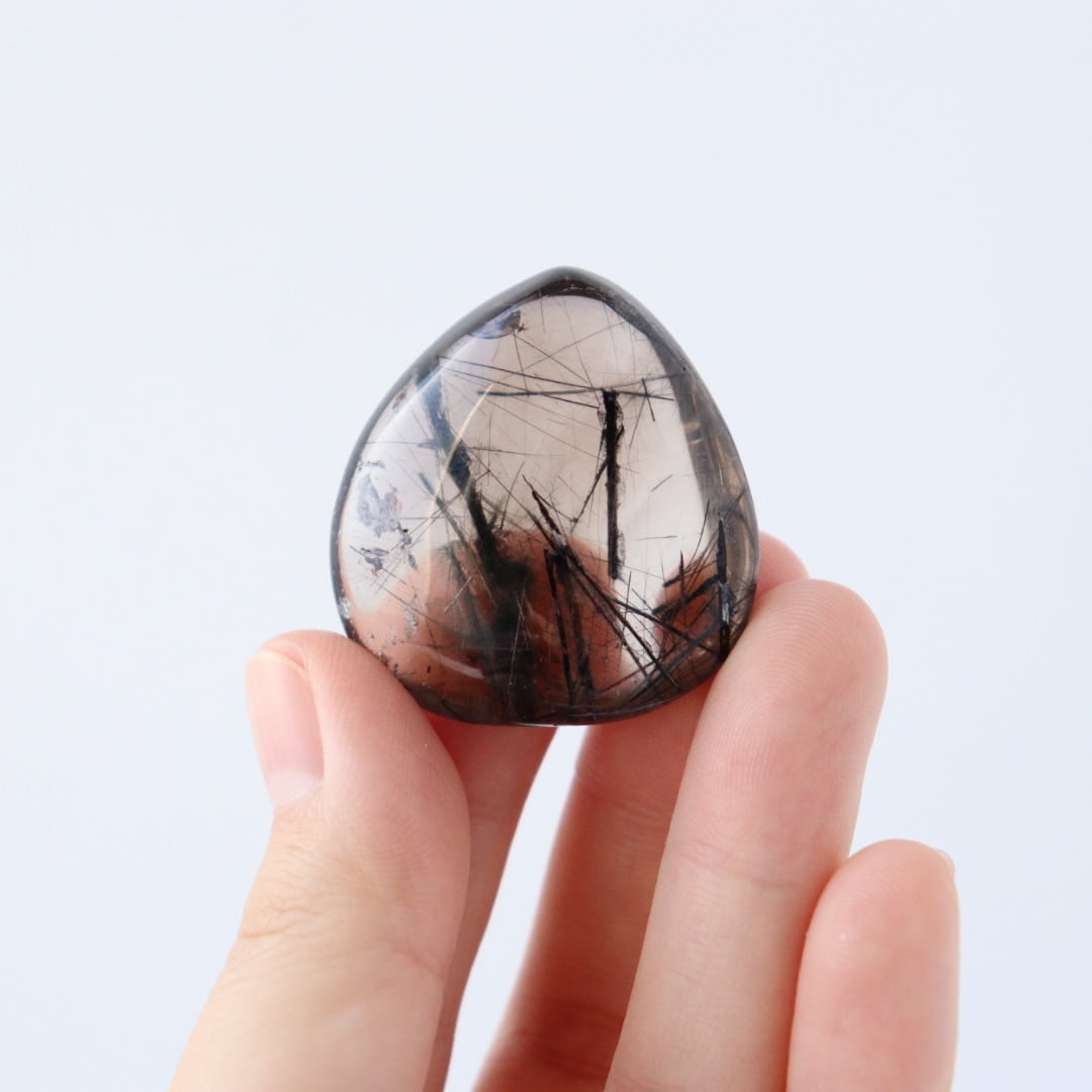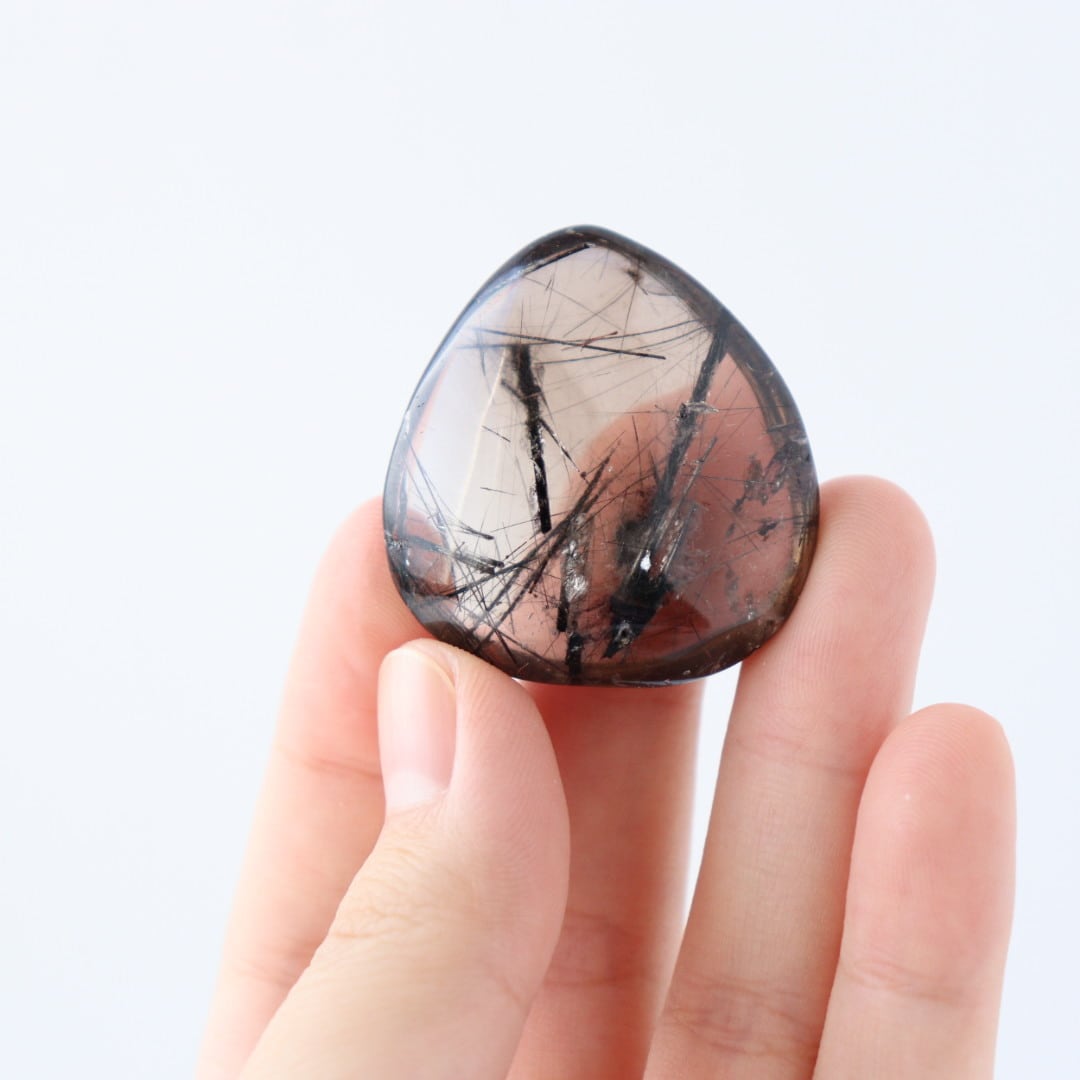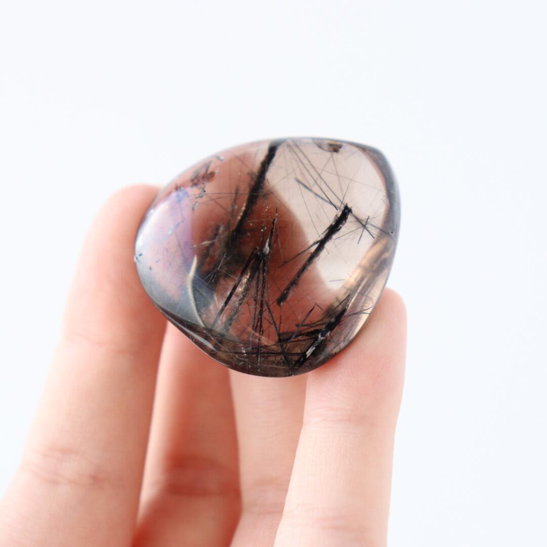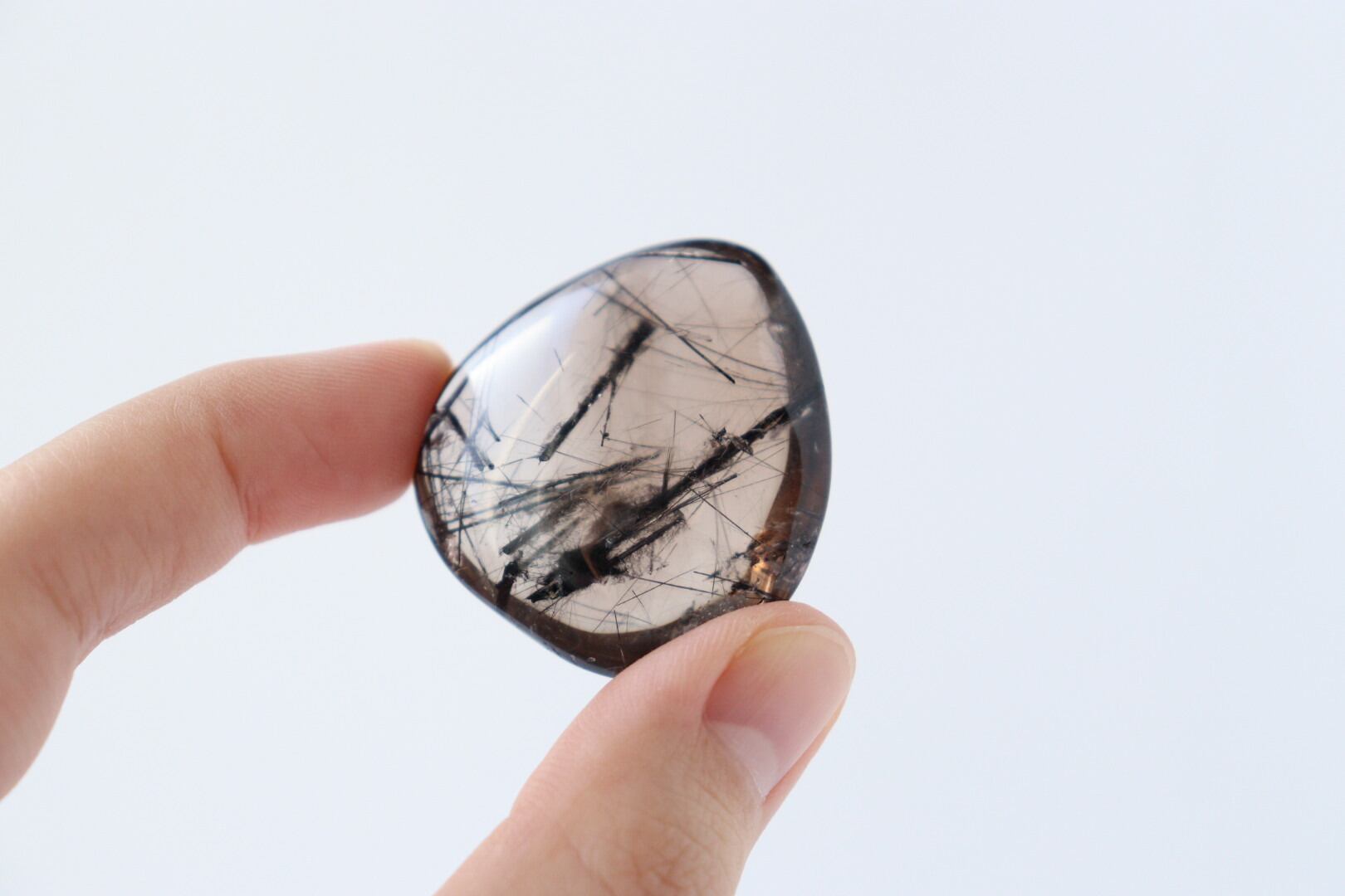 ブラックルチル・イン・クォーツは、水晶の成長過程でルチル(金紅石)を内包したもの。スモーキー・クォーツと共生することで、全体に落ち着いたトーンと深みが生まれます。ブラックルチルは主にチタンを含む鉱物で、線の太さや入り方には個体差があります。