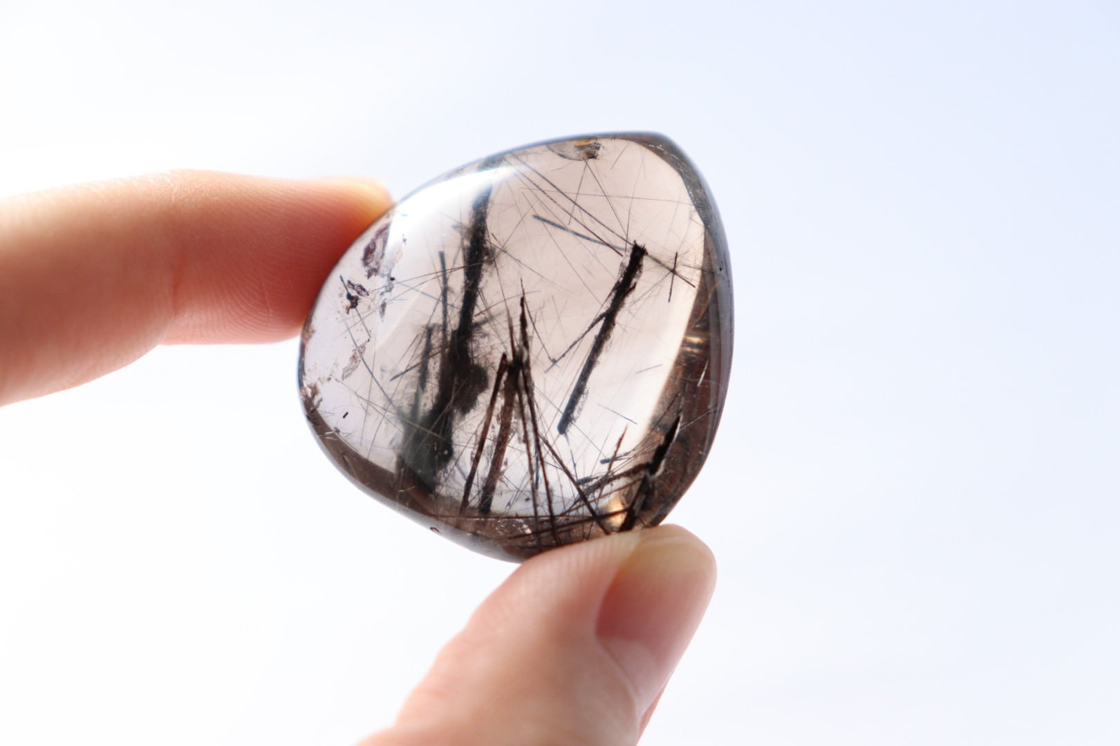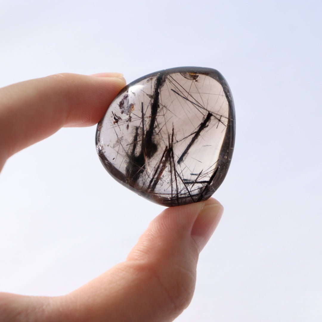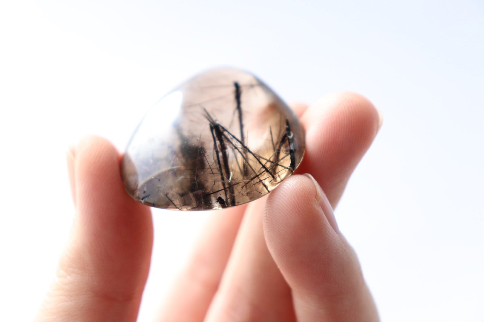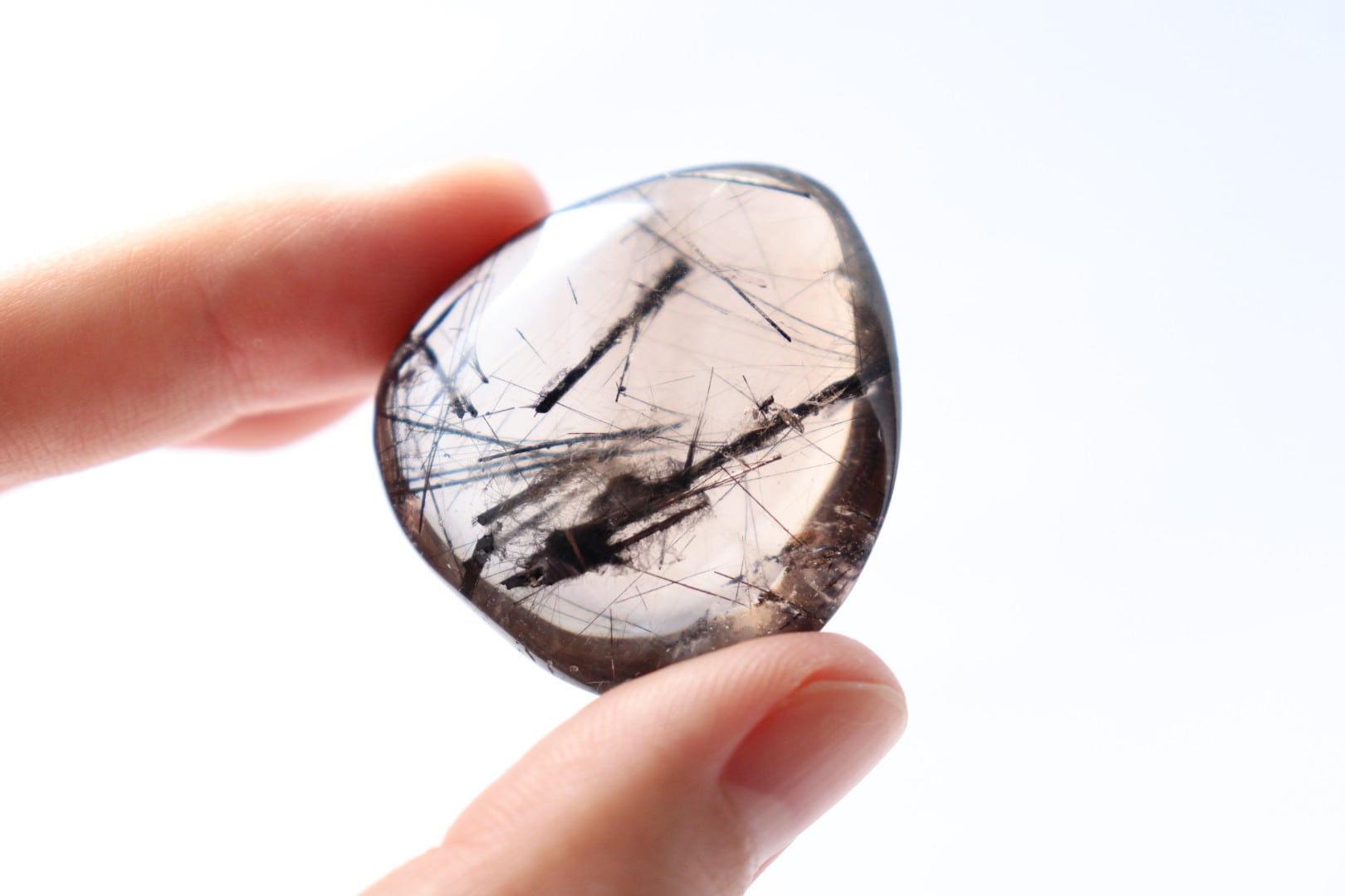 ブラックルチル・イン・クォーツは、水晶の成長過程でルチル(金紅石)を内包したもの。スモーキー・クォーツと共生することで、全体に落ち着いたトーンと深みが生まれます。ブラックルチルは主にチタンを含む鉱物で、線の太さや入り方には個体差があります。