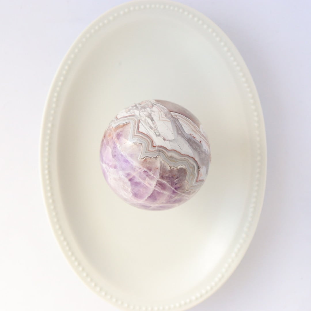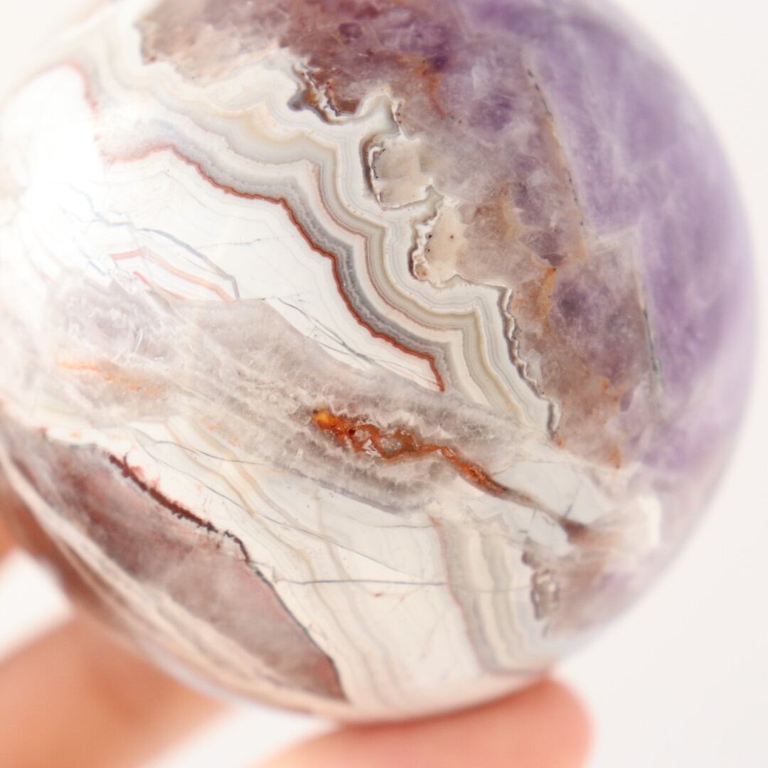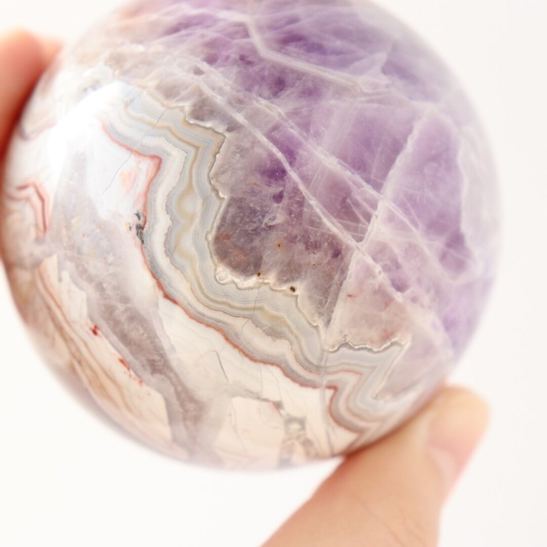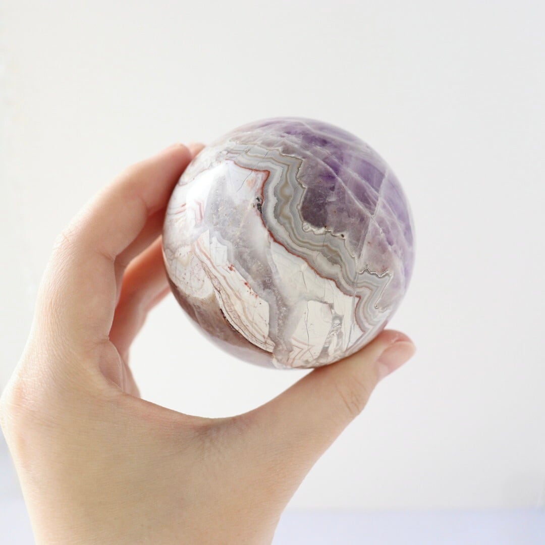 やさしいパープルとホワイトが溶け合う、華やかな美しさをもつアメジストアゲートのスフィア。