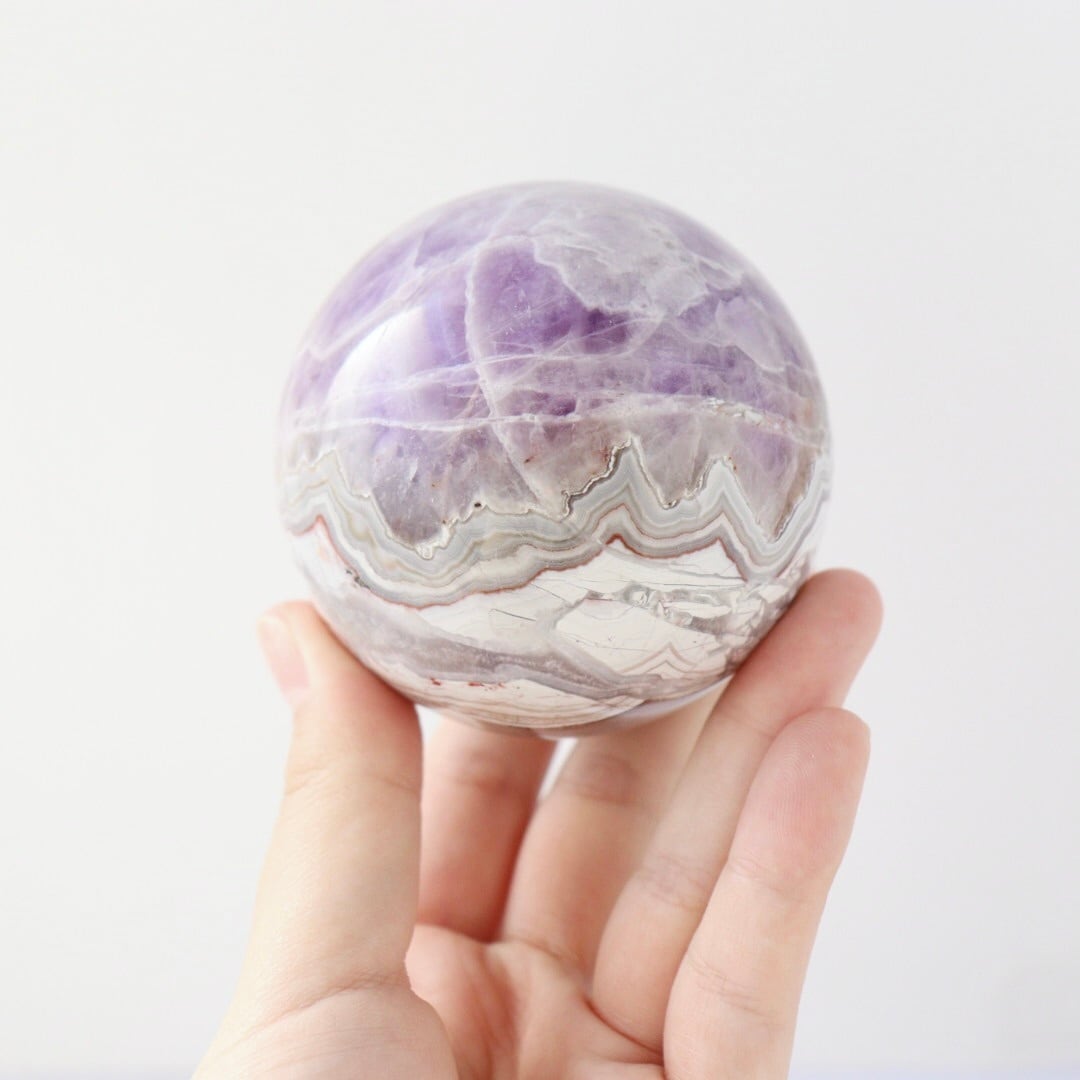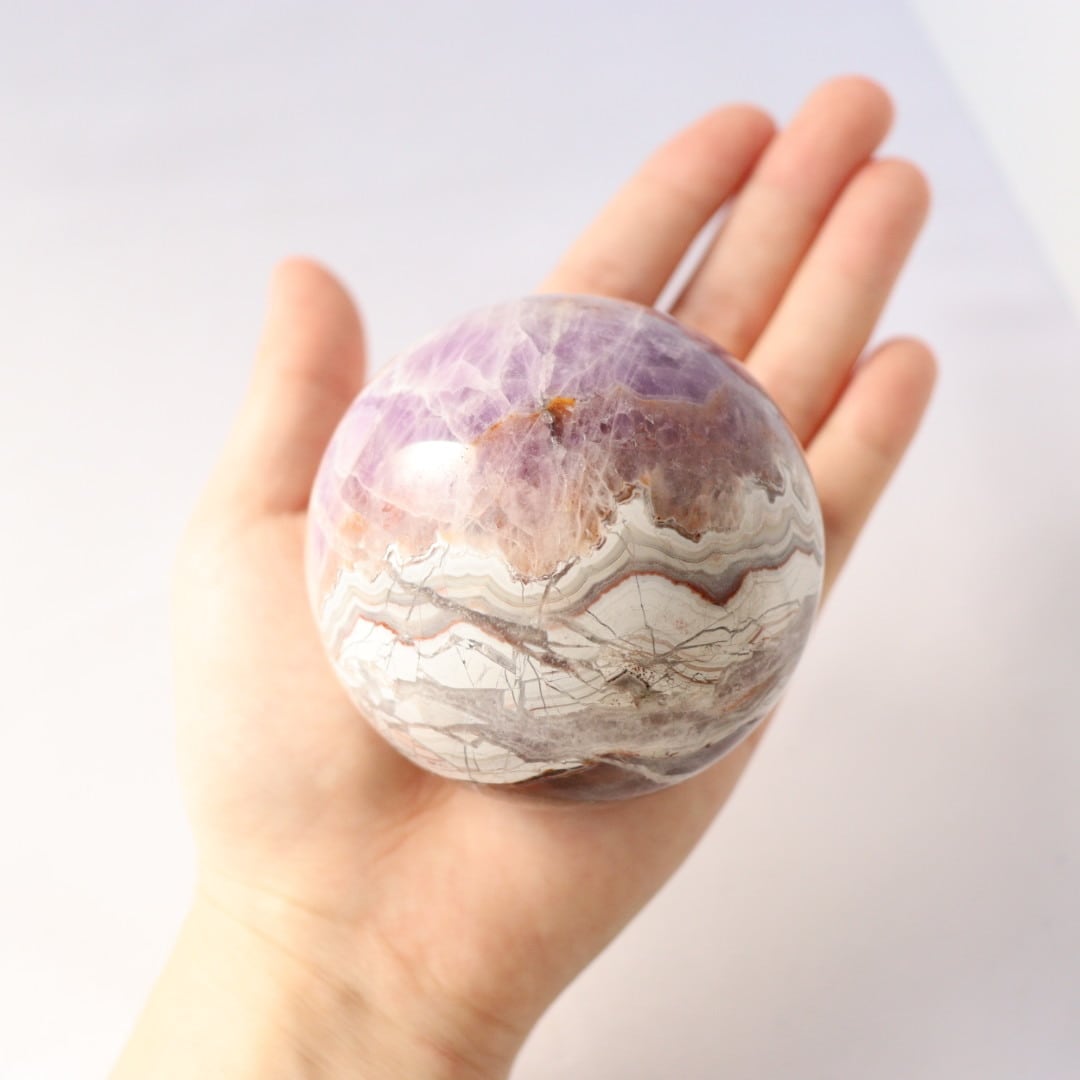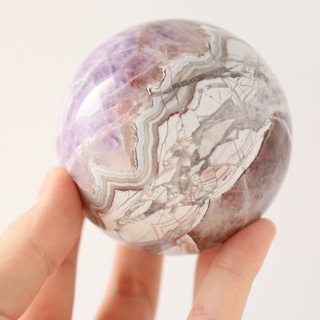 やさしいパープルとホワイトが溶け合う、華やかな美しさをもつアメジストアゲートのスフィア。