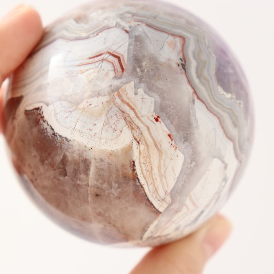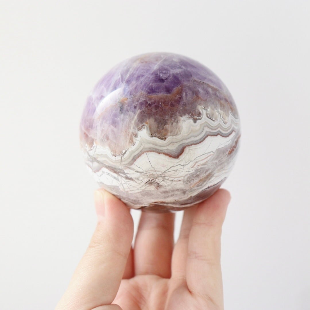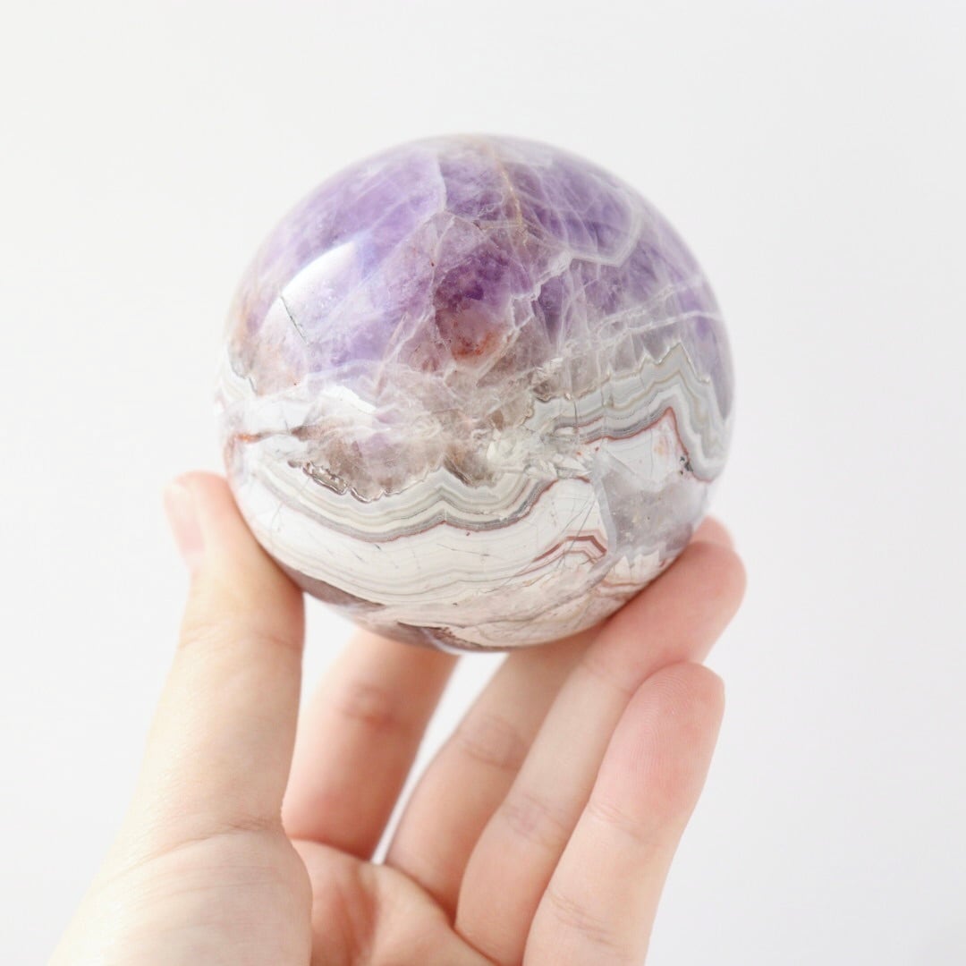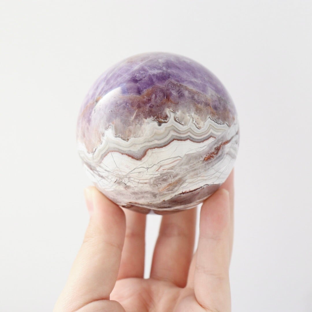 やさしいパープルとホワイトが溶け合う、華やかな美しさをもつアメジストアゲートのスフィア。