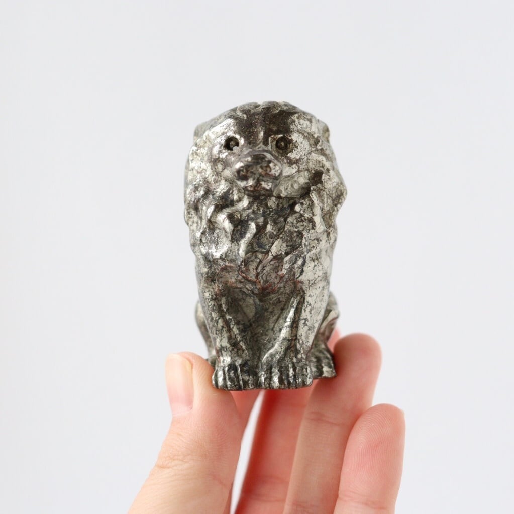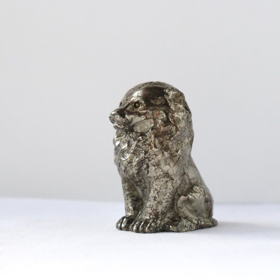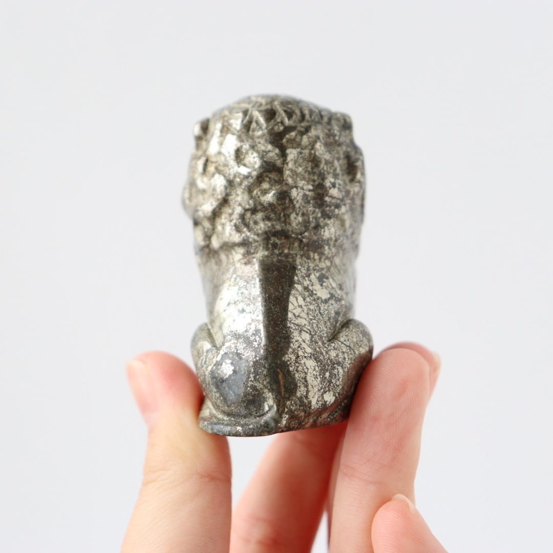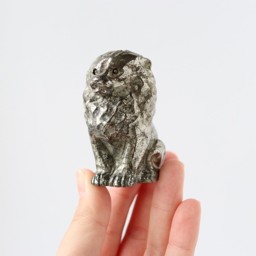 こちらは、パイライトならではのずっしりとした質感と、穏やかに光を反射する表面が美しいカービング。細部まで磨き込まれた造形は、ライオンの静かな威厳と優しさを同時に表現しており、空間に置くと落ち着いた存在感を放ちます。
