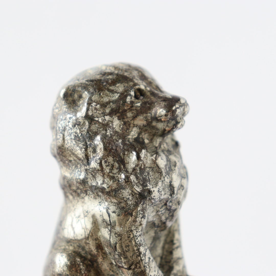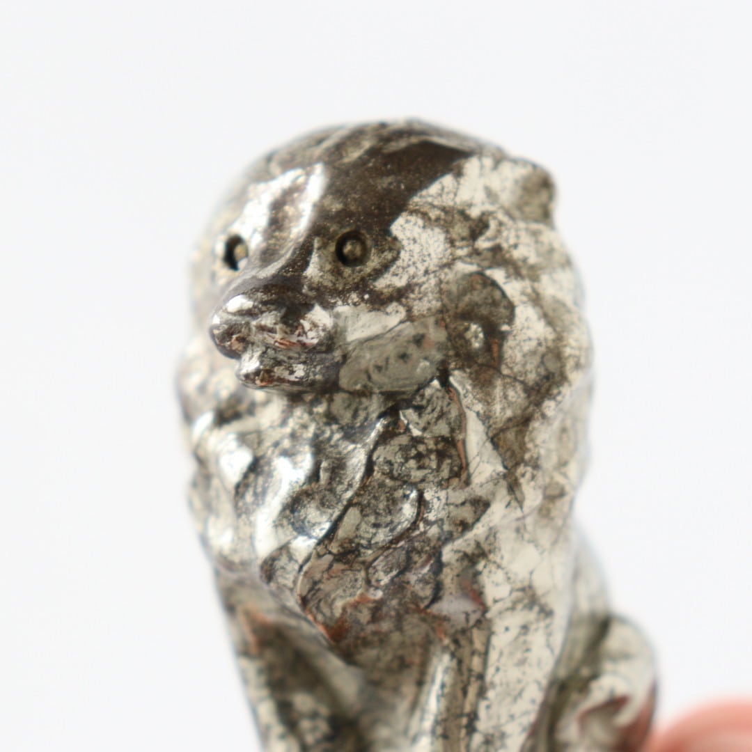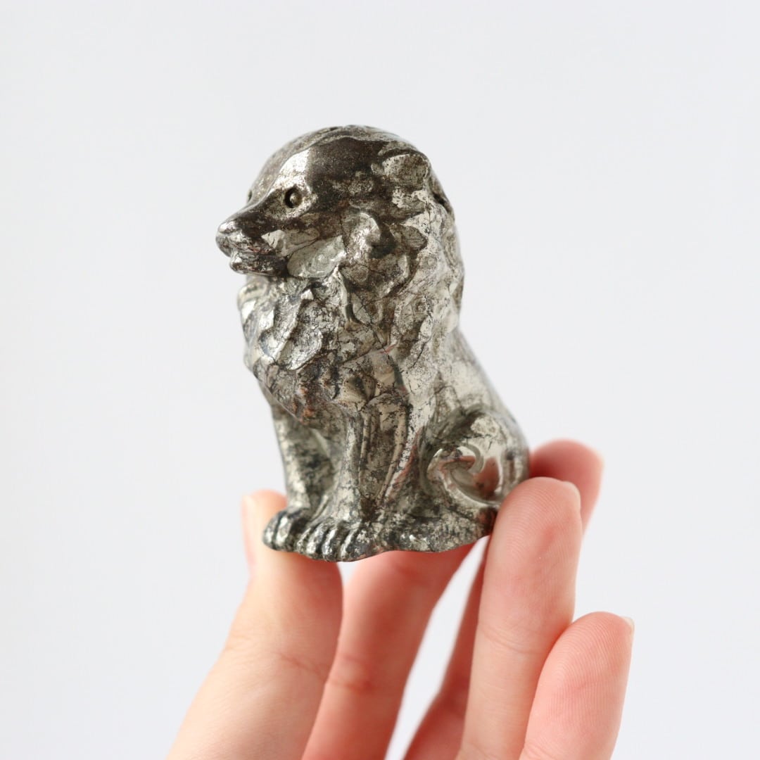 こちらは、パイライトならではのずっしりとした質感と、穏やかに光を反射する表面が美しいカービング。細部まで磨き込まれた造形は、ライオンの静かな威厳と優しさを同時に表現しており、空間に置くと落ち着いた存在感を放ちます。
