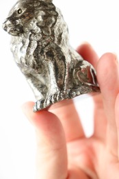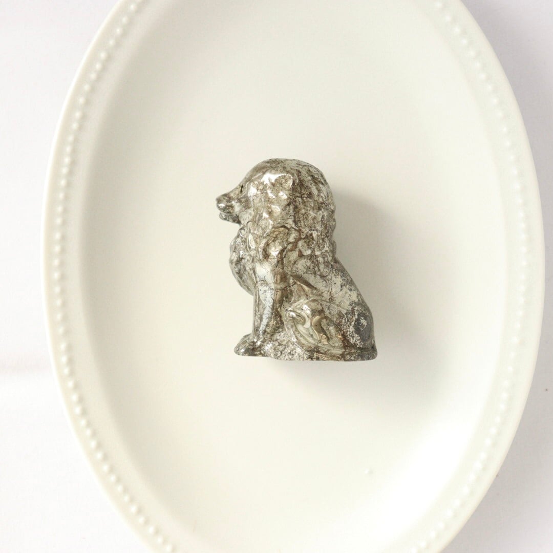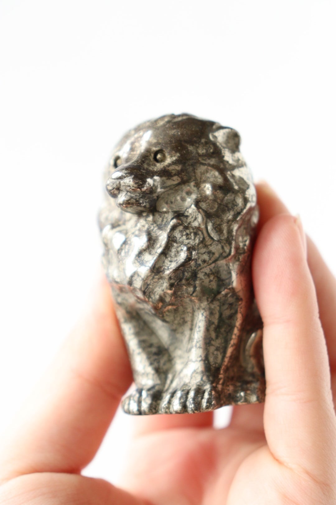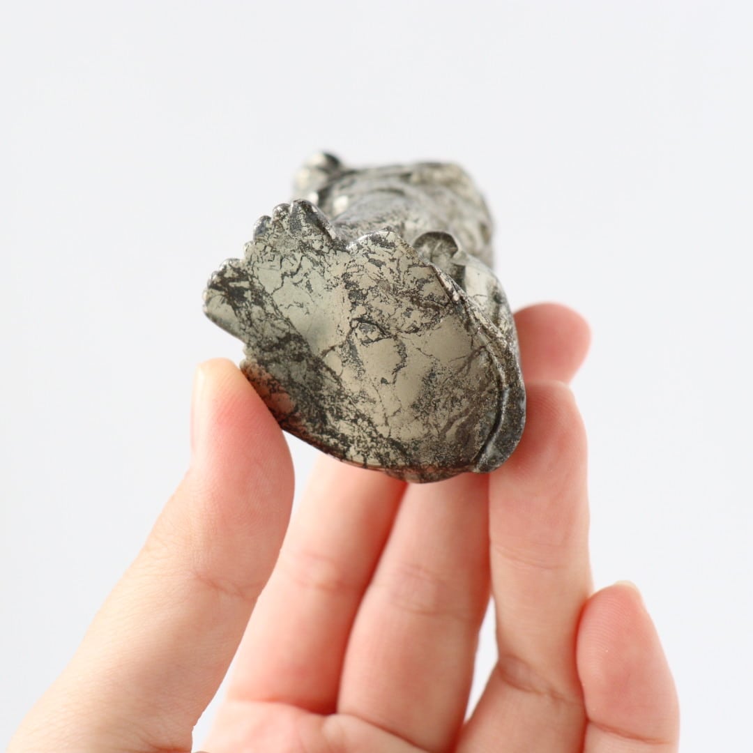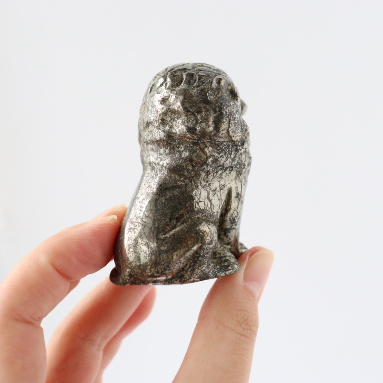 こちらは、パイライトならではのずっしりとした質感と、穏やかに光を反射する表面が美しいカービング。細部まで磨き込まれた造形は、ライオンの静かな威厳と優しさを同時に表現しており、空間に置くと落ち着いた存在感を放ちます。