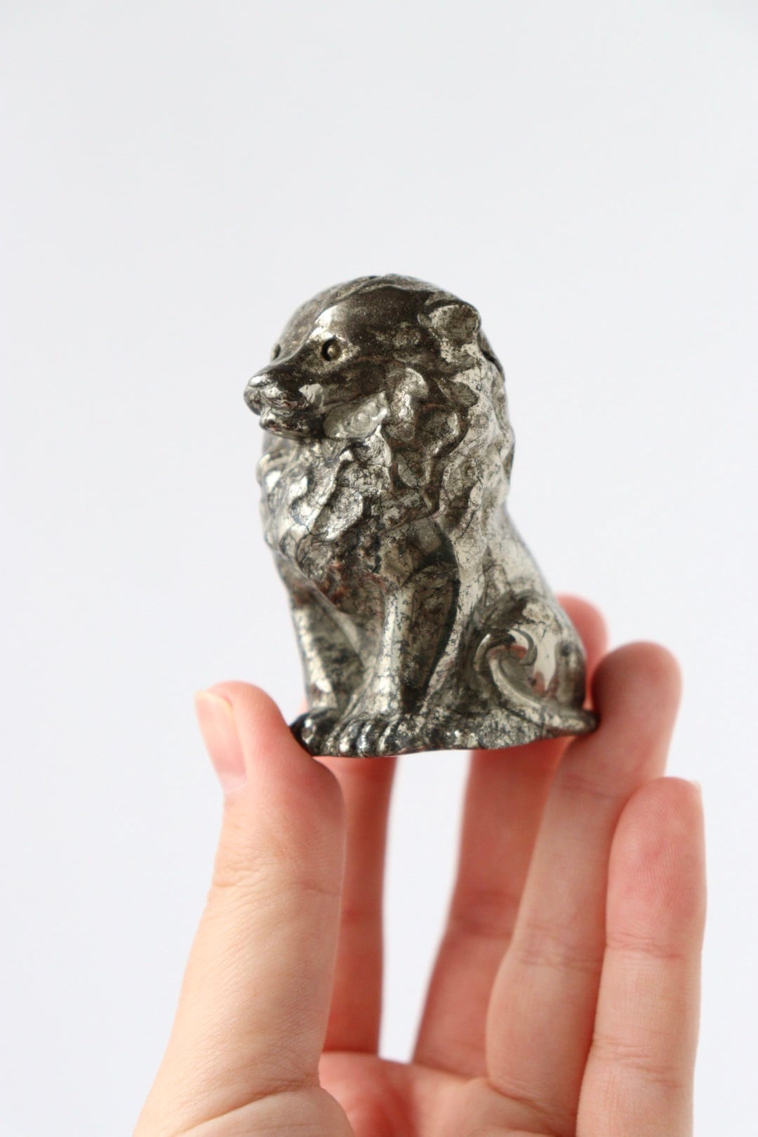 重厚な輝きをまとい、静かにこちらを見つめるパイライトのライオン。