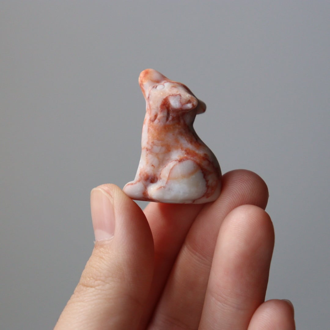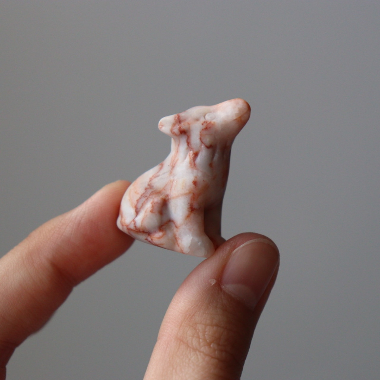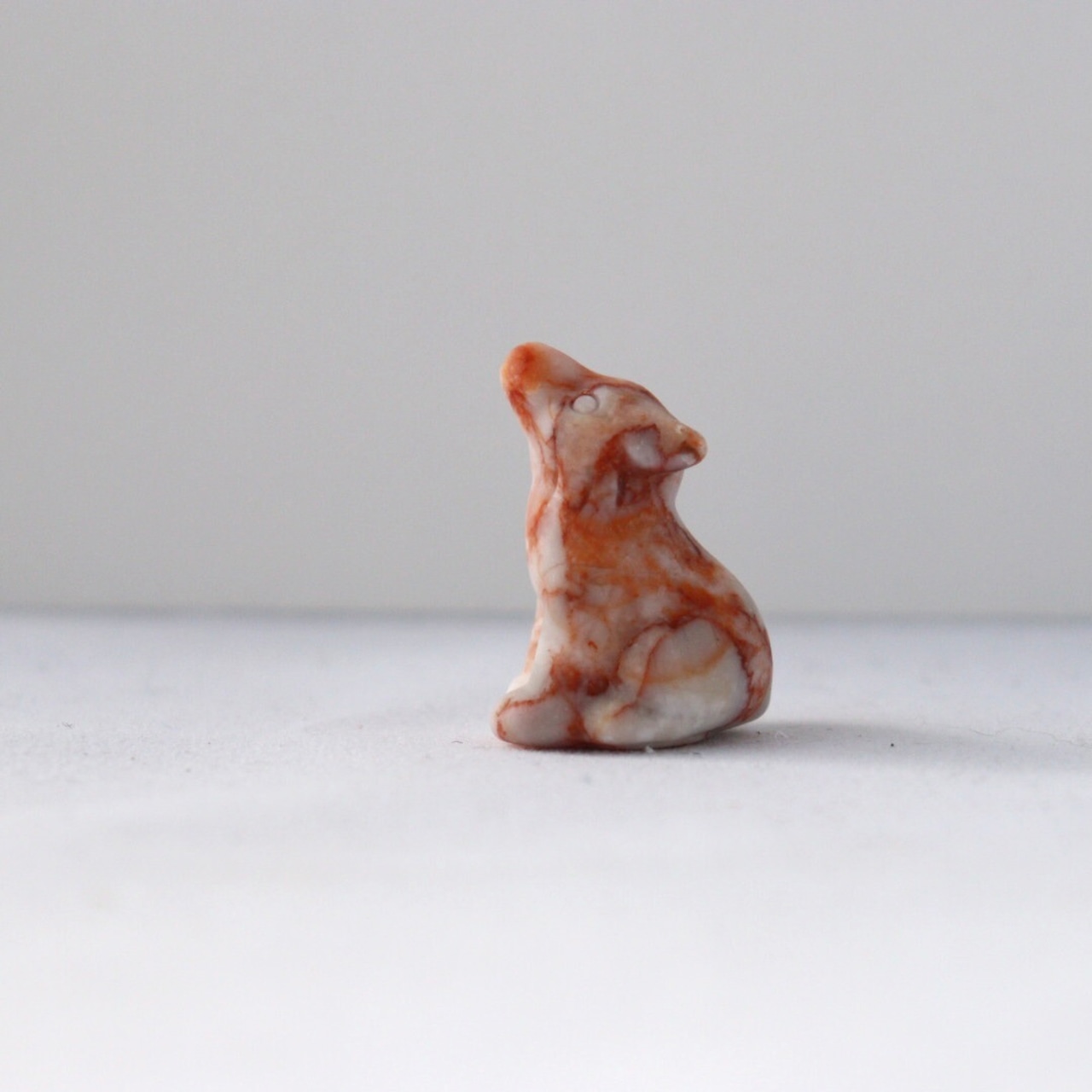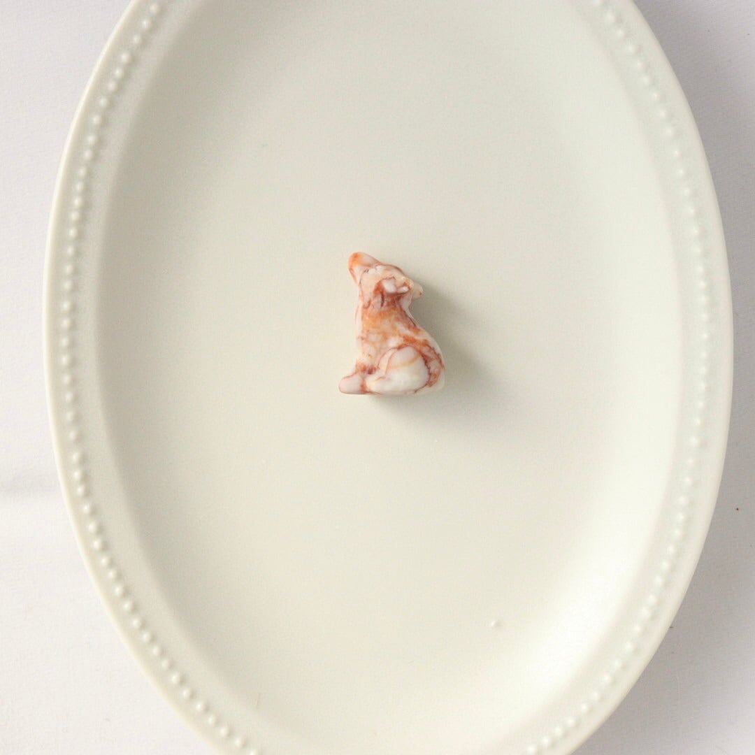 白地に赤い編み目状の模様が広がるレッドネットワークジャスパーのカービング。