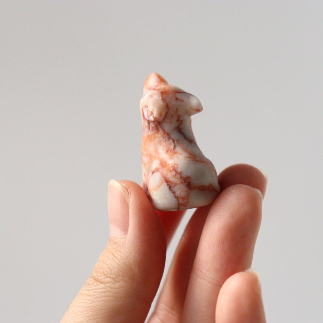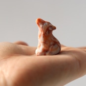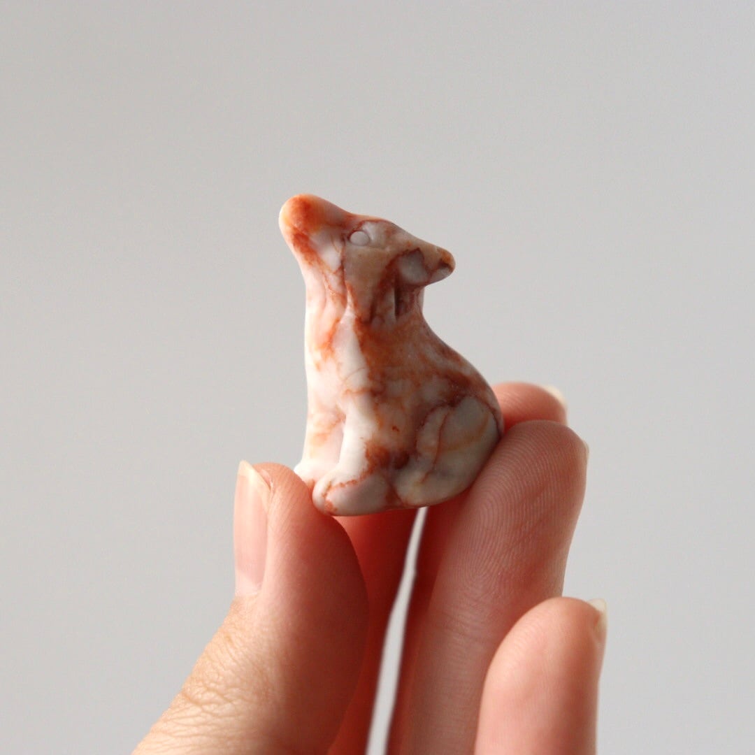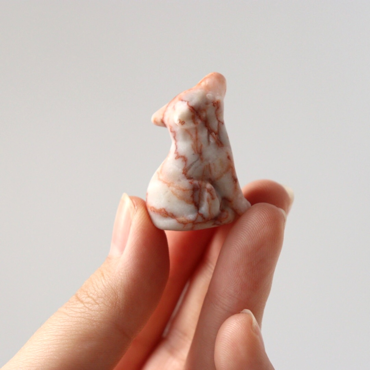 白地に赤い編み目状の模様が広がるレッドネットワークジャスパーのカービング。