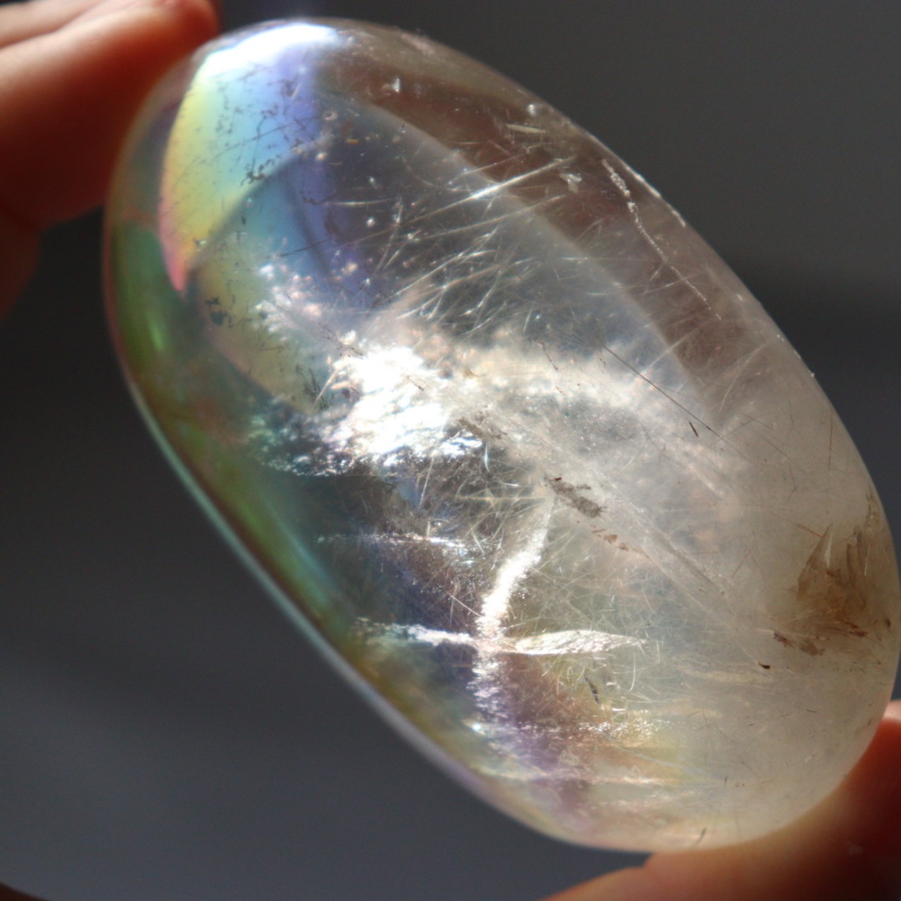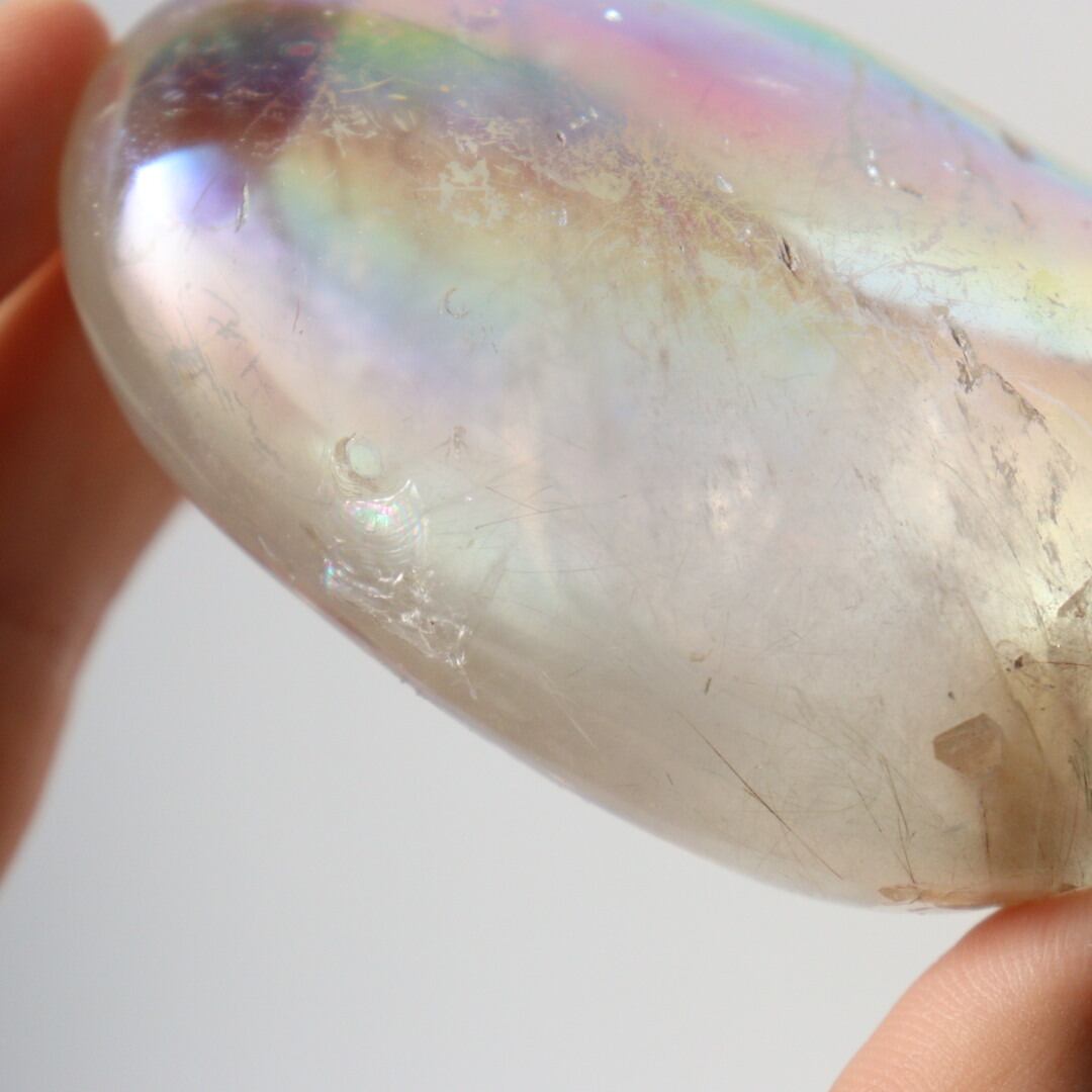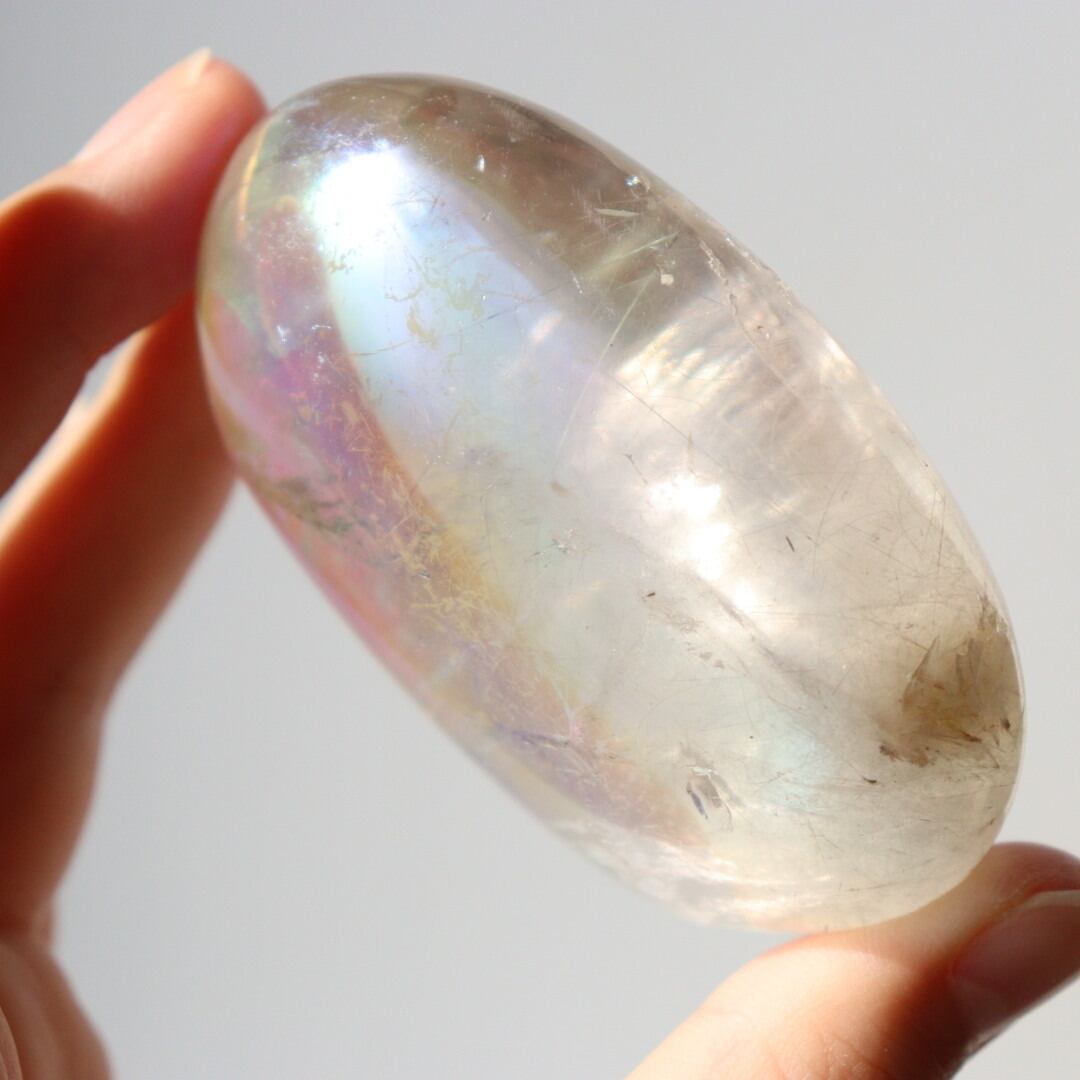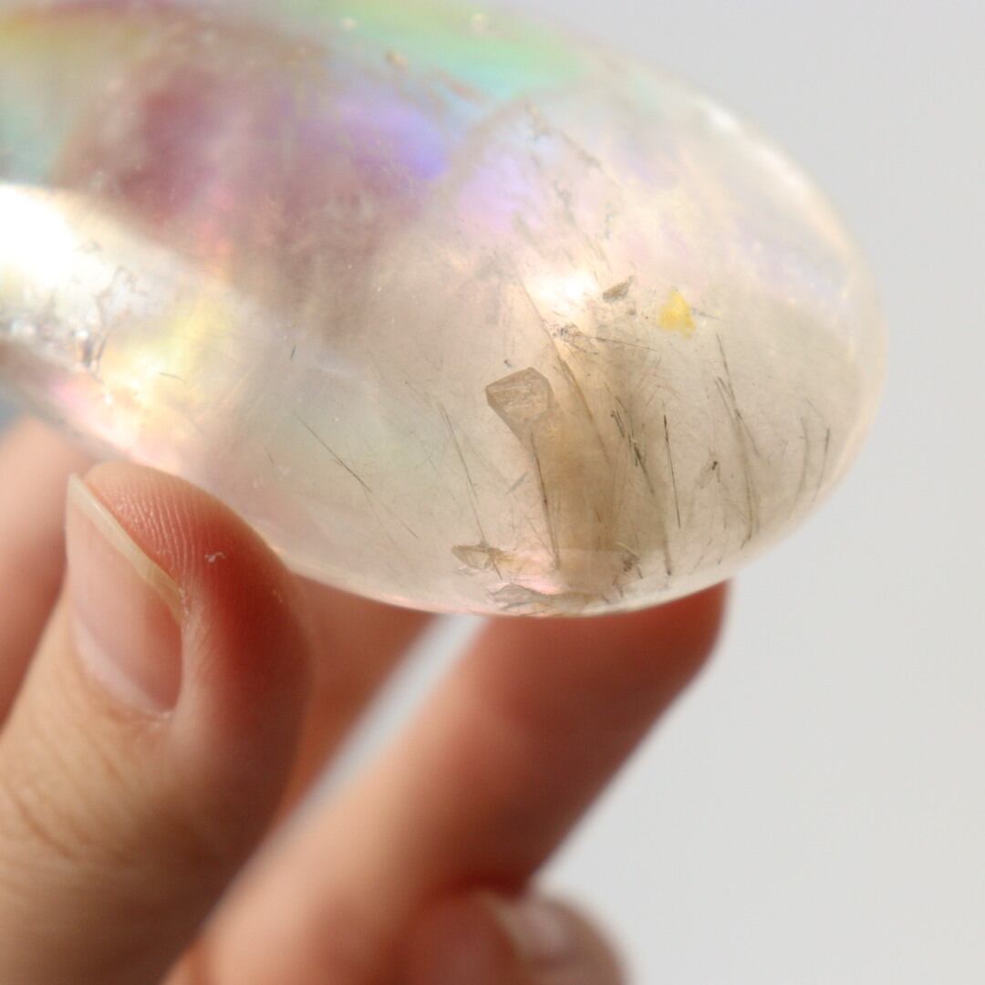 こちらは、大きめサイズのルチルインクォーツの握り石で。エンジェルオーラ加工によって、やわらかな光沢感が加えられています。
