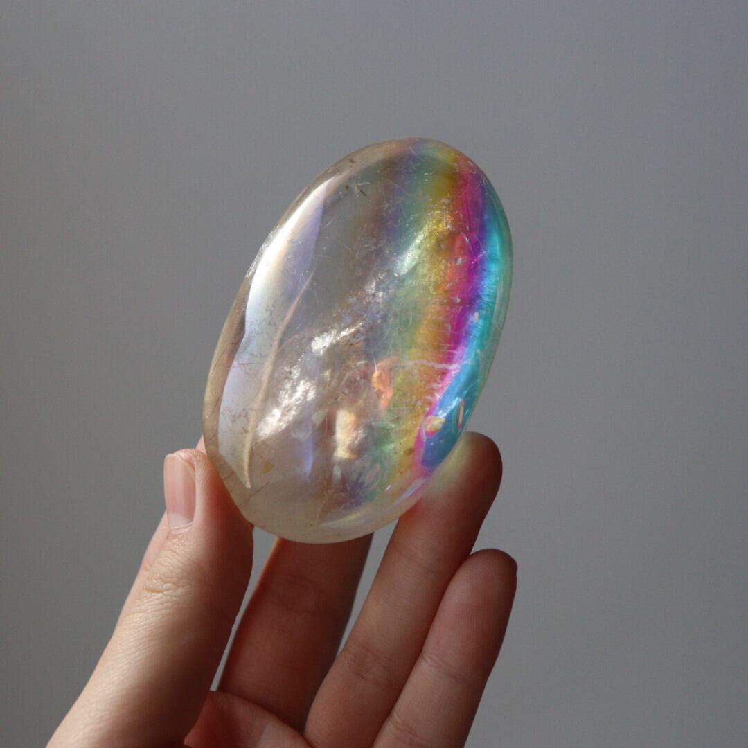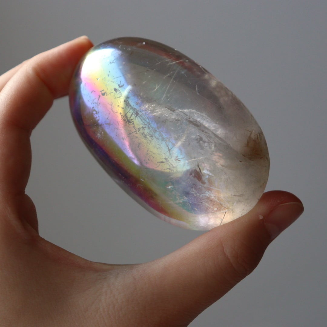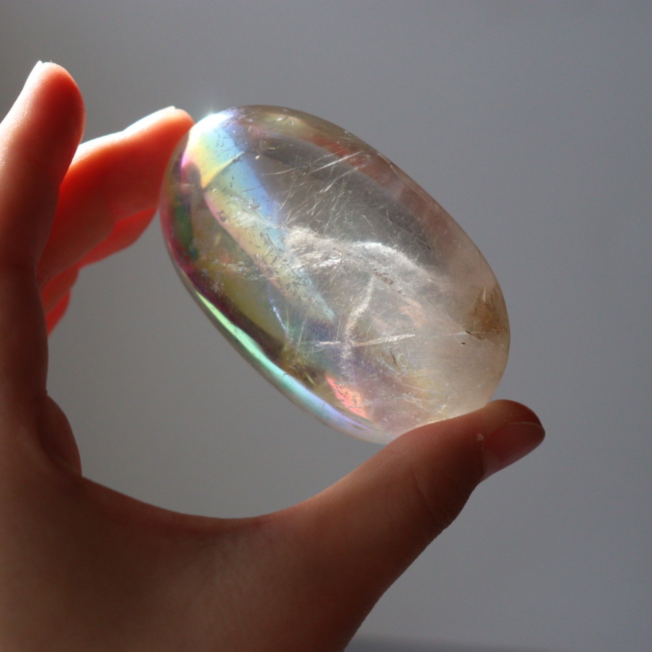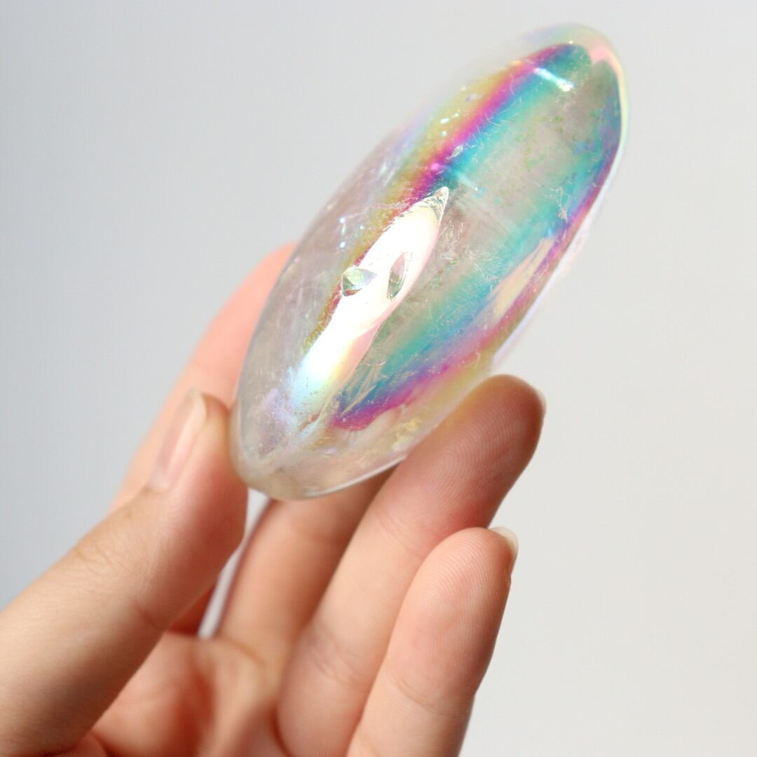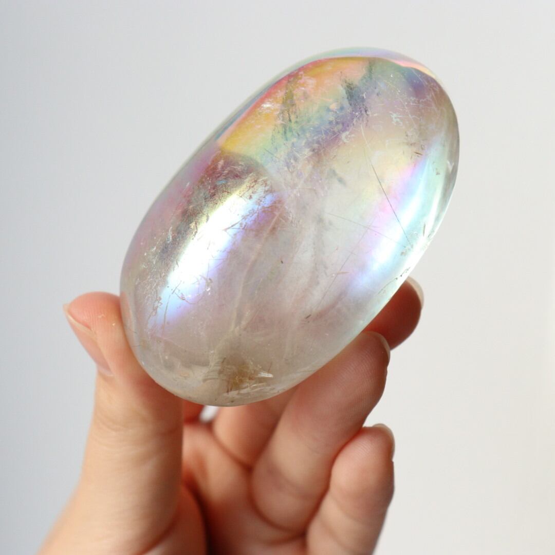 こちらは、大きめサイズのルチルインクォーツの握り石で。エンジェルオーラ加工によって、やわらかな光沢感が加えられています。
