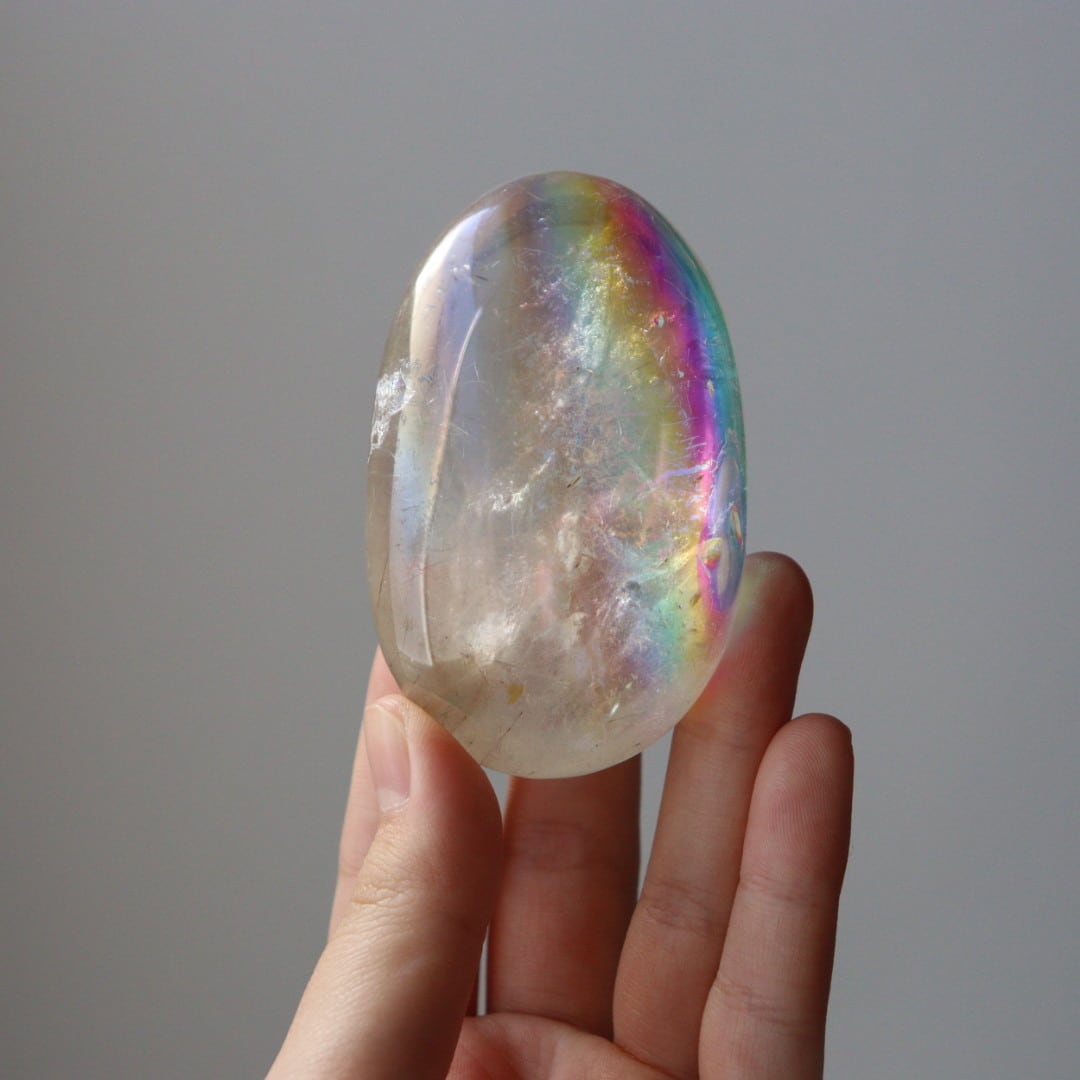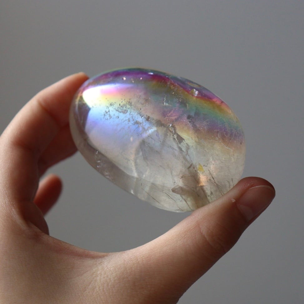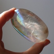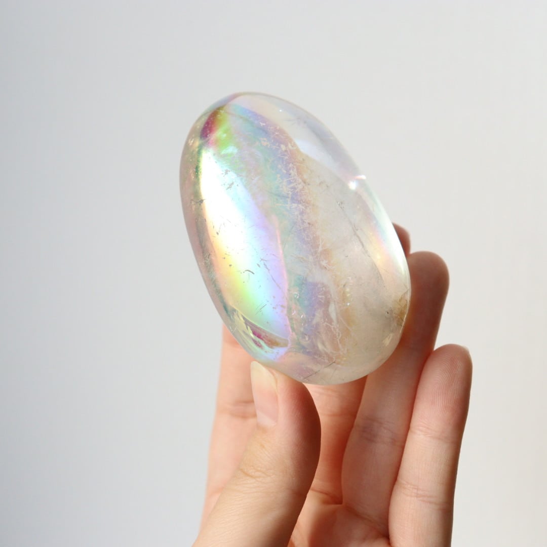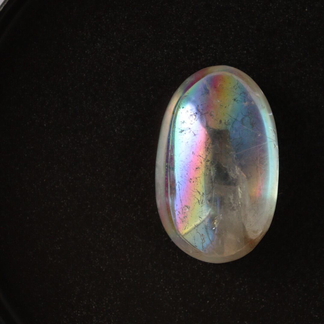こちらは、大きめサイズのルチルインクォーツの握り石で。エンジェルオーラ加工によって、やわらかな光沢感が加えられています。