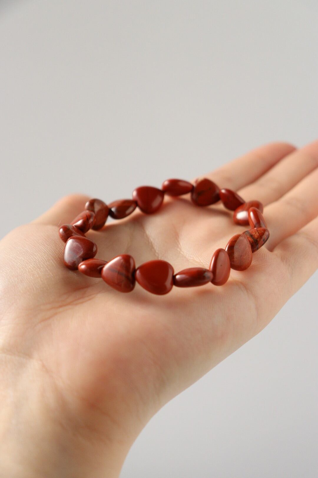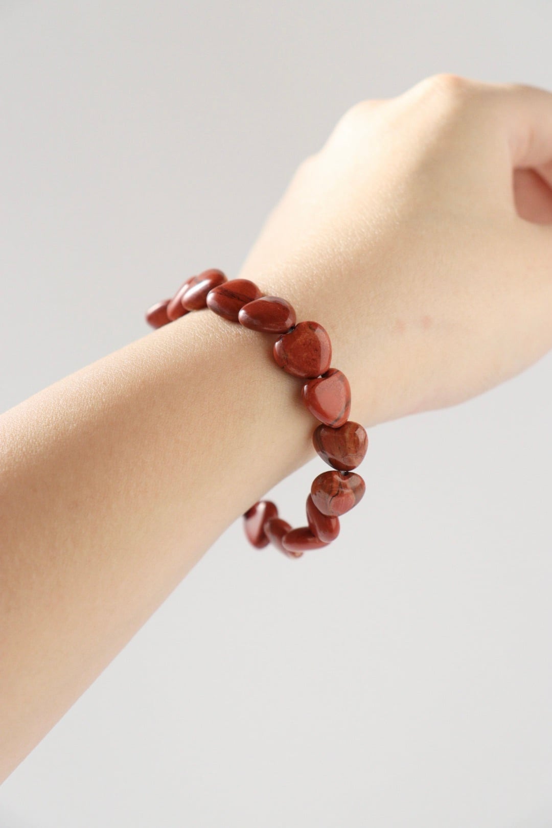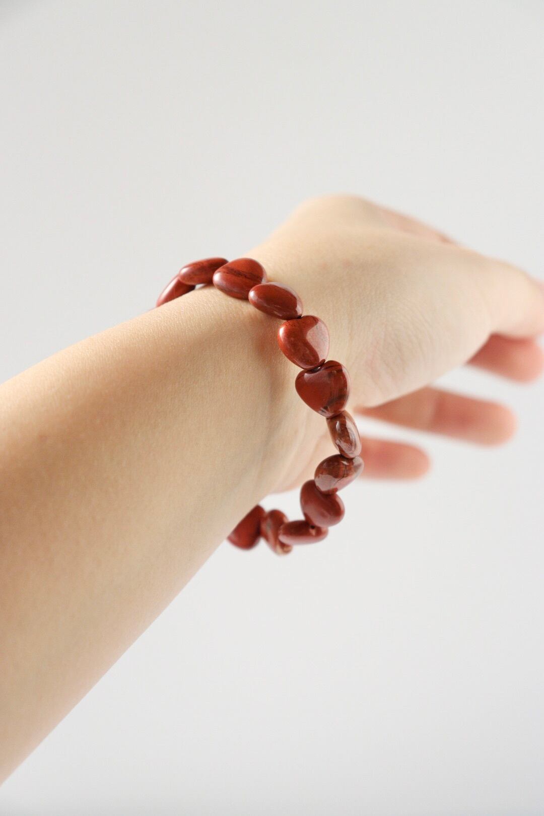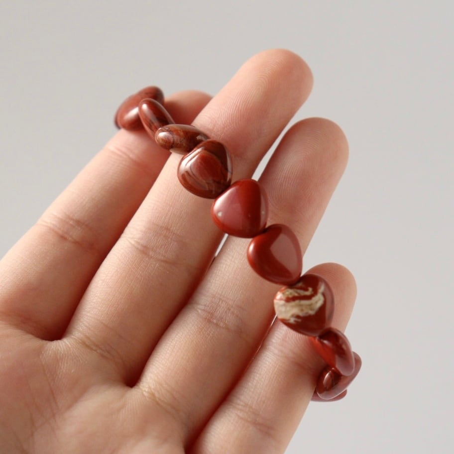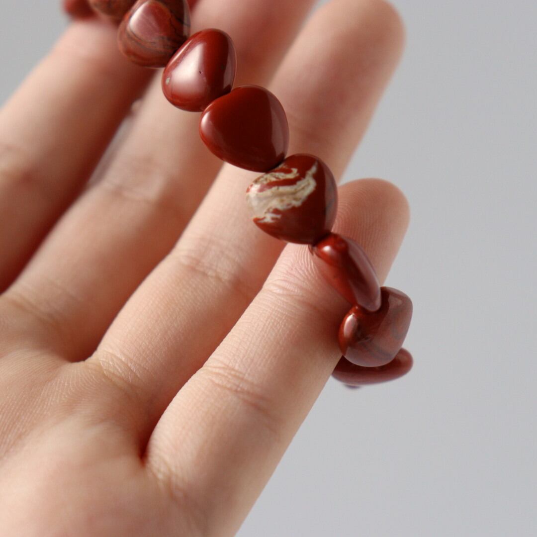 深みのある赤とマットな質感に大地のような落ち着きが宿る、レッドジャスパーのハートブレスレット。滑らかなハートの形が手元を優しく彩ります。