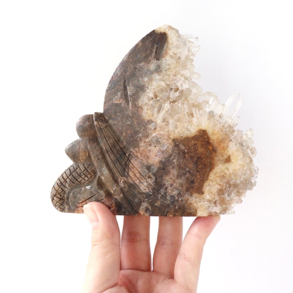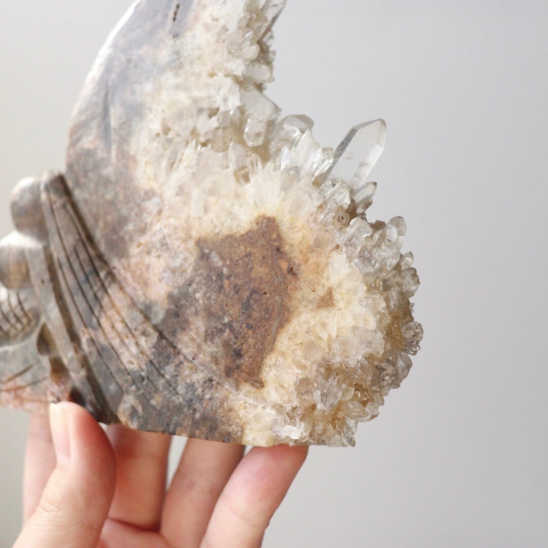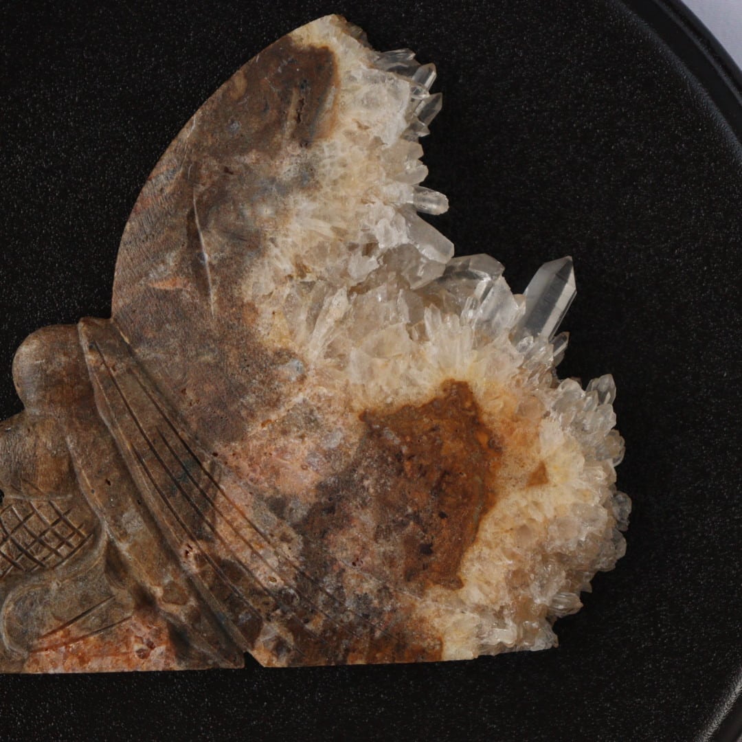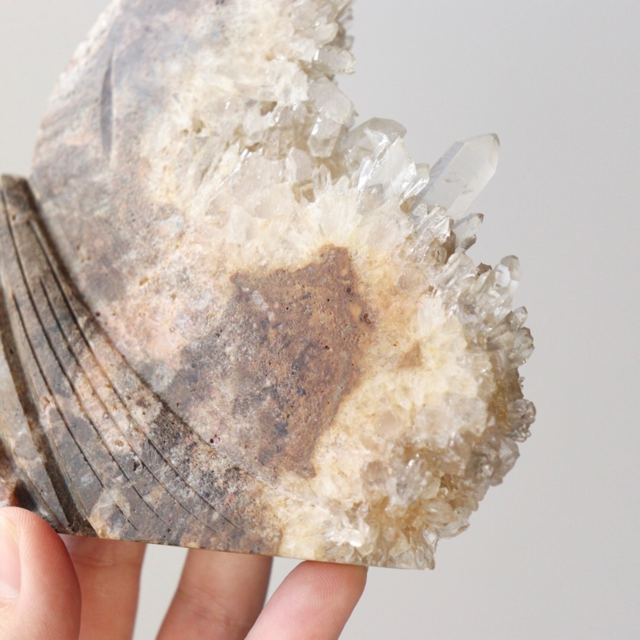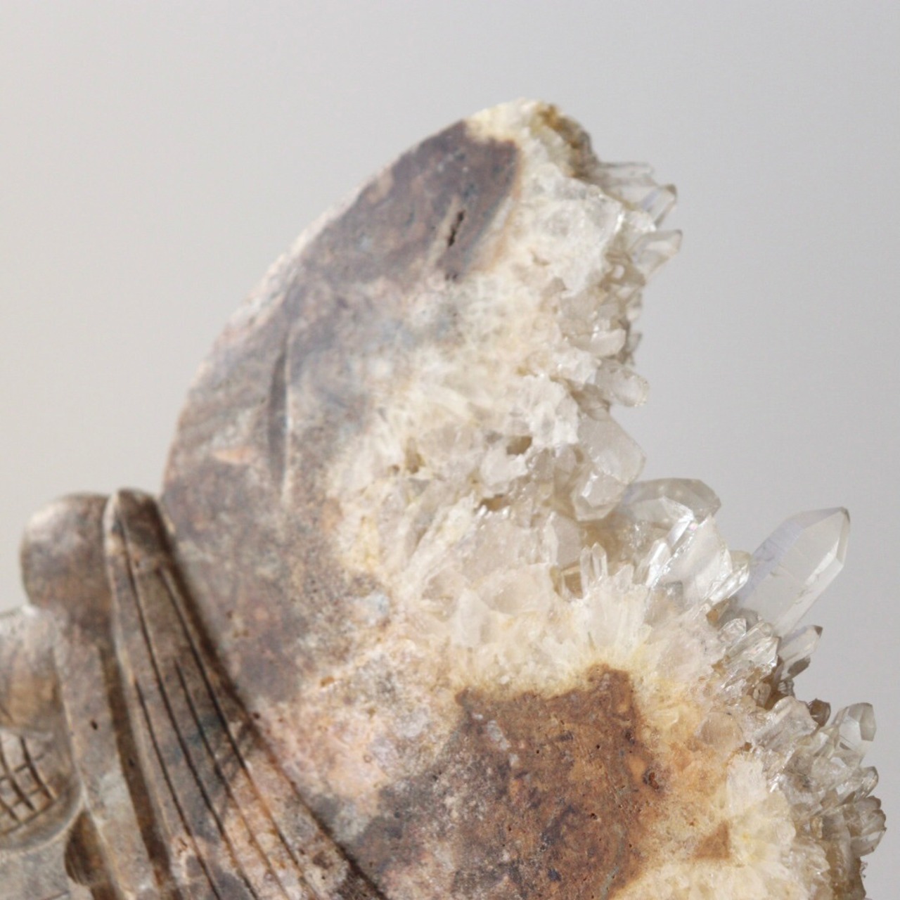 羽はクリアクォーツとブラウンの母岩によって形づくられ、羽の先端にあたる部分がクォーツクラスターとなっています。クラスター部分には、細やかなクォーツの結晶がびっしりと群晶し、透明感のある結晶も美しく並んでいます。
