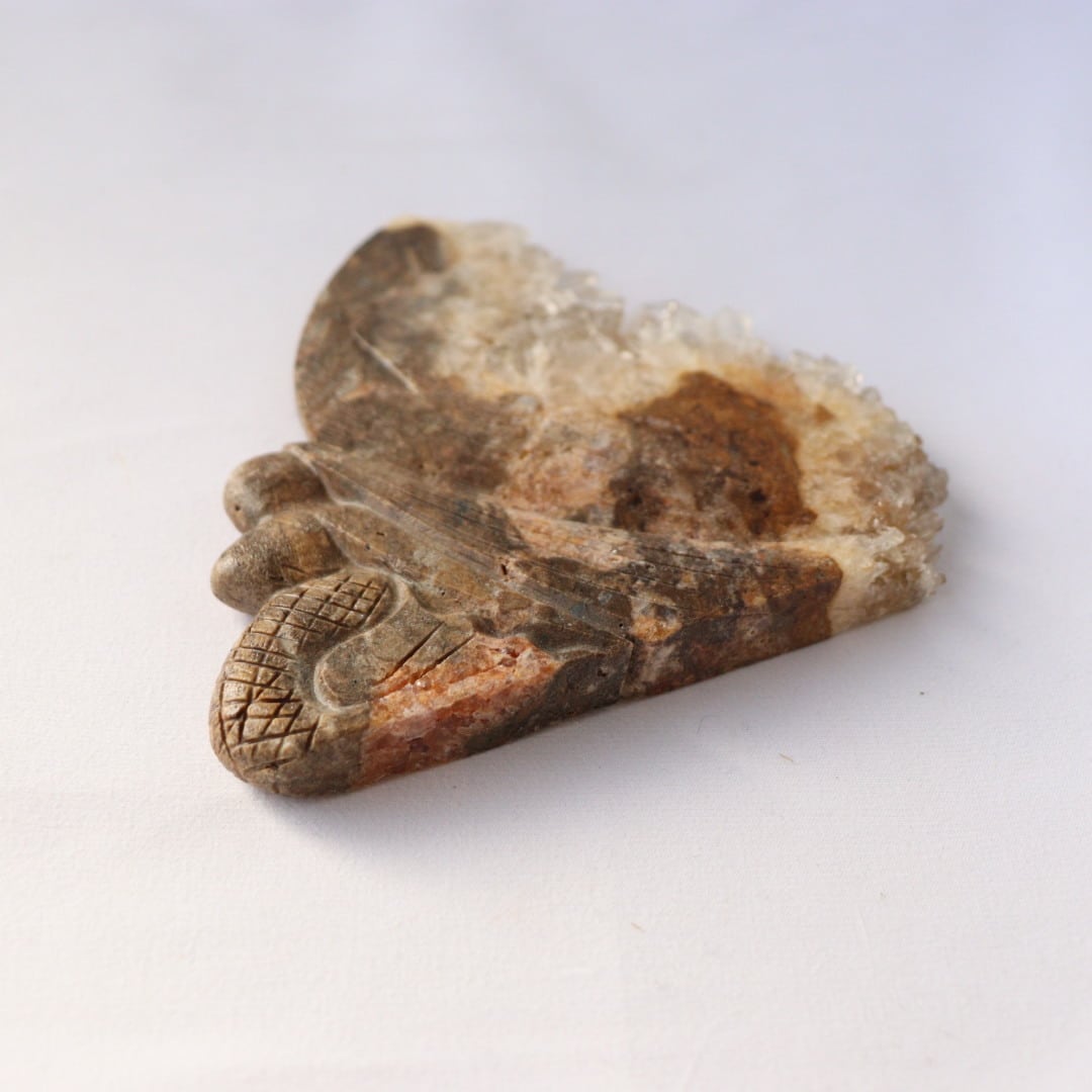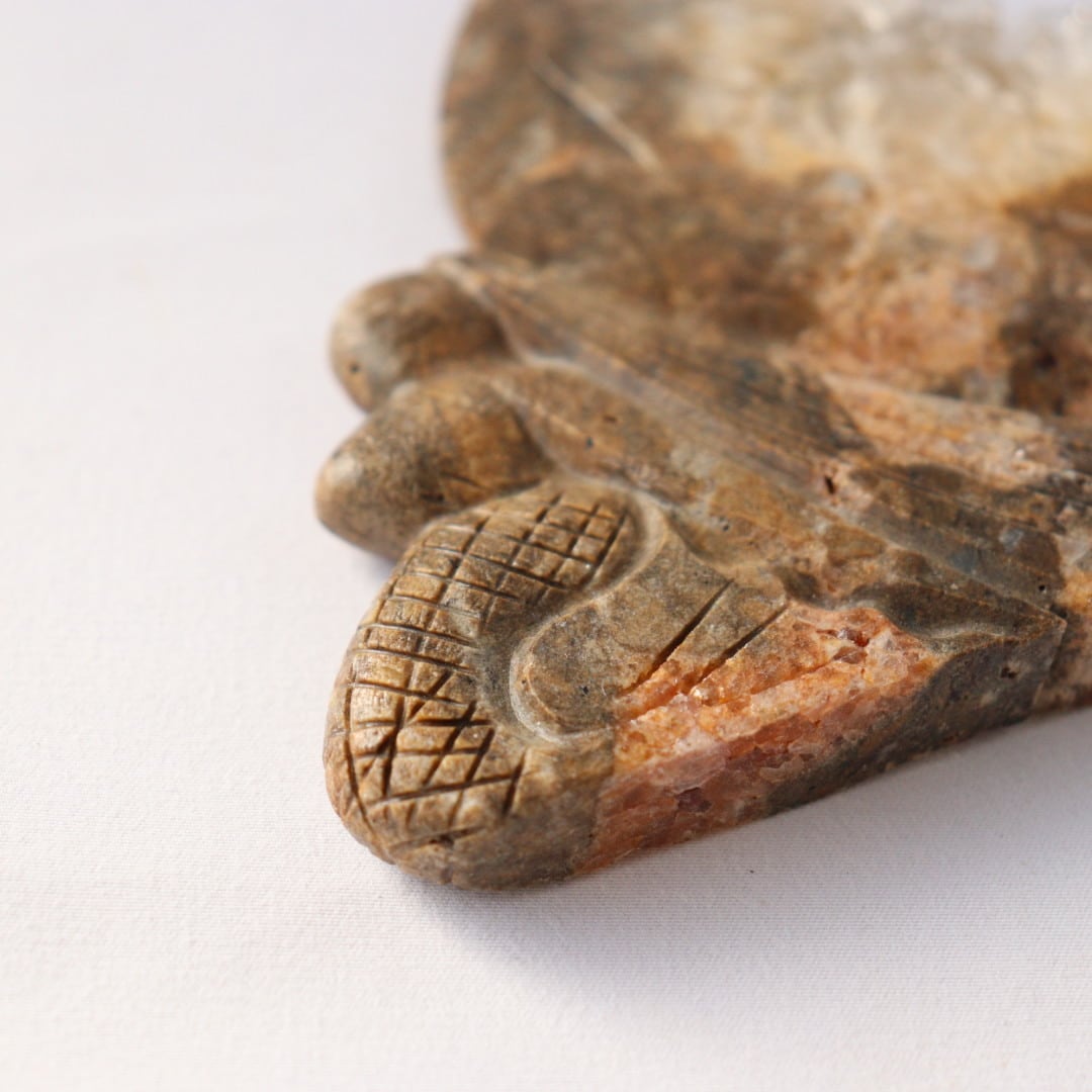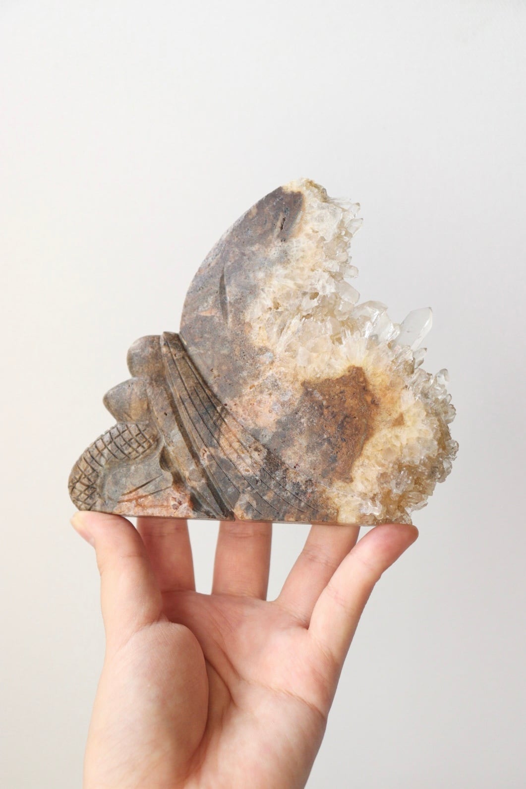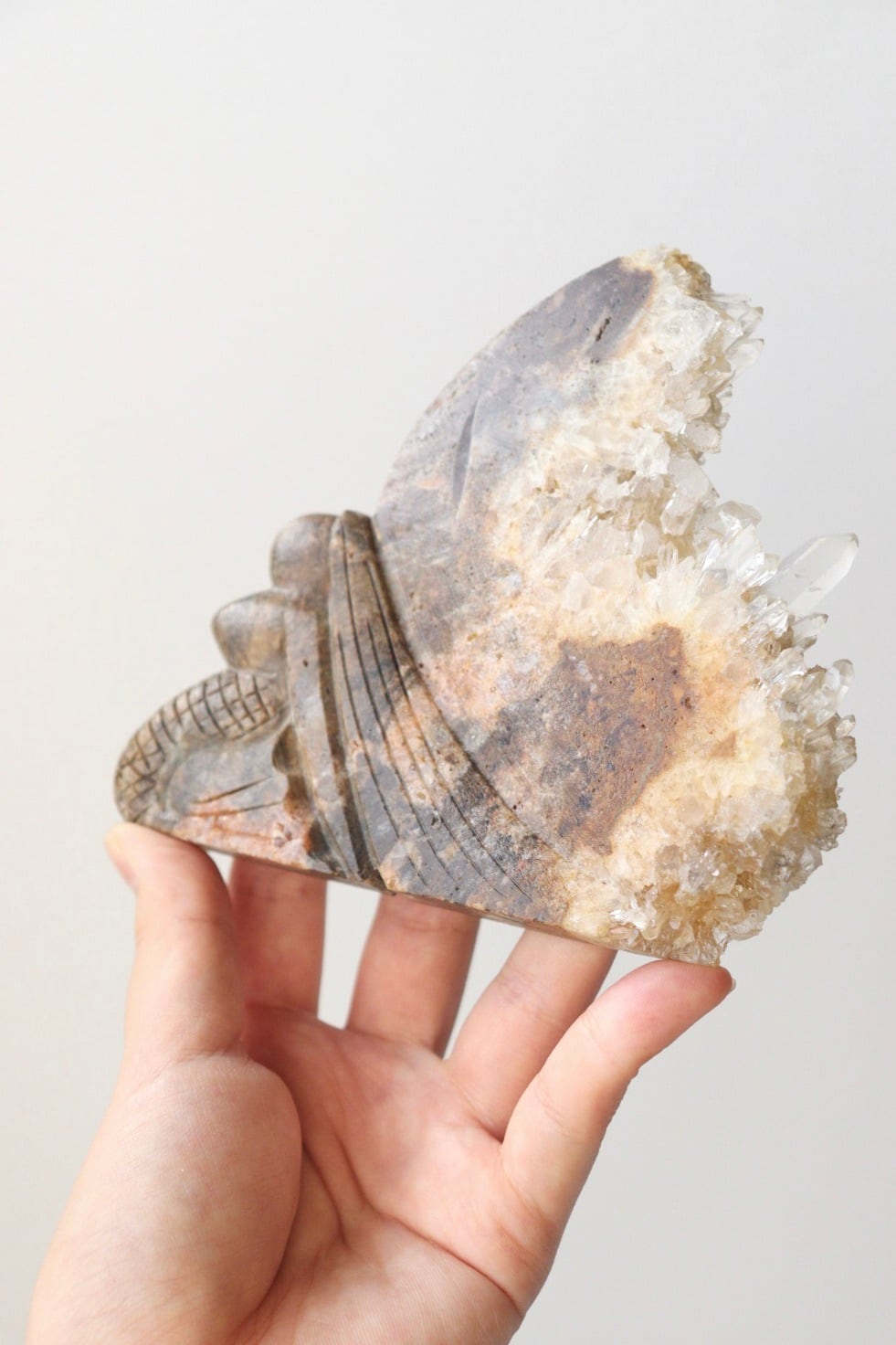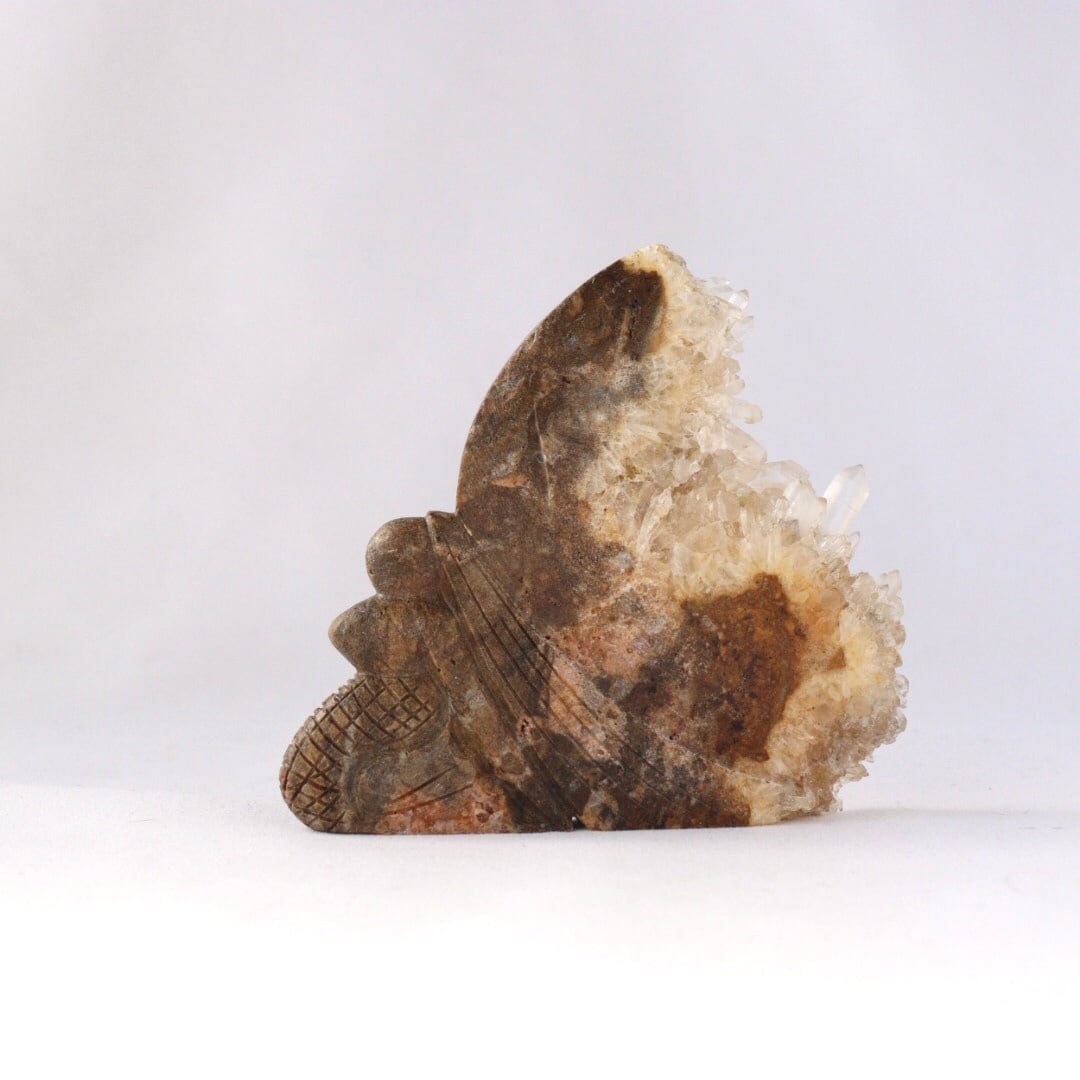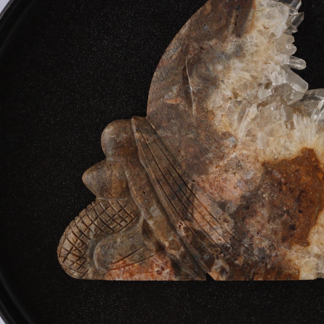 羽はクリアクォーツとブラウンの母岩によって形づくられ、羽の先端にあたる部分がクォーツクラスターとなっています。クラスター部分には、細やかなクォーツの結晶がびっしりと群晶し、透明感のある結晶も美しく並んでいます。