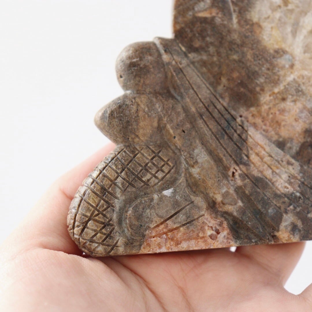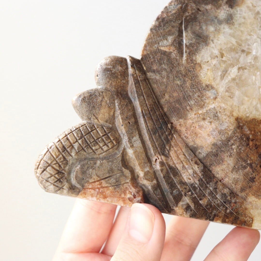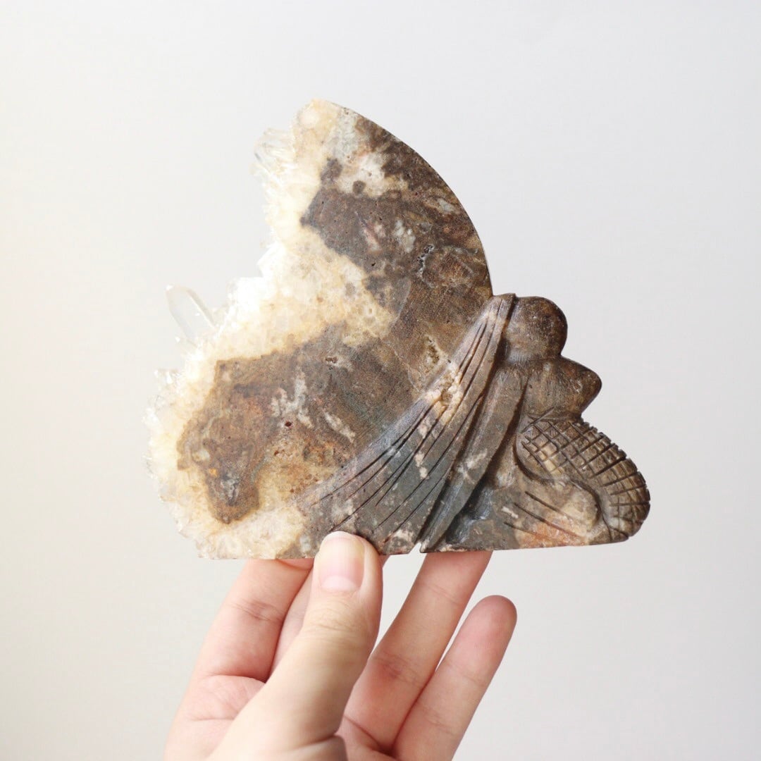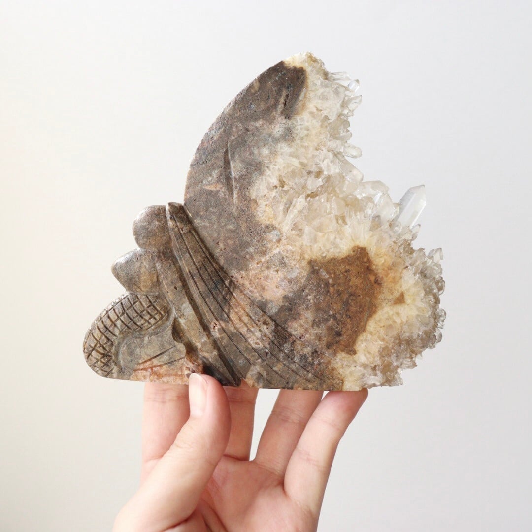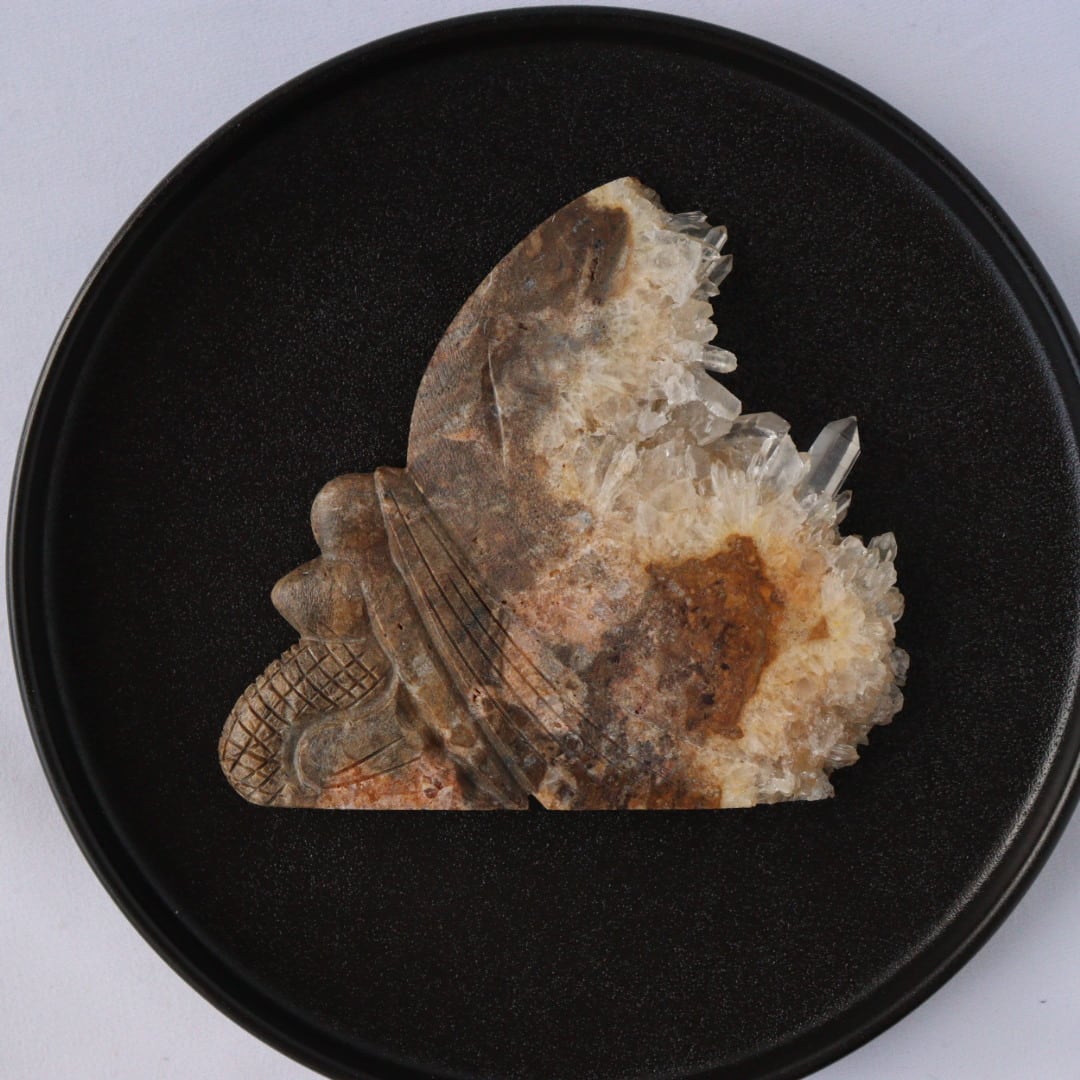 羽はクリアクォーツとブラウンの母岩によって形づくられ、羽の先端にあたる部分がクォーツクラスターとなっています。クラスター部分には、細やかなクォーツの結晶がびっしりと群晶し、透明感のある結晶も美しく並んでいます。