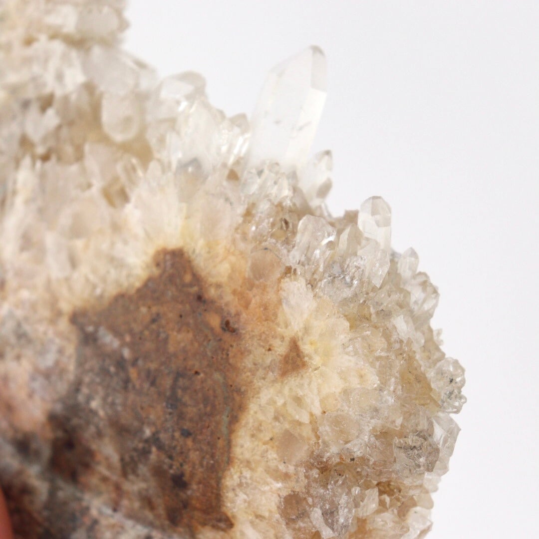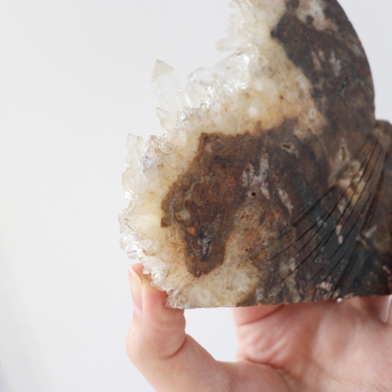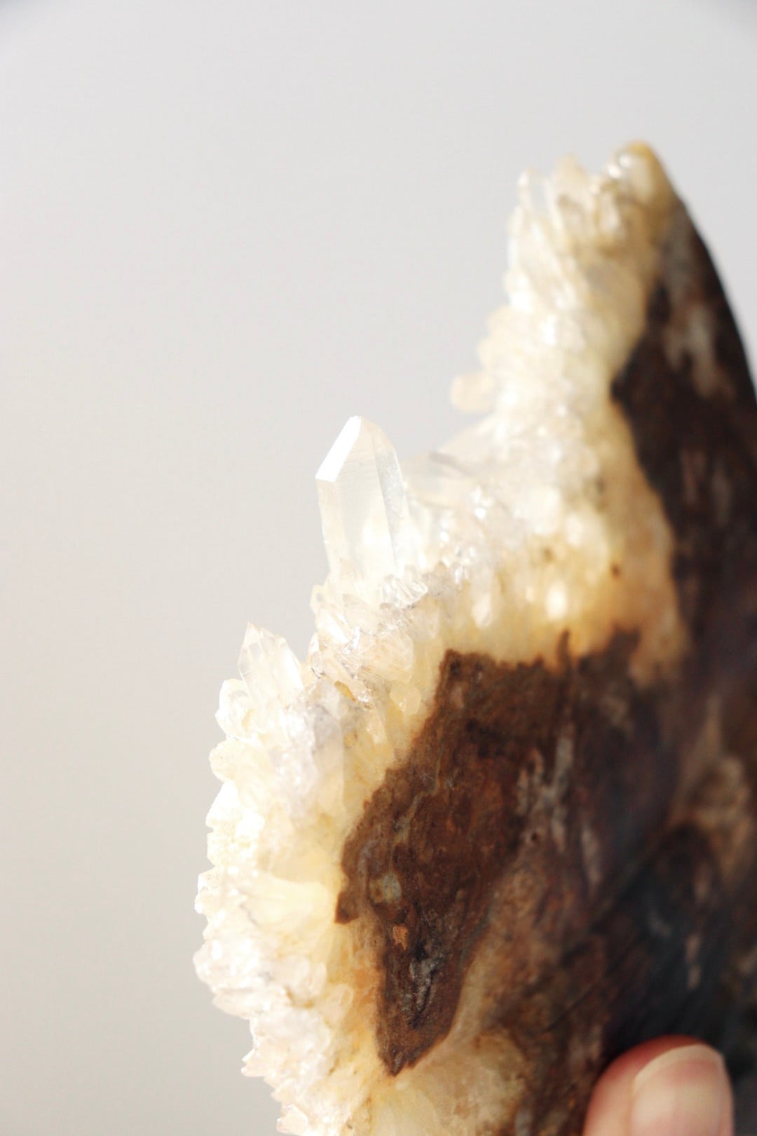落ち着いたブラウンの母岩と透明感のあるクォーツが静かに調和した、美しいクォーツクラスターの妖精。