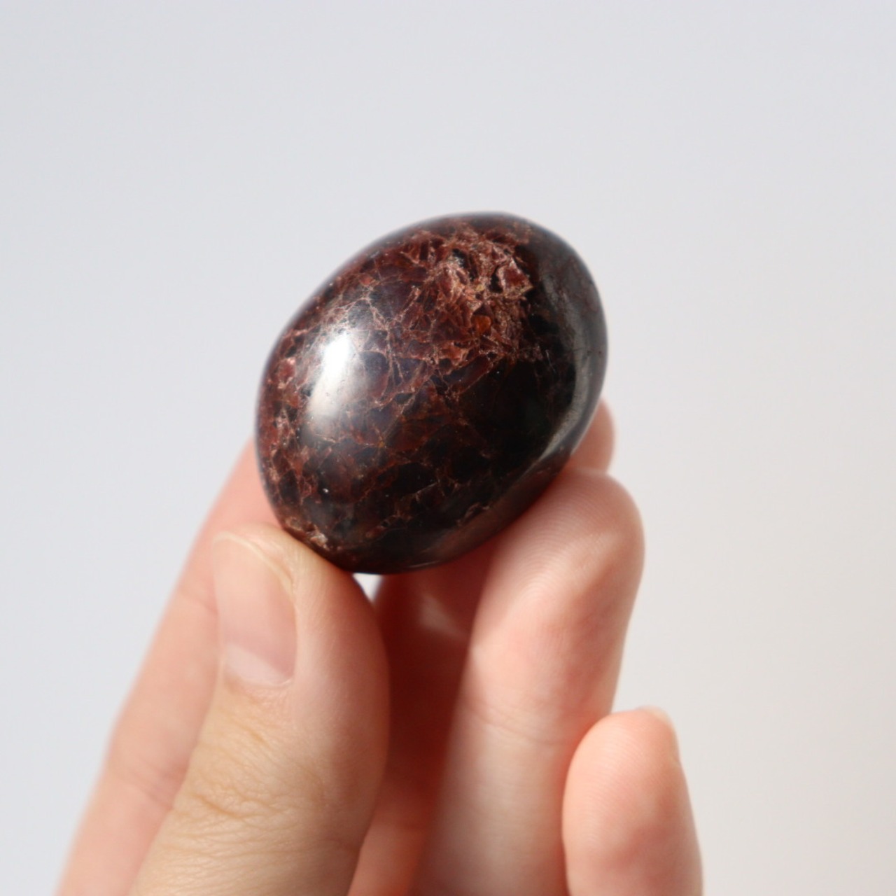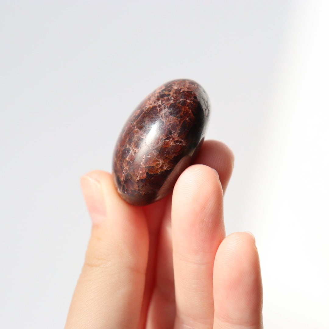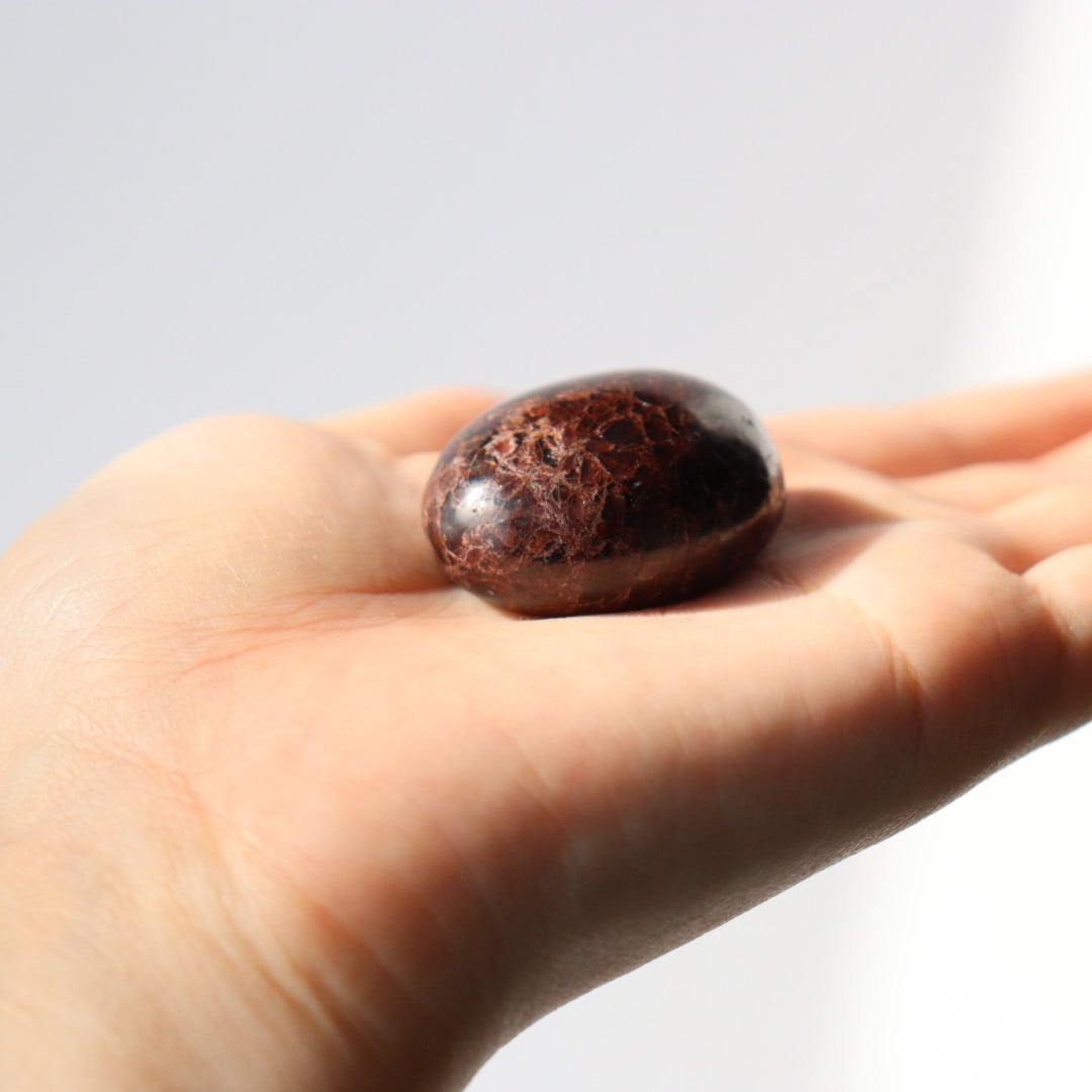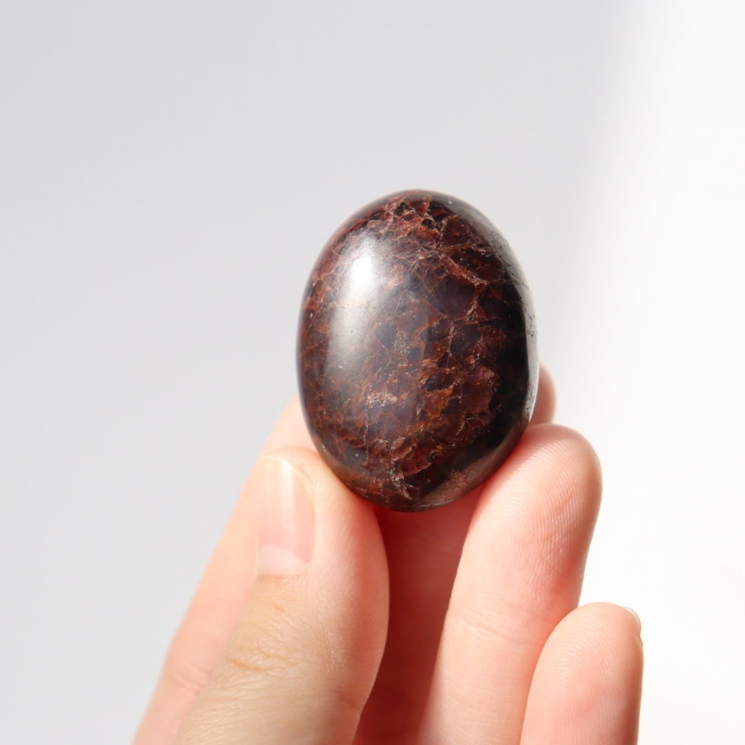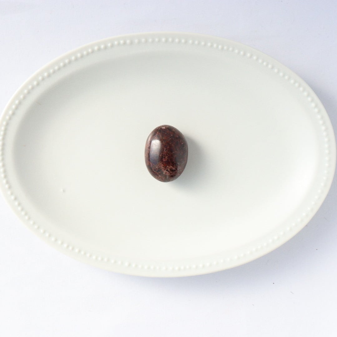 濃い赤色を持ち、一見黒に見えるほどの濃厚な発色が美しいガーネットが、タンブルの形に磨かれています。