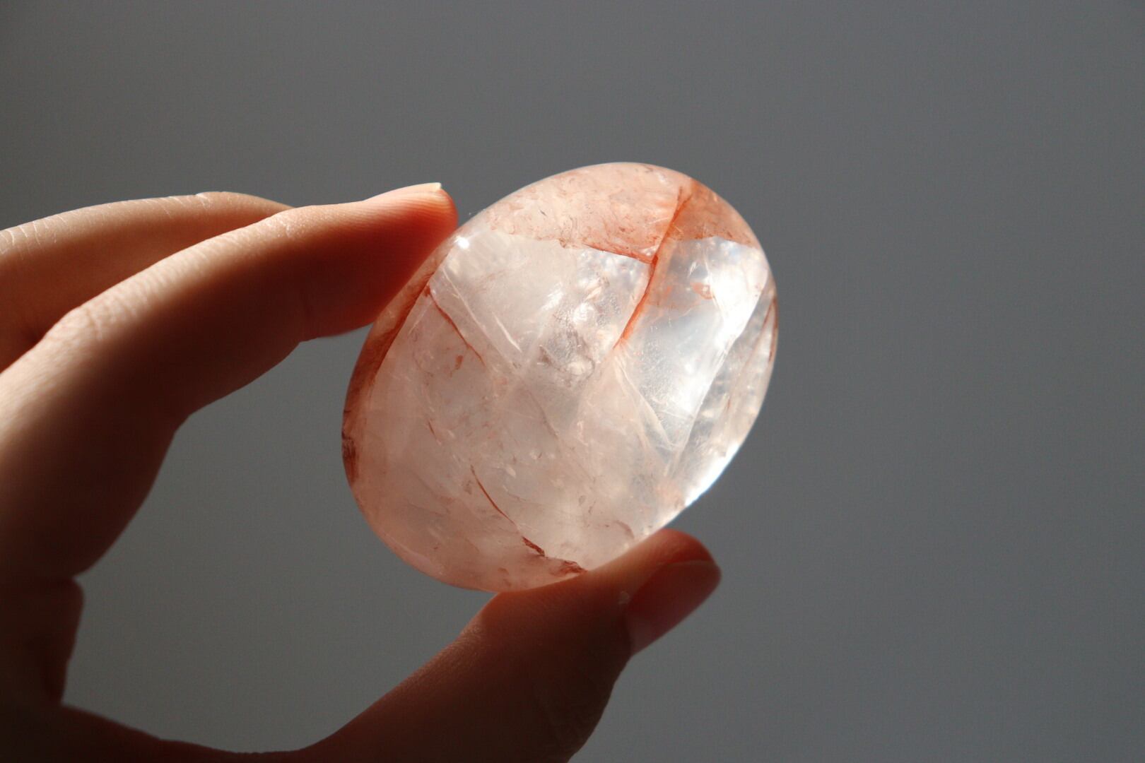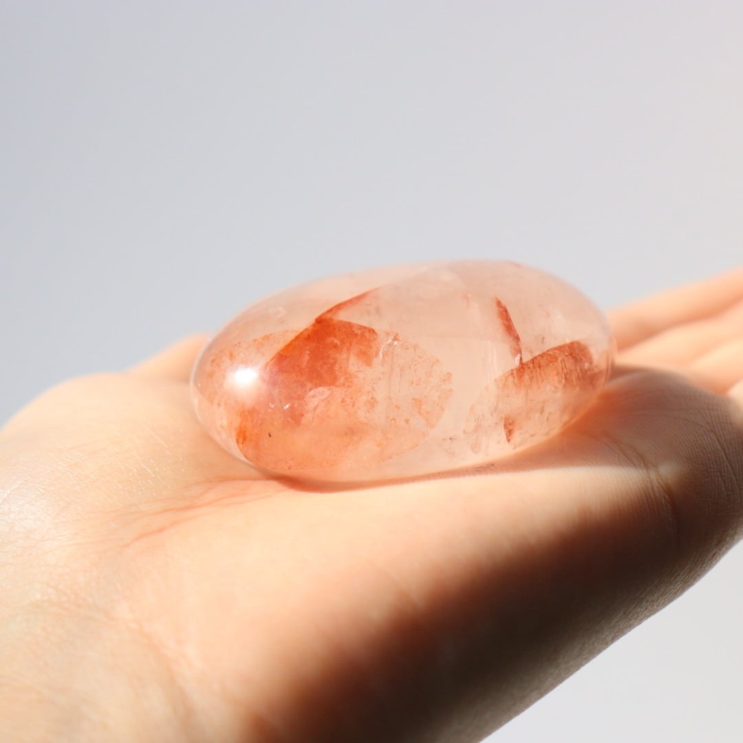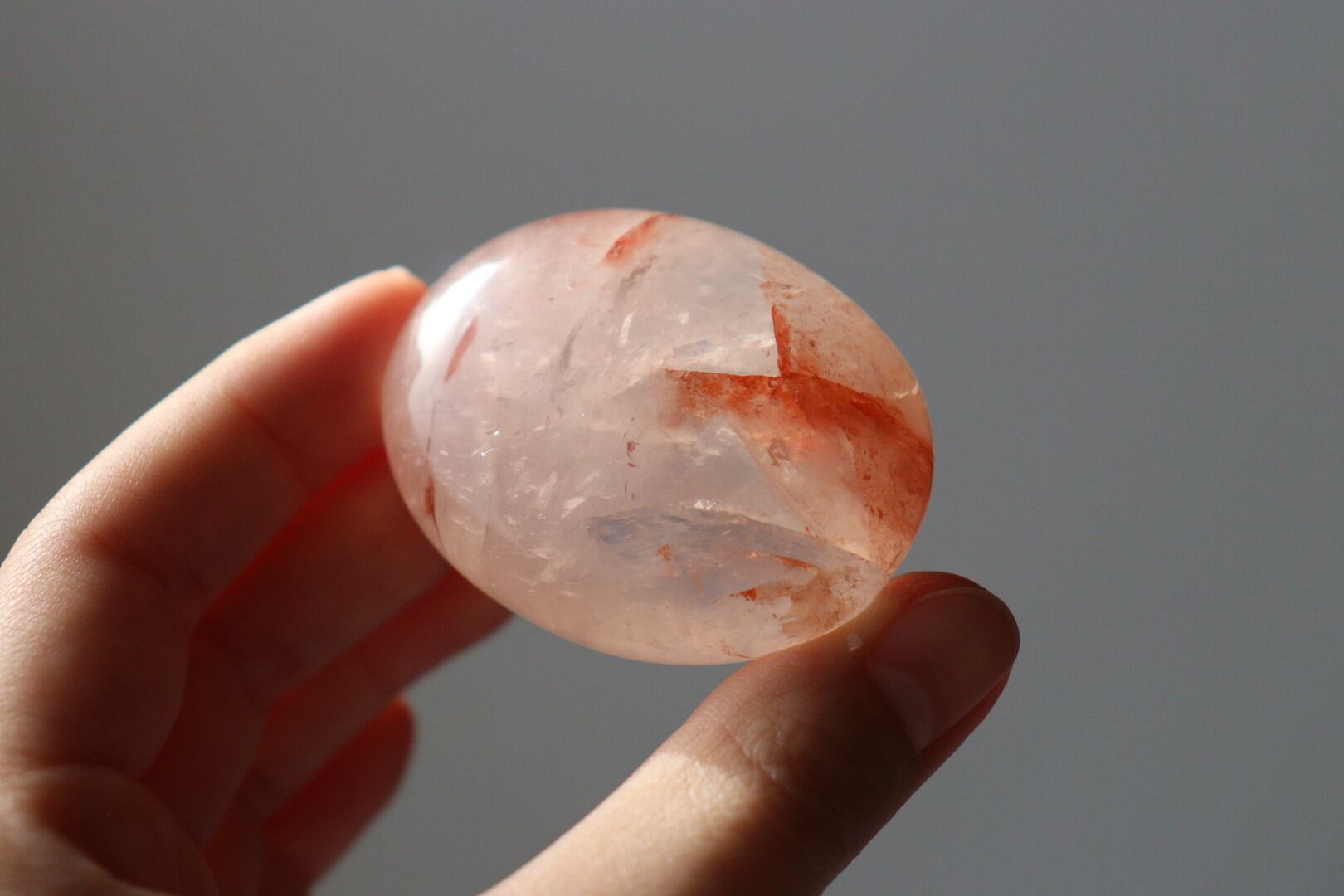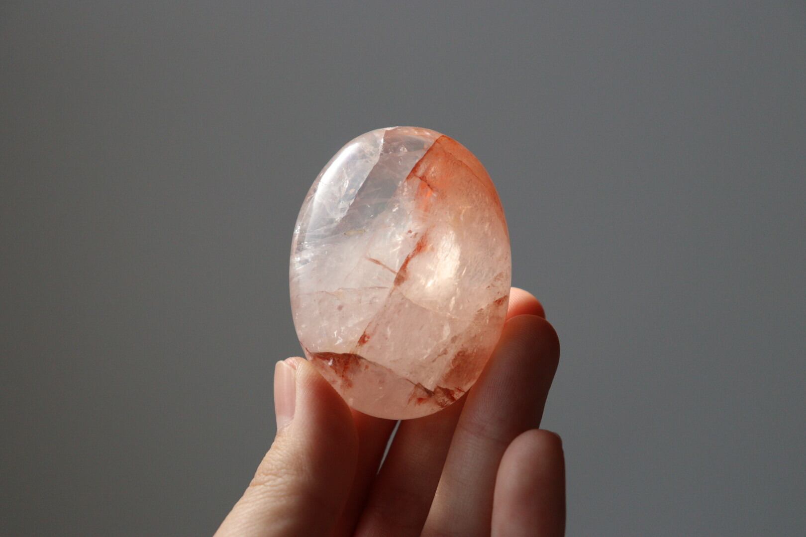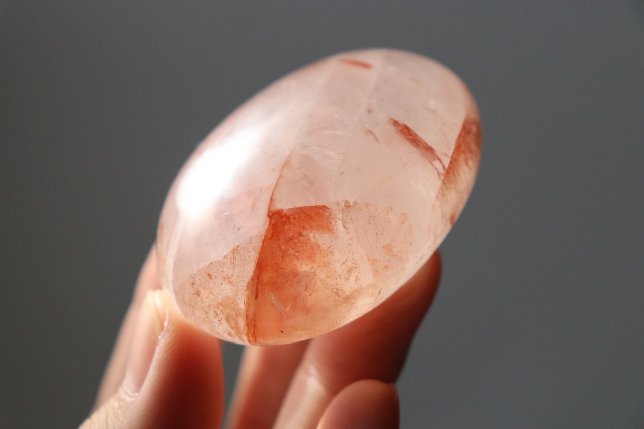 水の中をイメージさせるような透明感の、レッドヘマタイトインクォーツの握り石。