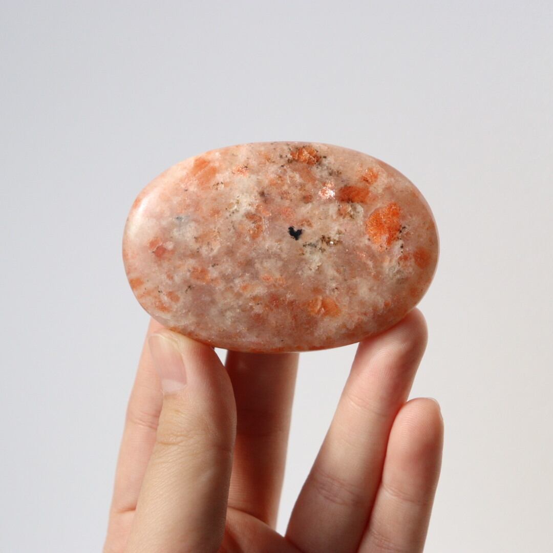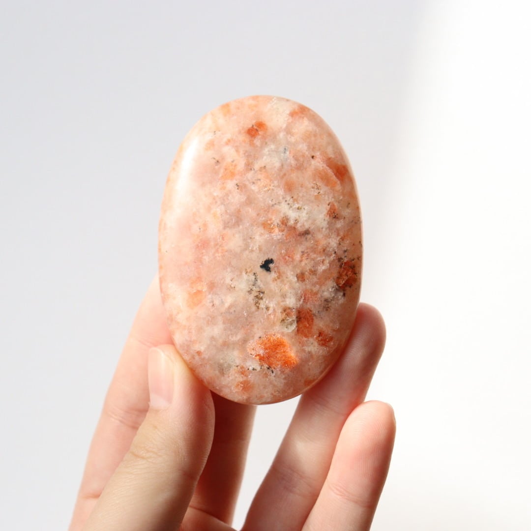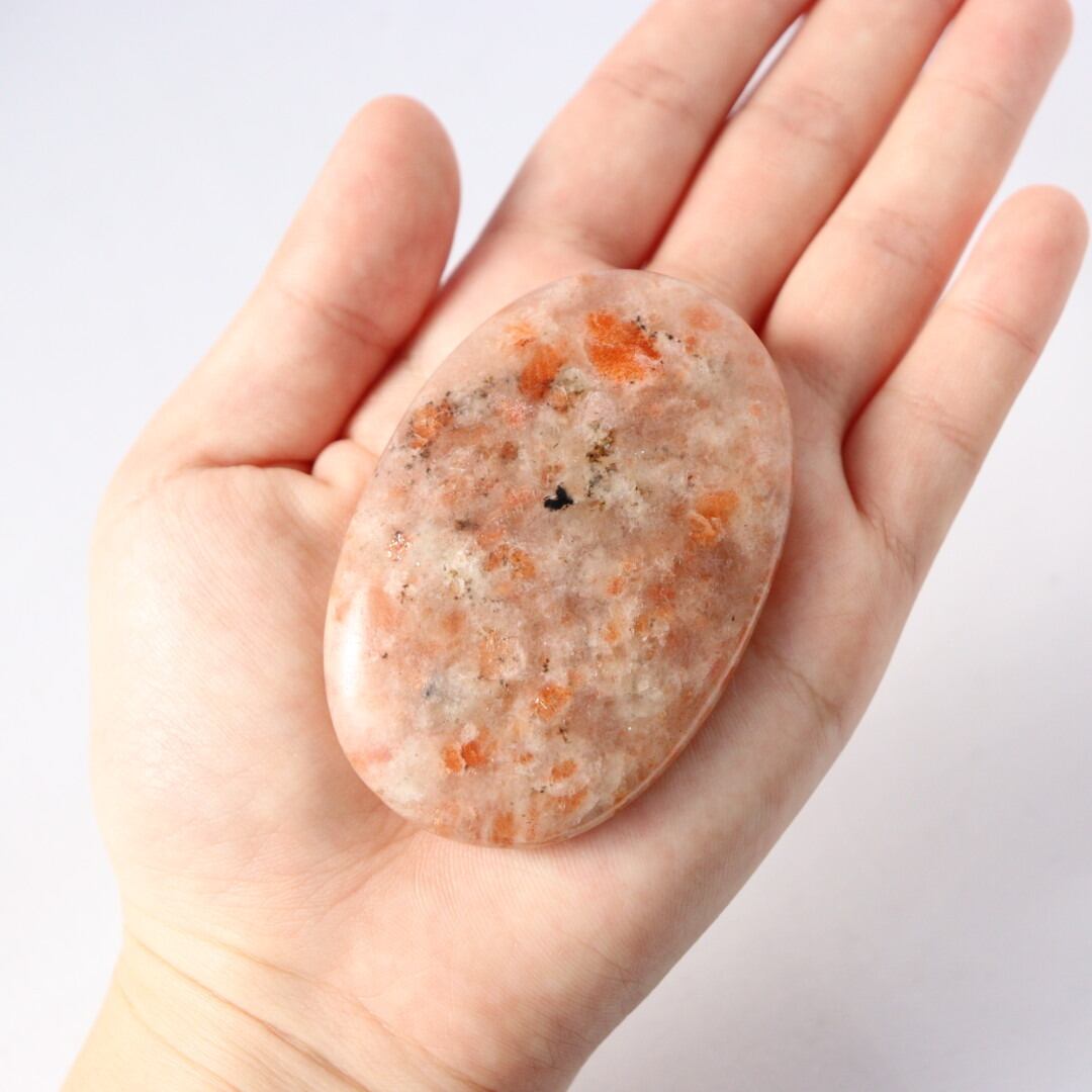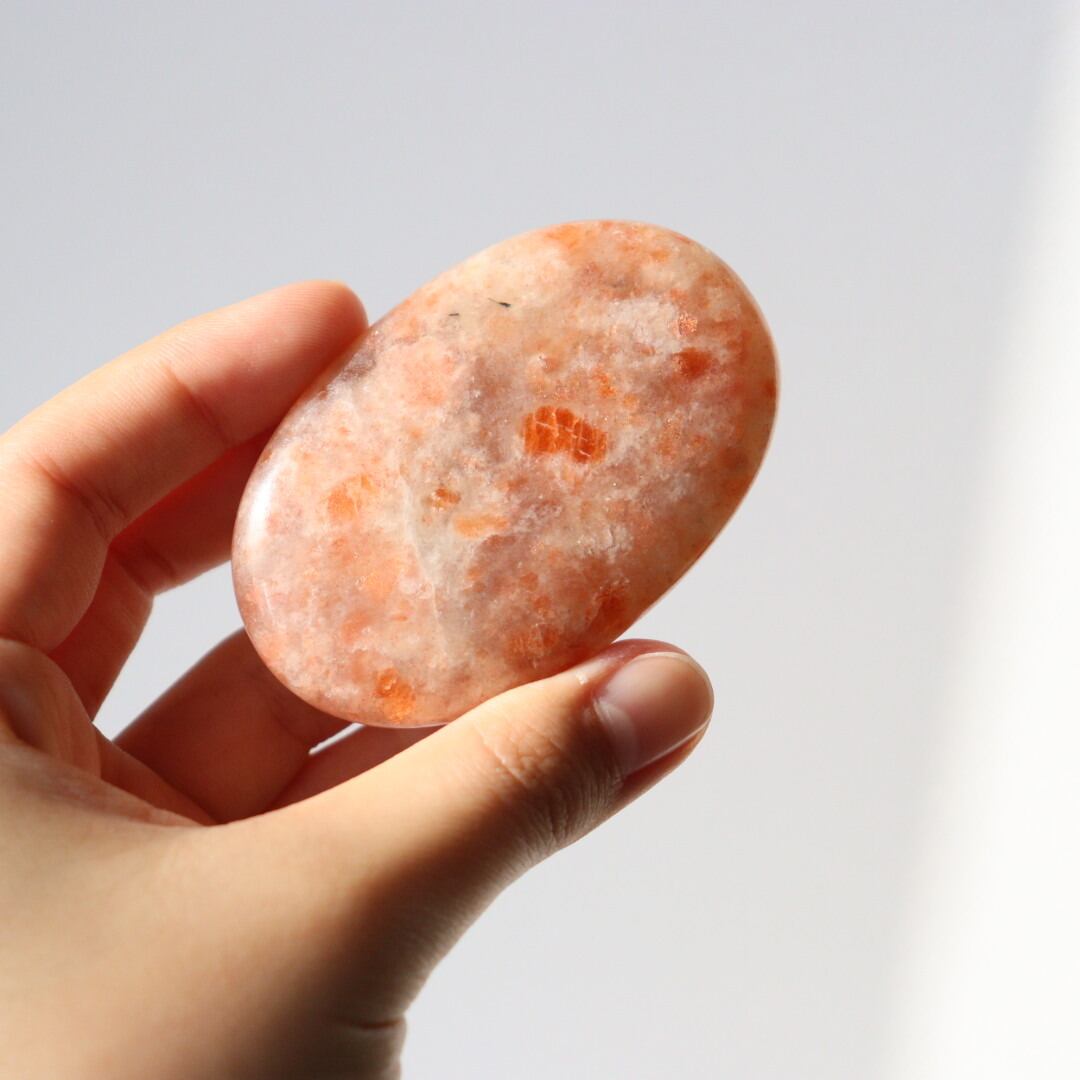 太陽のようなオレンジの輝きを湛えた、サンストーンの握り石。
