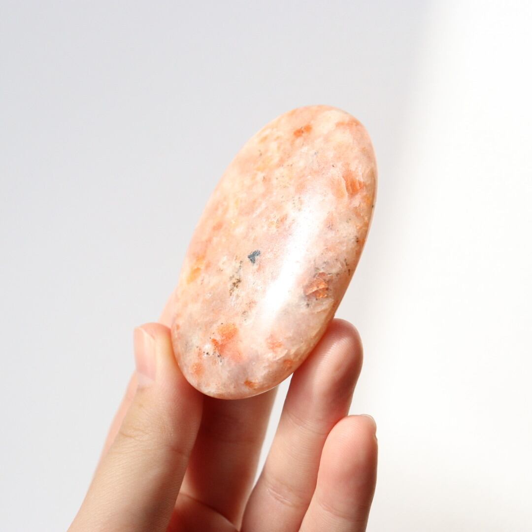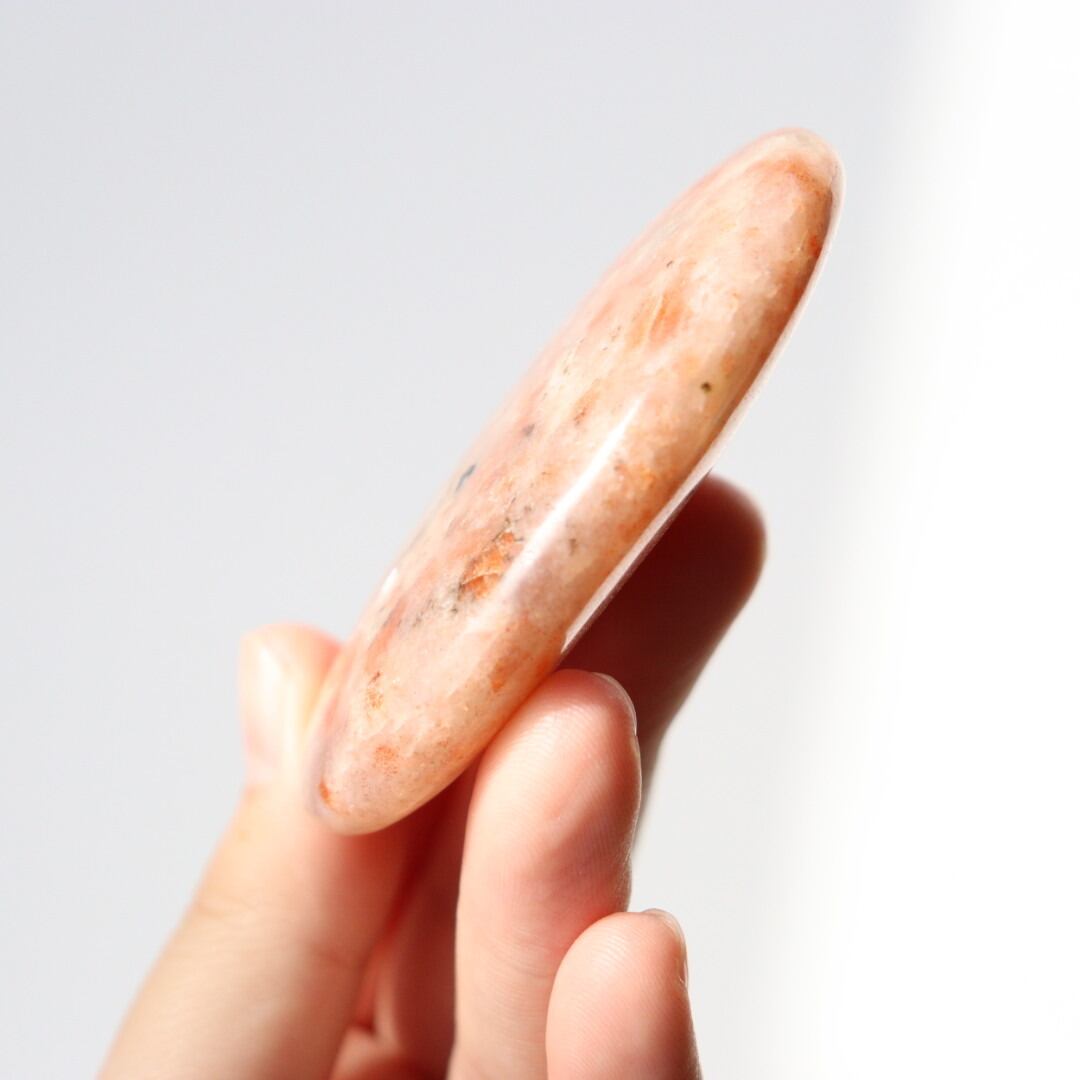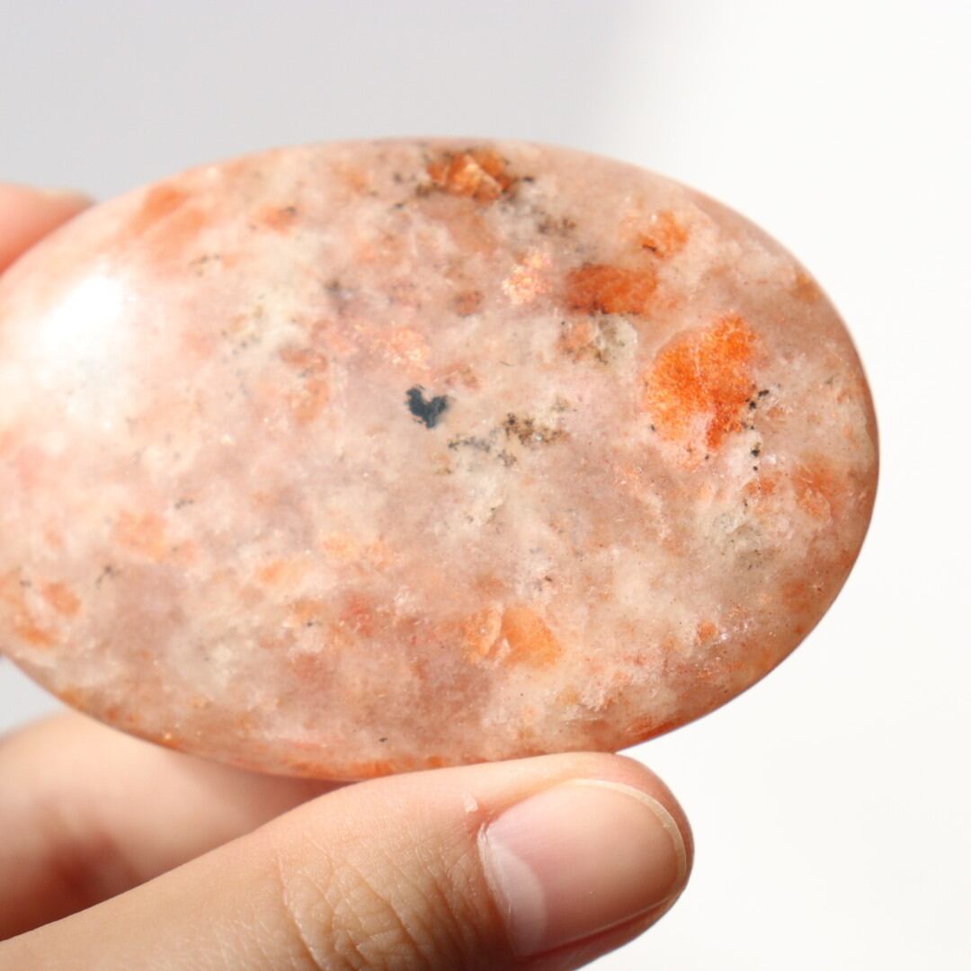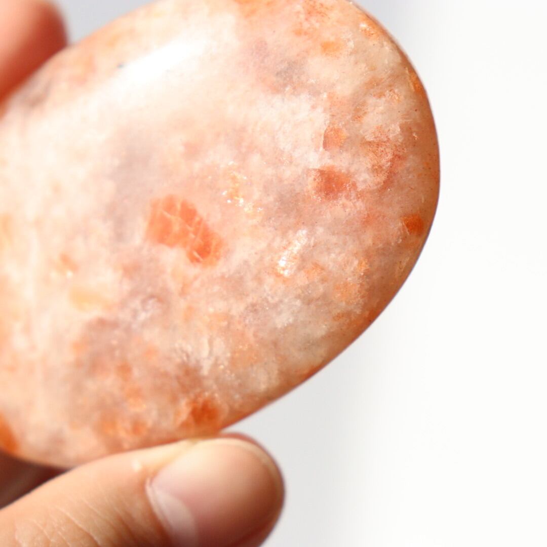 こちらは、柔らかなオレンジ色の中にアベンチュレッセンスの輝きが強く現れるサンストーンの握り石。