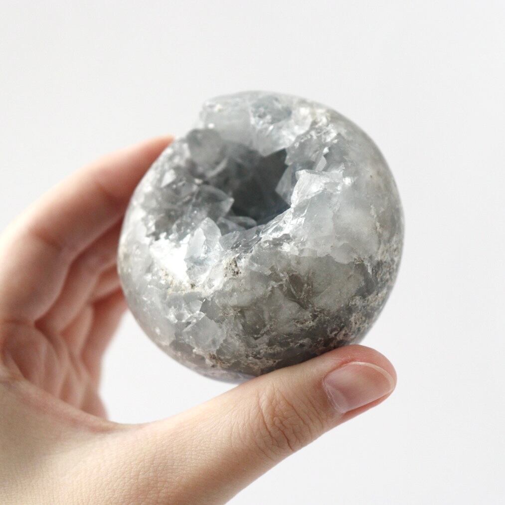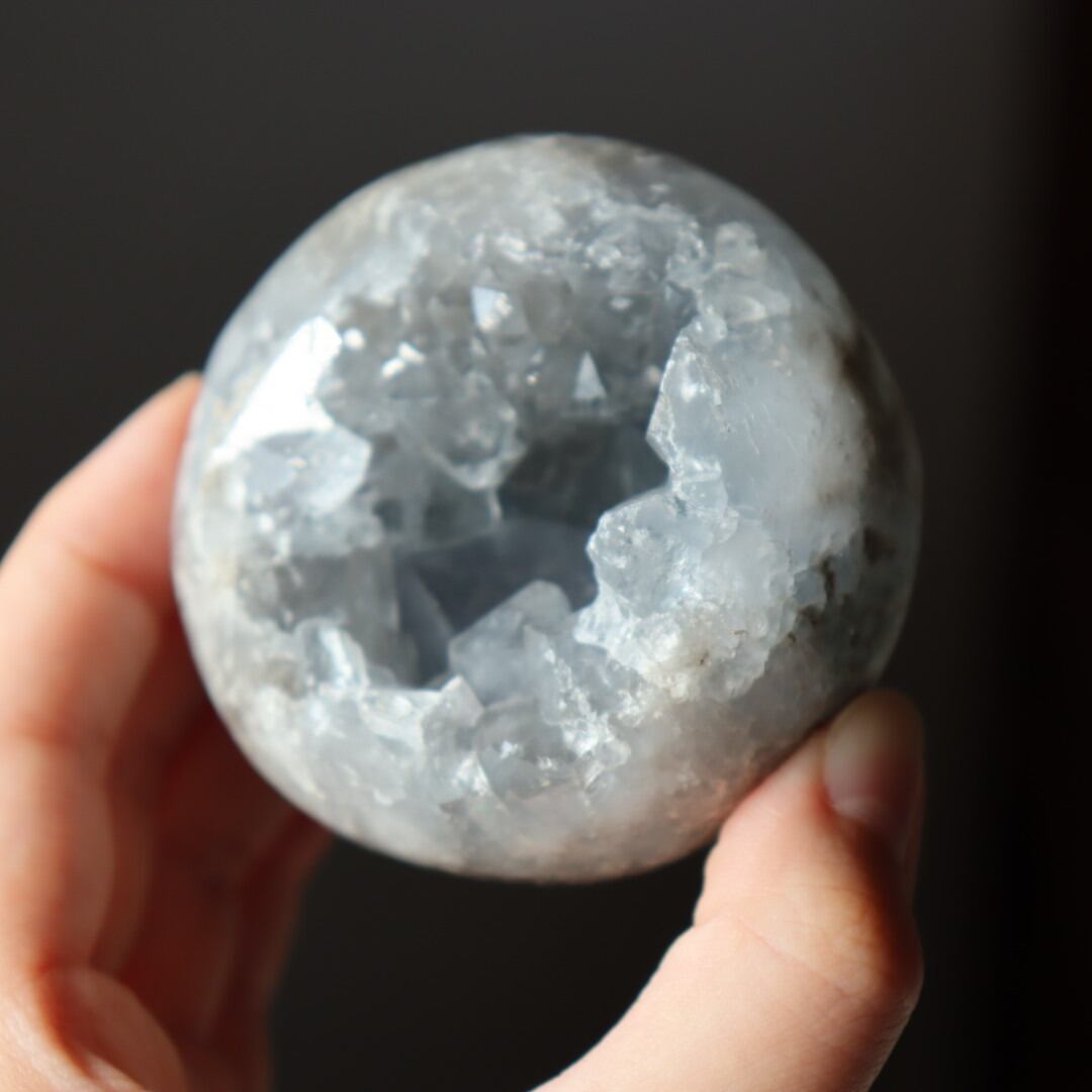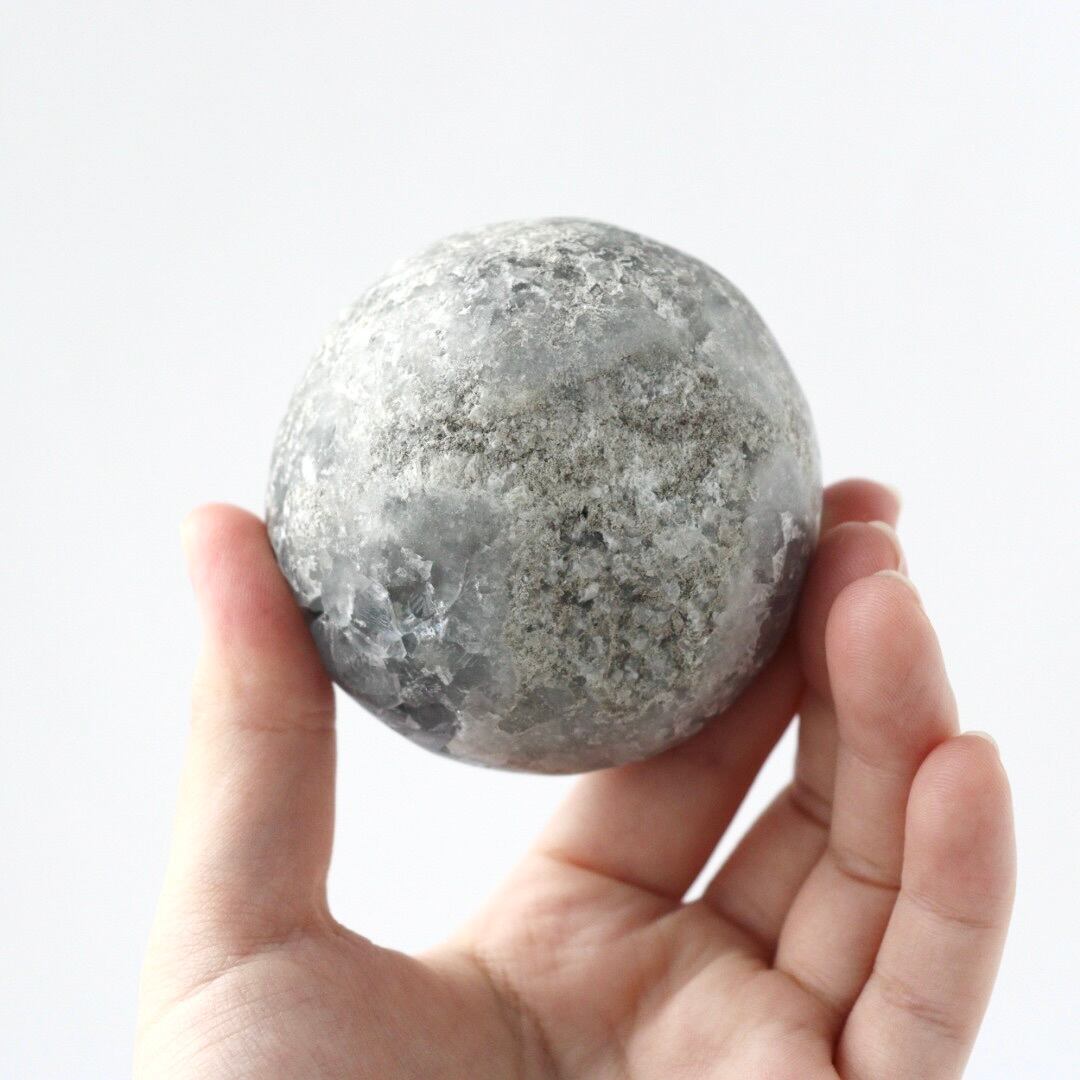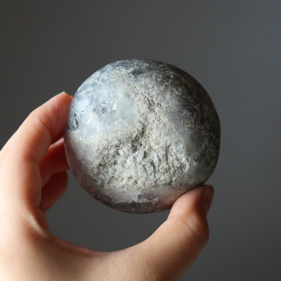 こちらは、大きな恐竜の卵を思わせる、存在感のある塊状のセレスタイトクラスター。