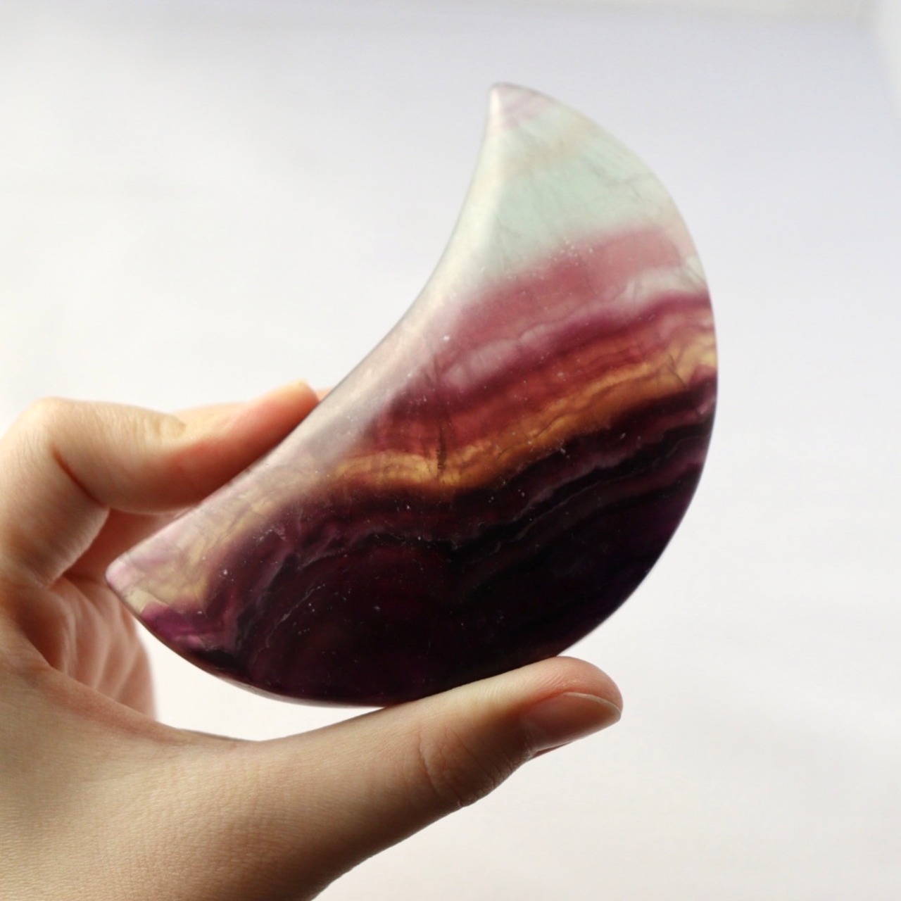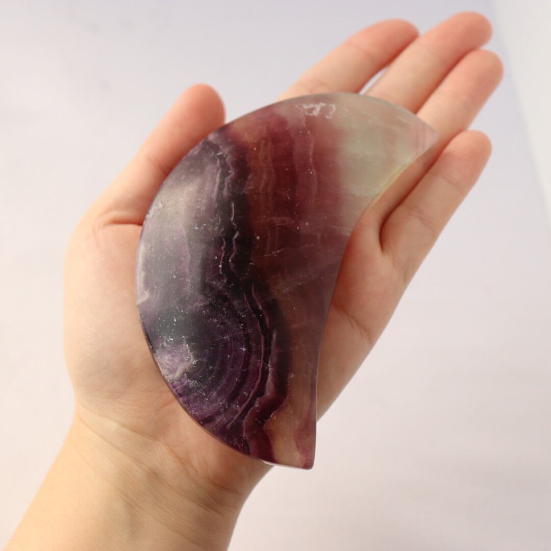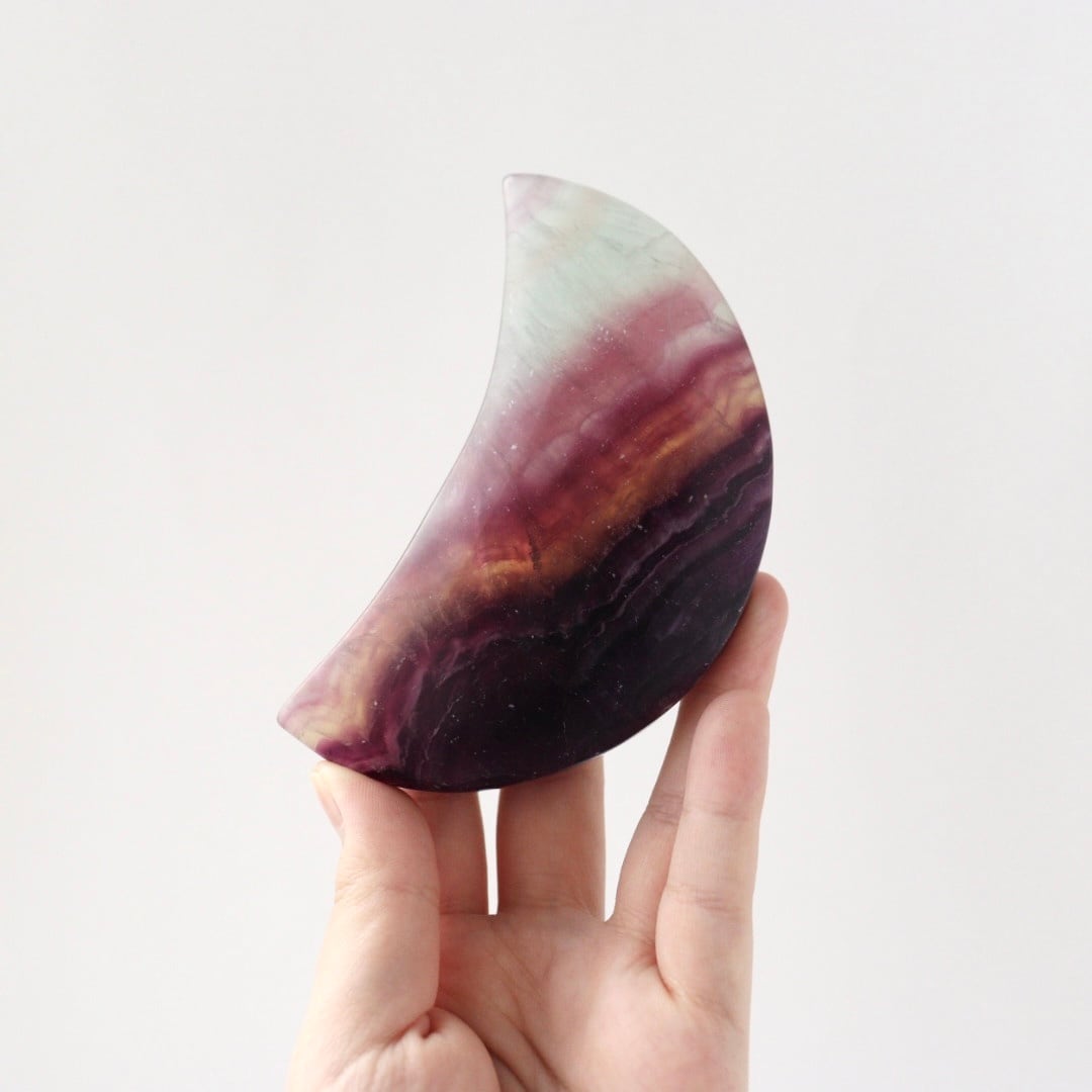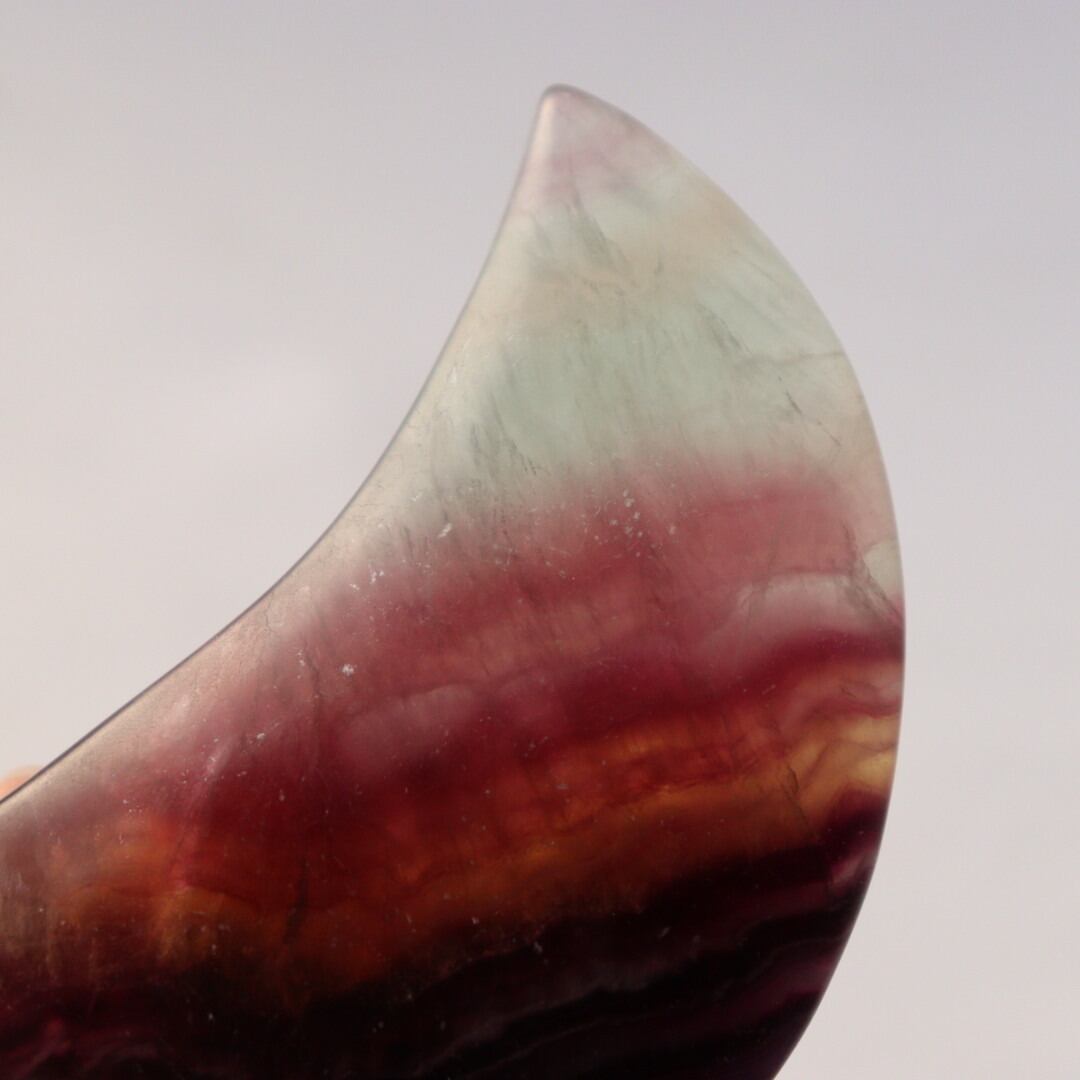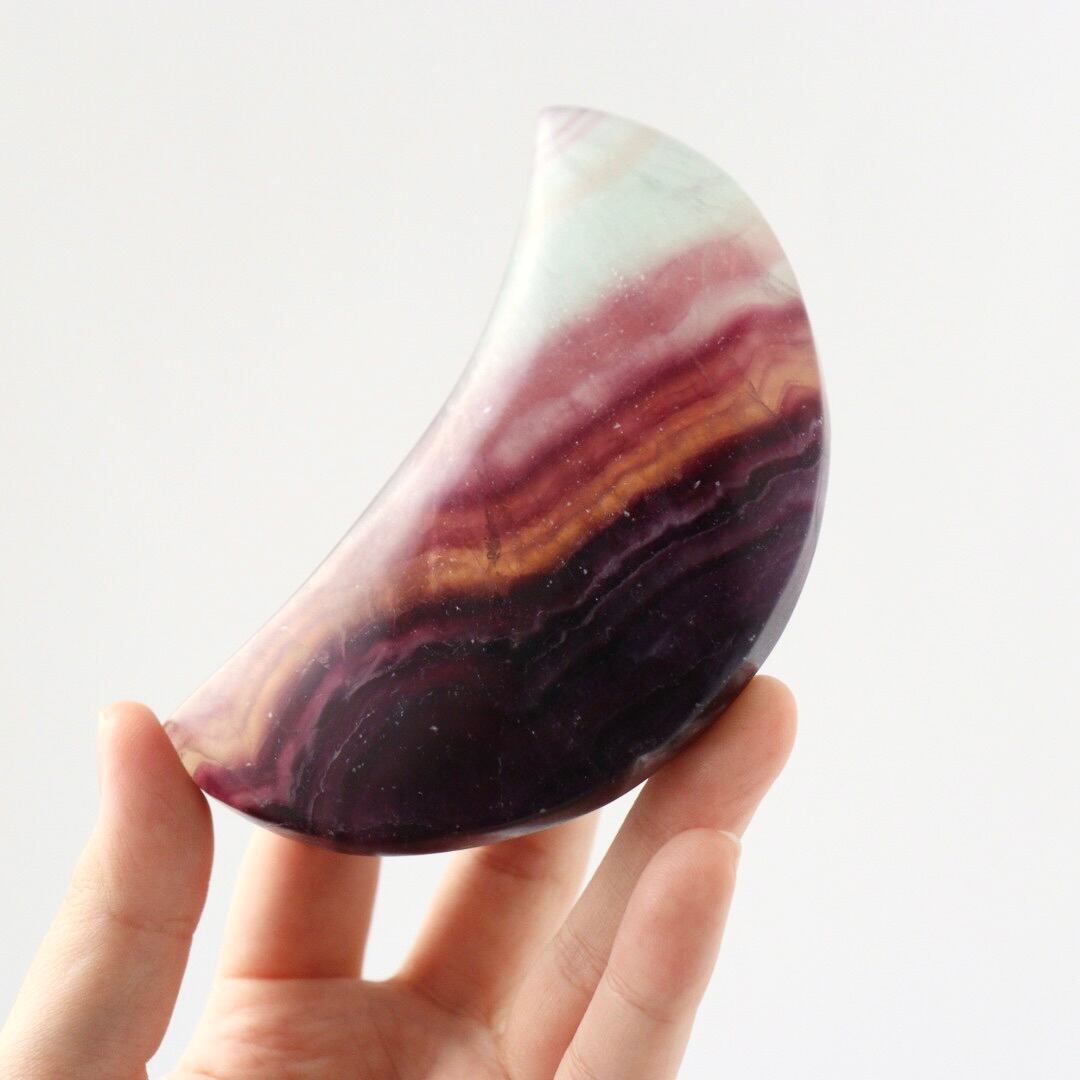 パープルを主に、イエローやブルーがやわらかく溶け合う、マルチカラーフローライトの大きなムーンシェイプ。