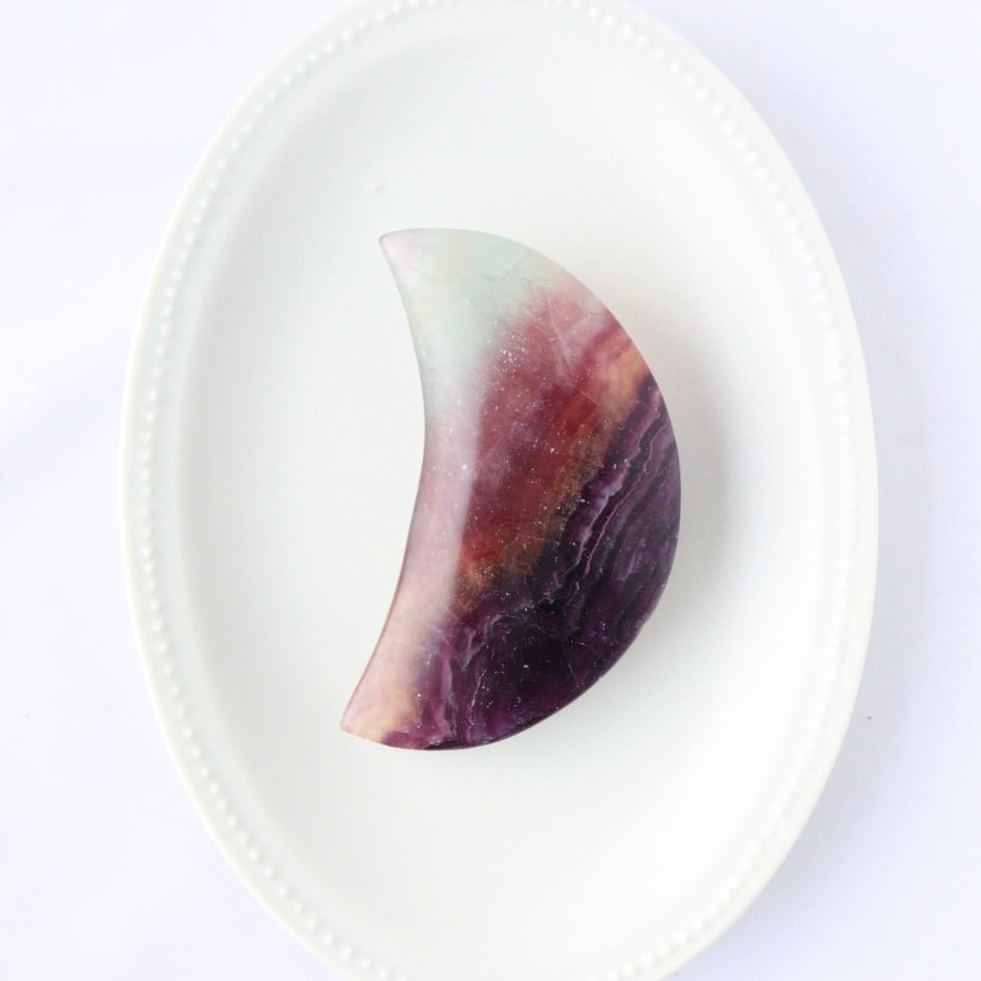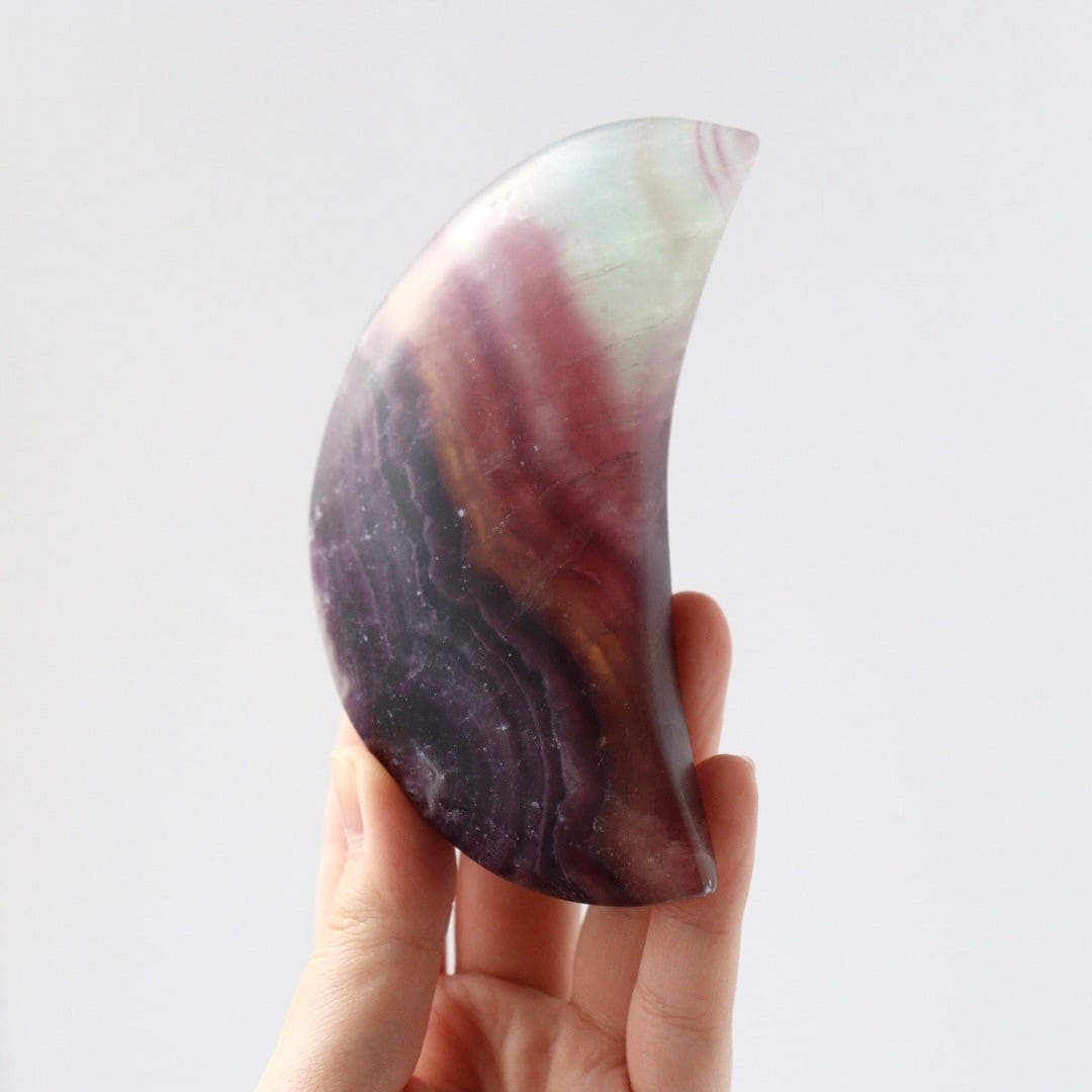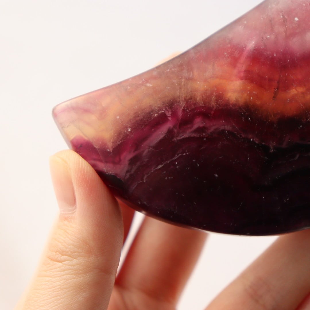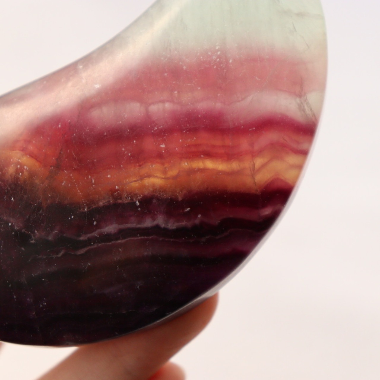 パープルを主に、イエローやブルーがやわらかく溶け合う、マルチカラーフローライトの大きなムーンシェイプ。