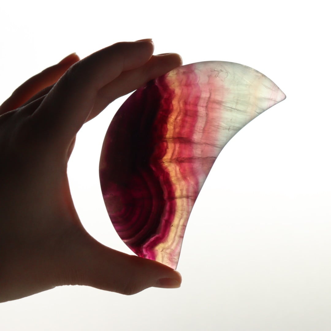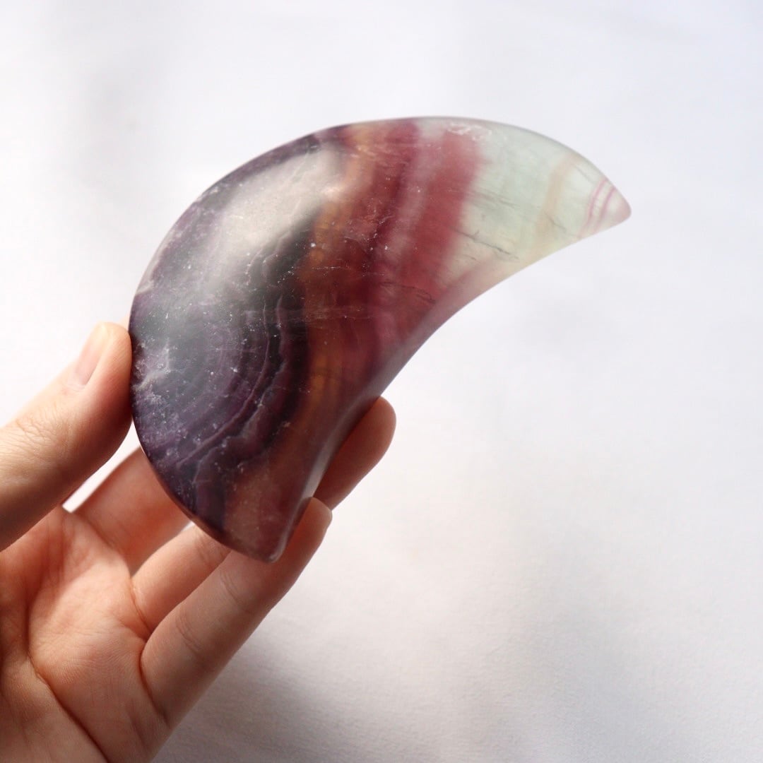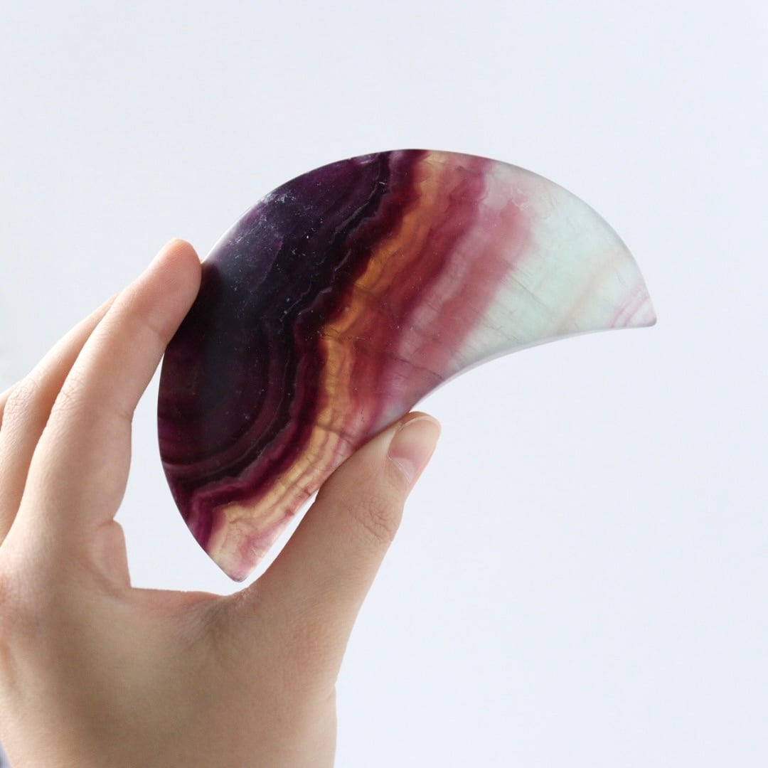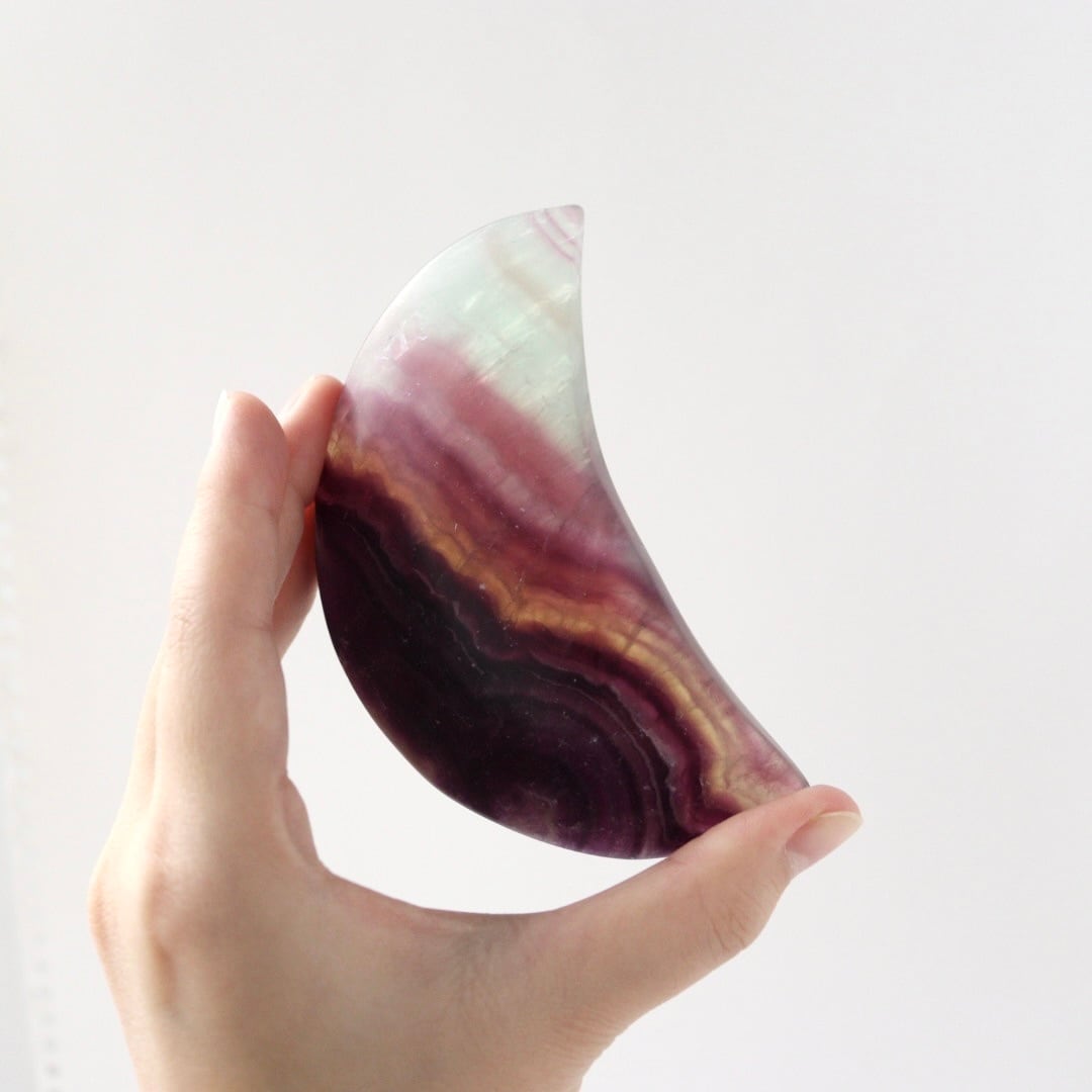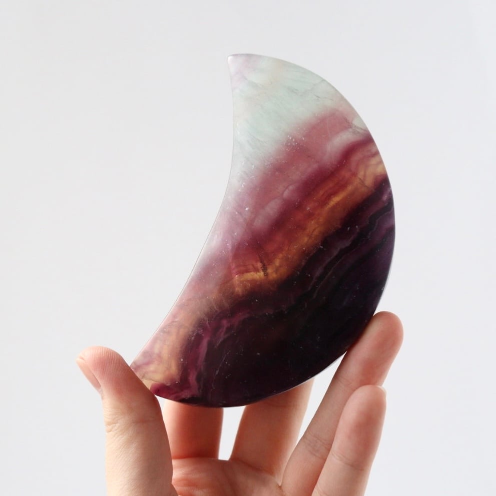 パープルを主に、イエローやブルーがやわらかく溶け合う、マルチカラーフローライトの大きなムーンシェイプ。
