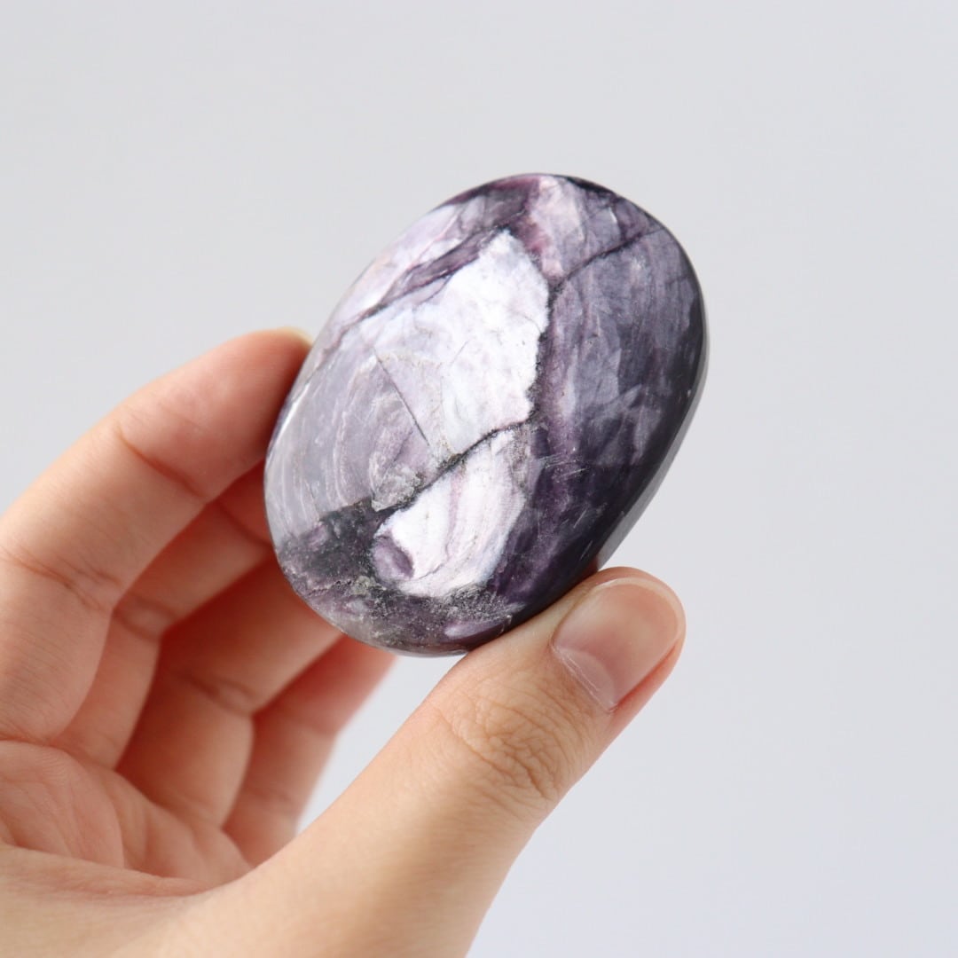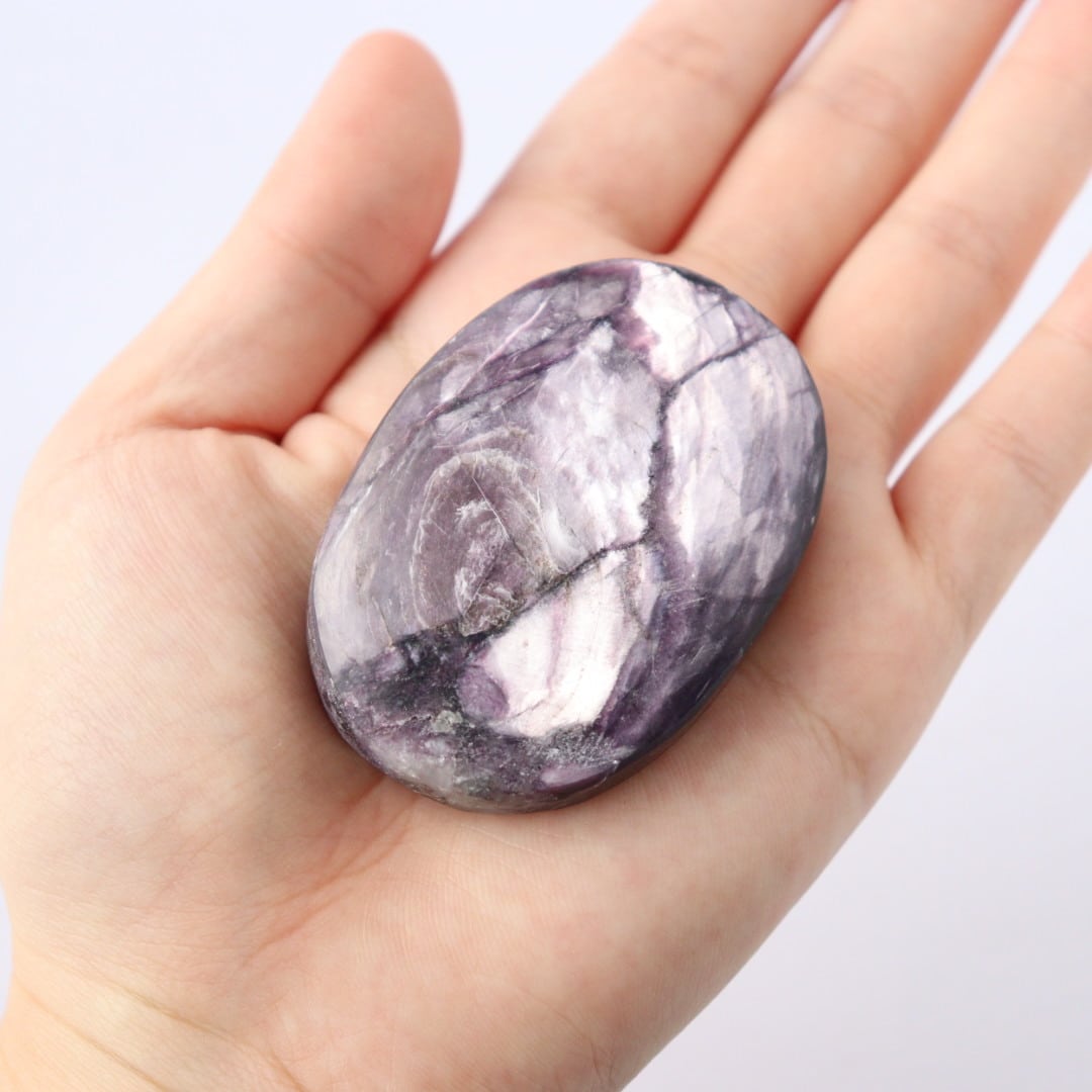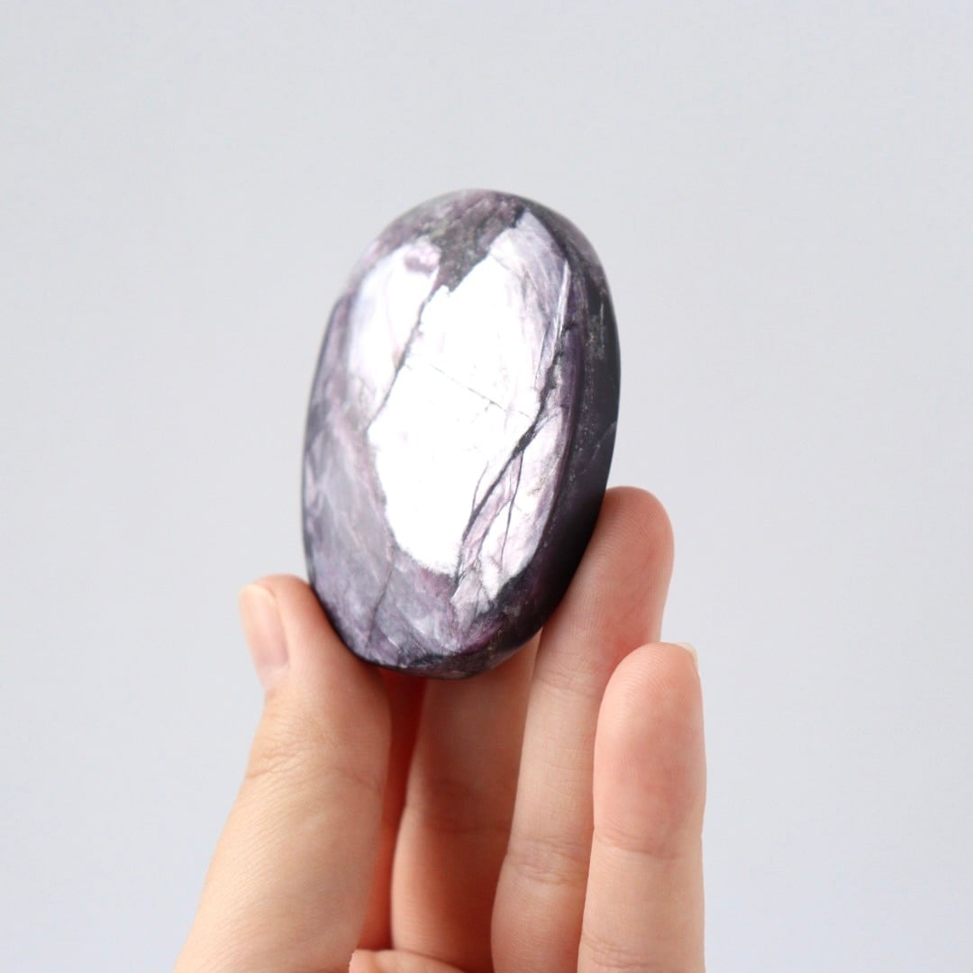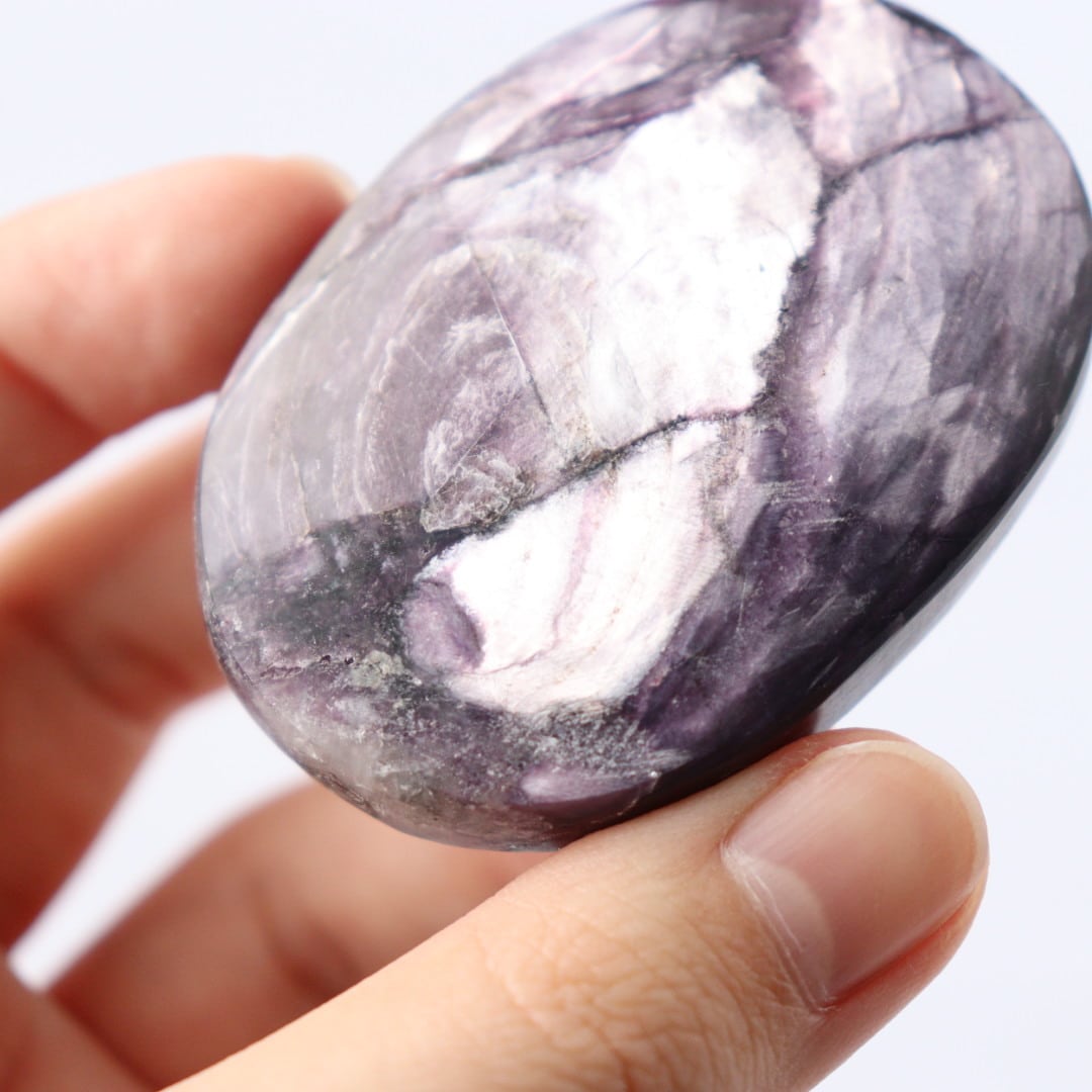 柔らかなパープルカラーと閃光が調和する、パープルマイカの握り石。