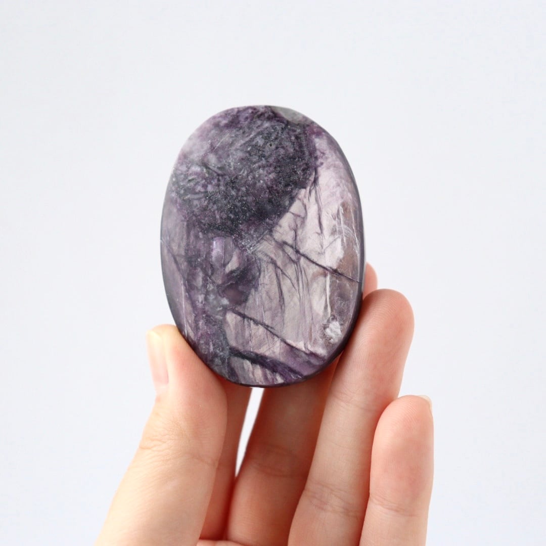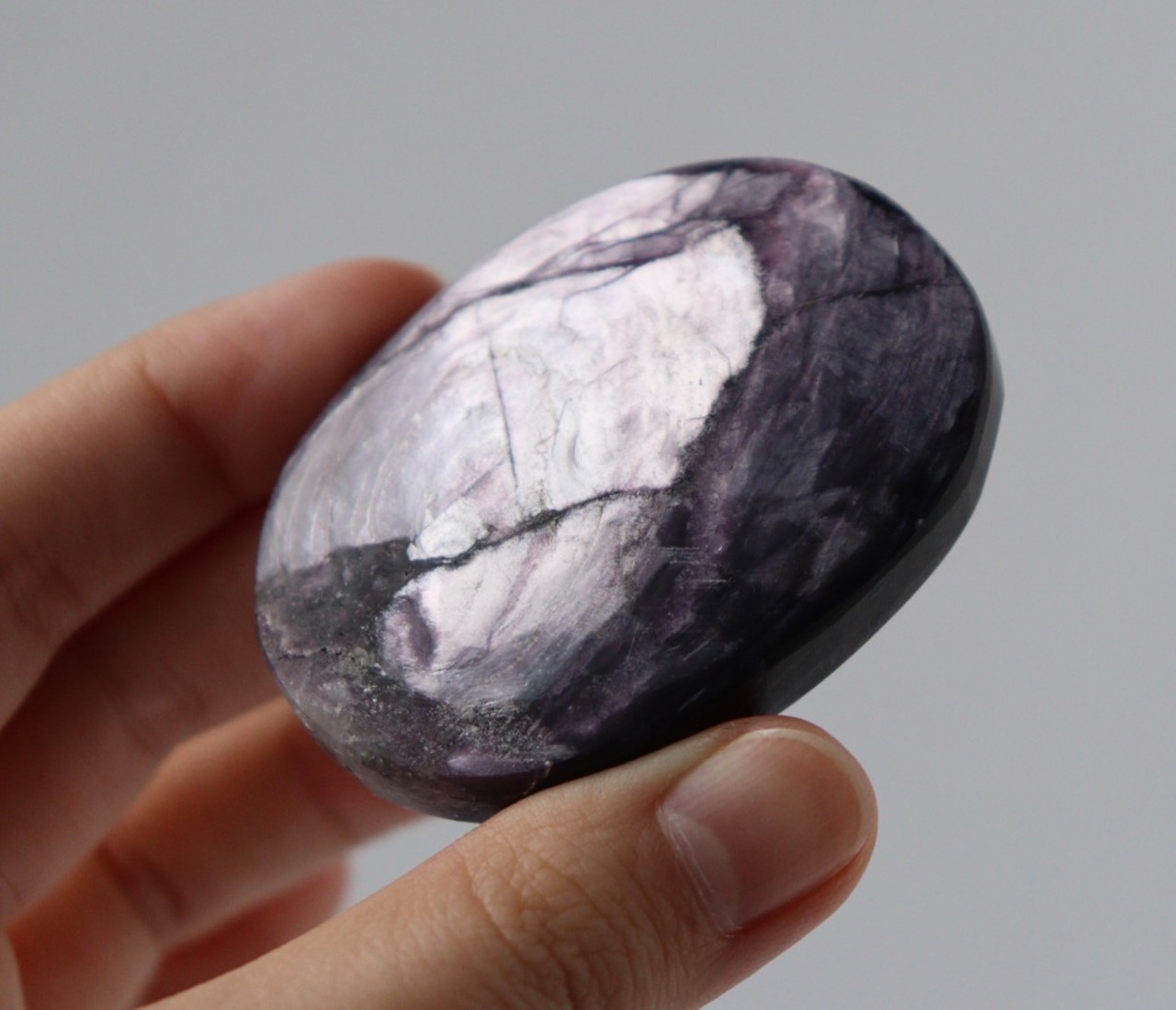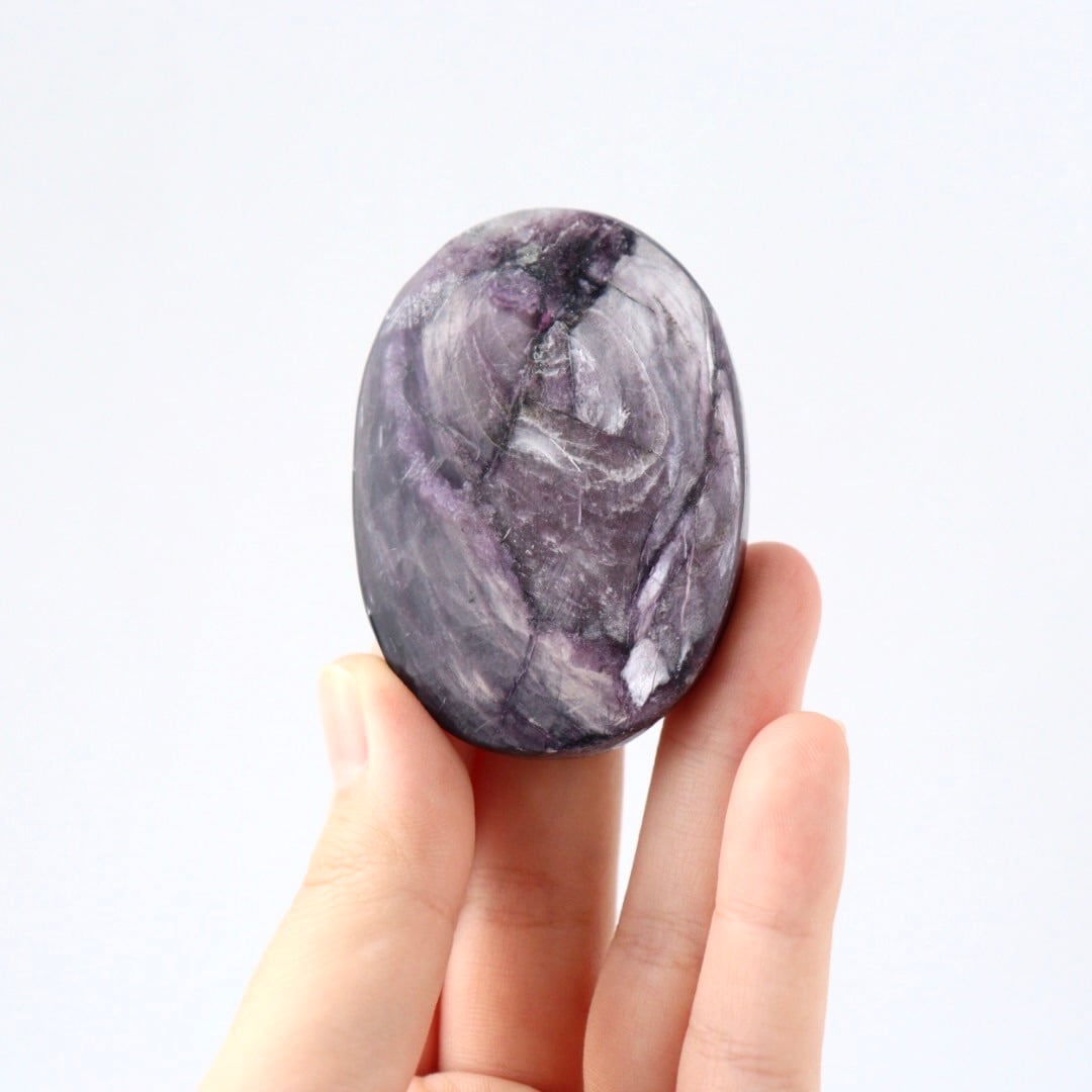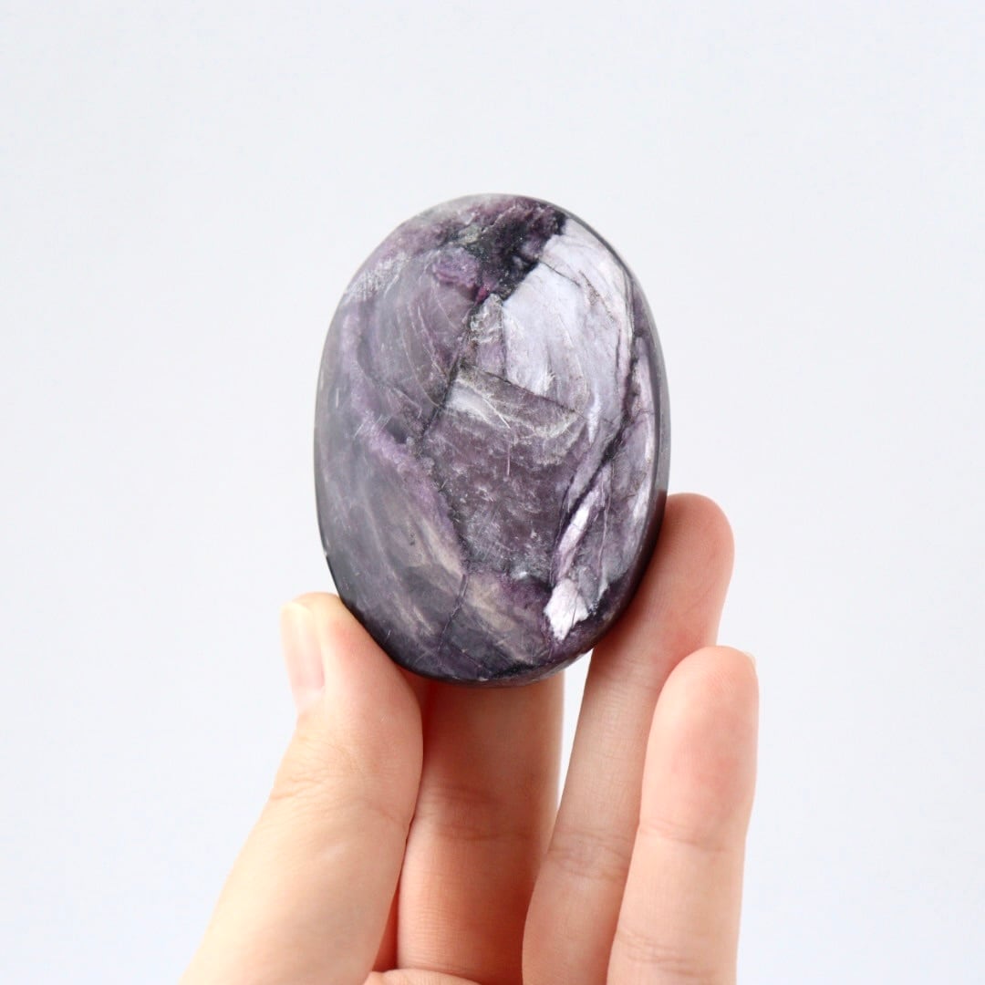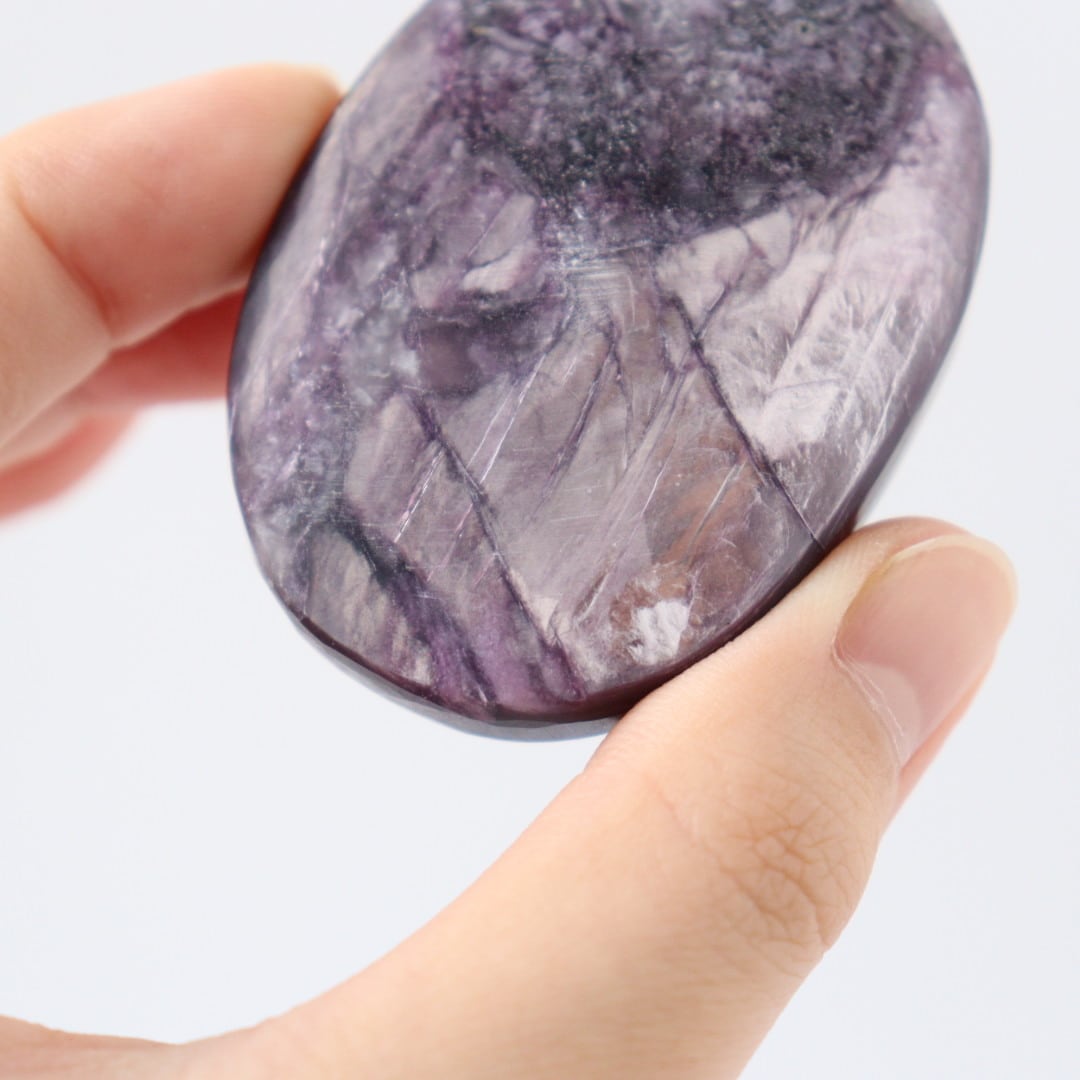 柔らかなパープルカラーと閃光が調和する、パープルマイカの握り石。