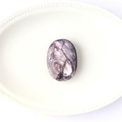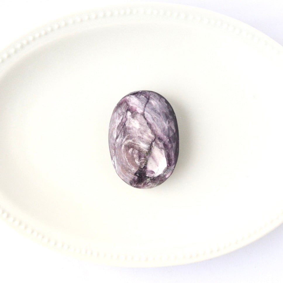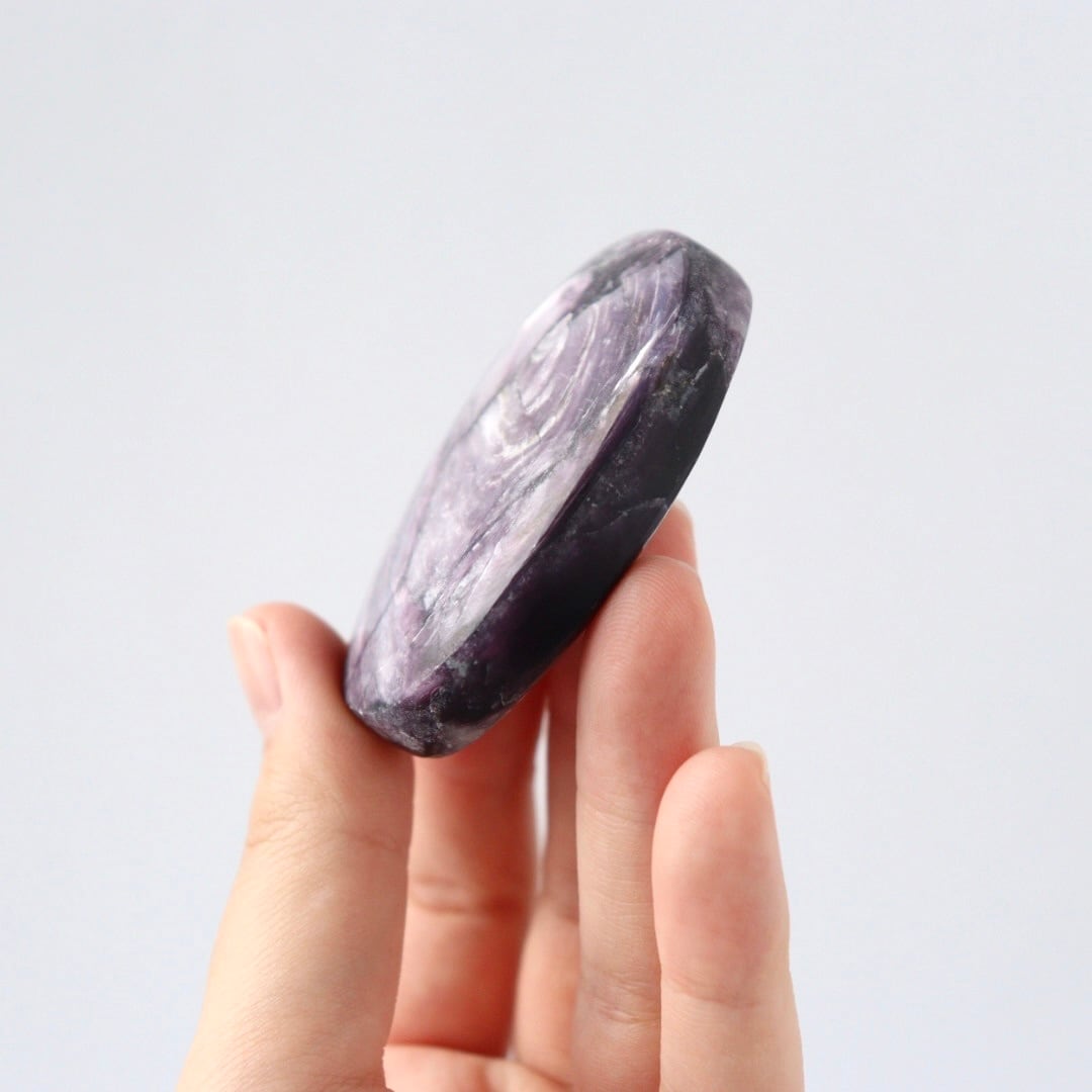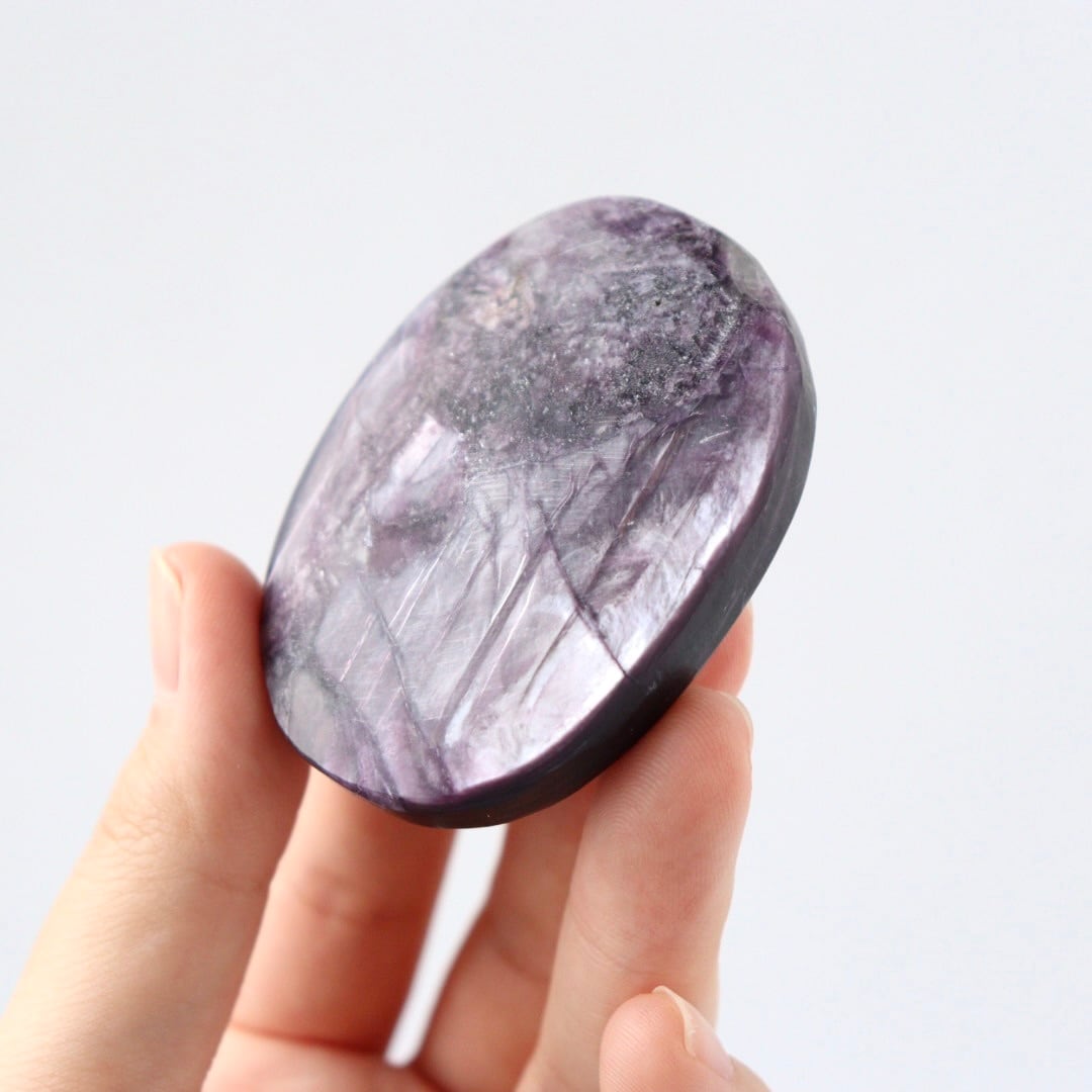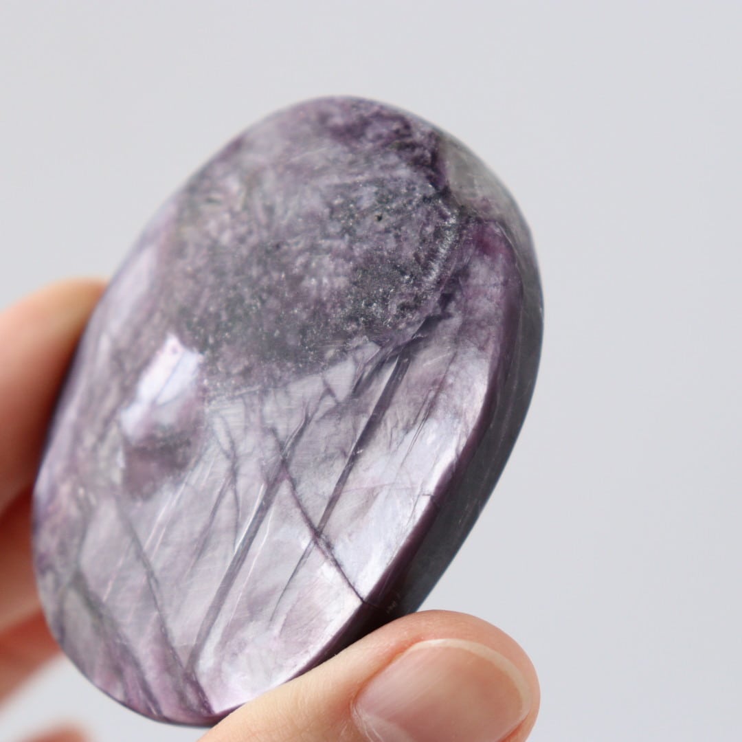 柔らかなパープルカラーと閃光が調和する、パープルマイカの握り石。
