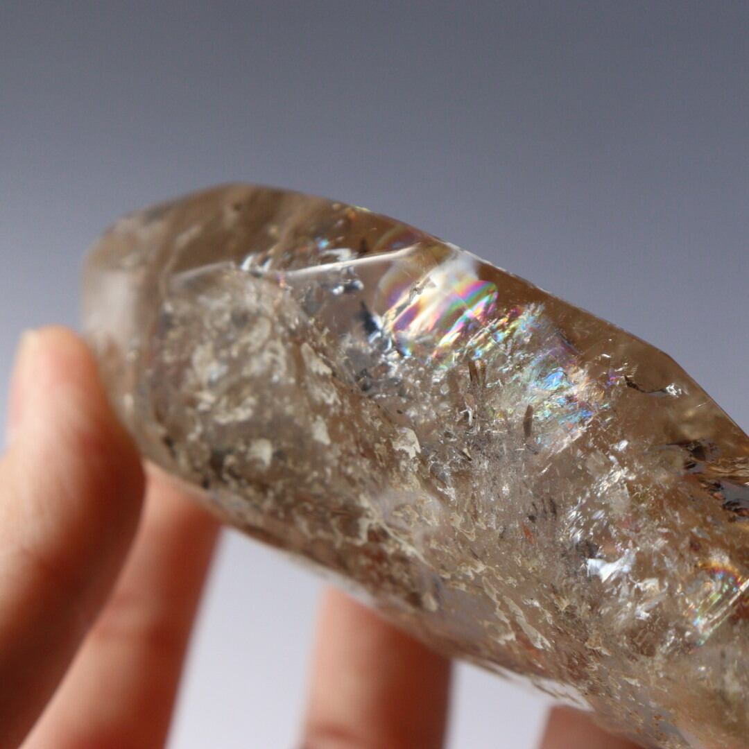 磨き上げられた表面に浮かぶ幾重もの虹と、自然な原石の風合いが見事に調和しています。