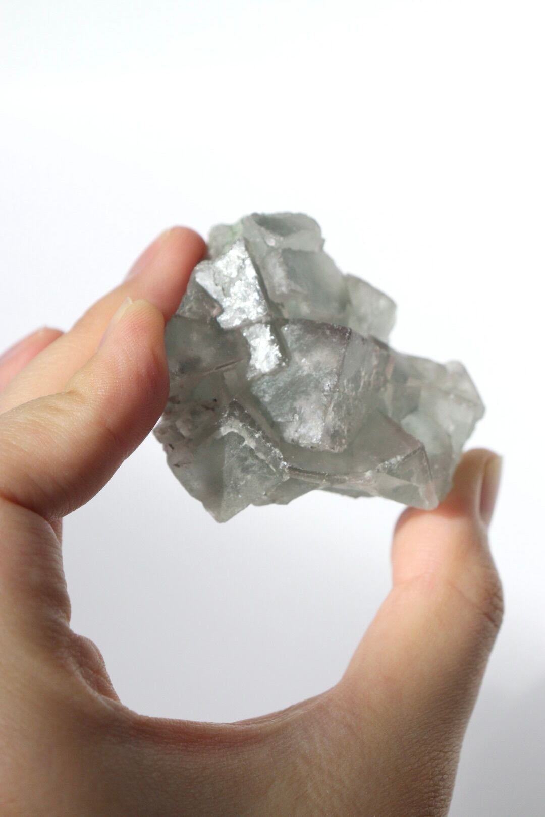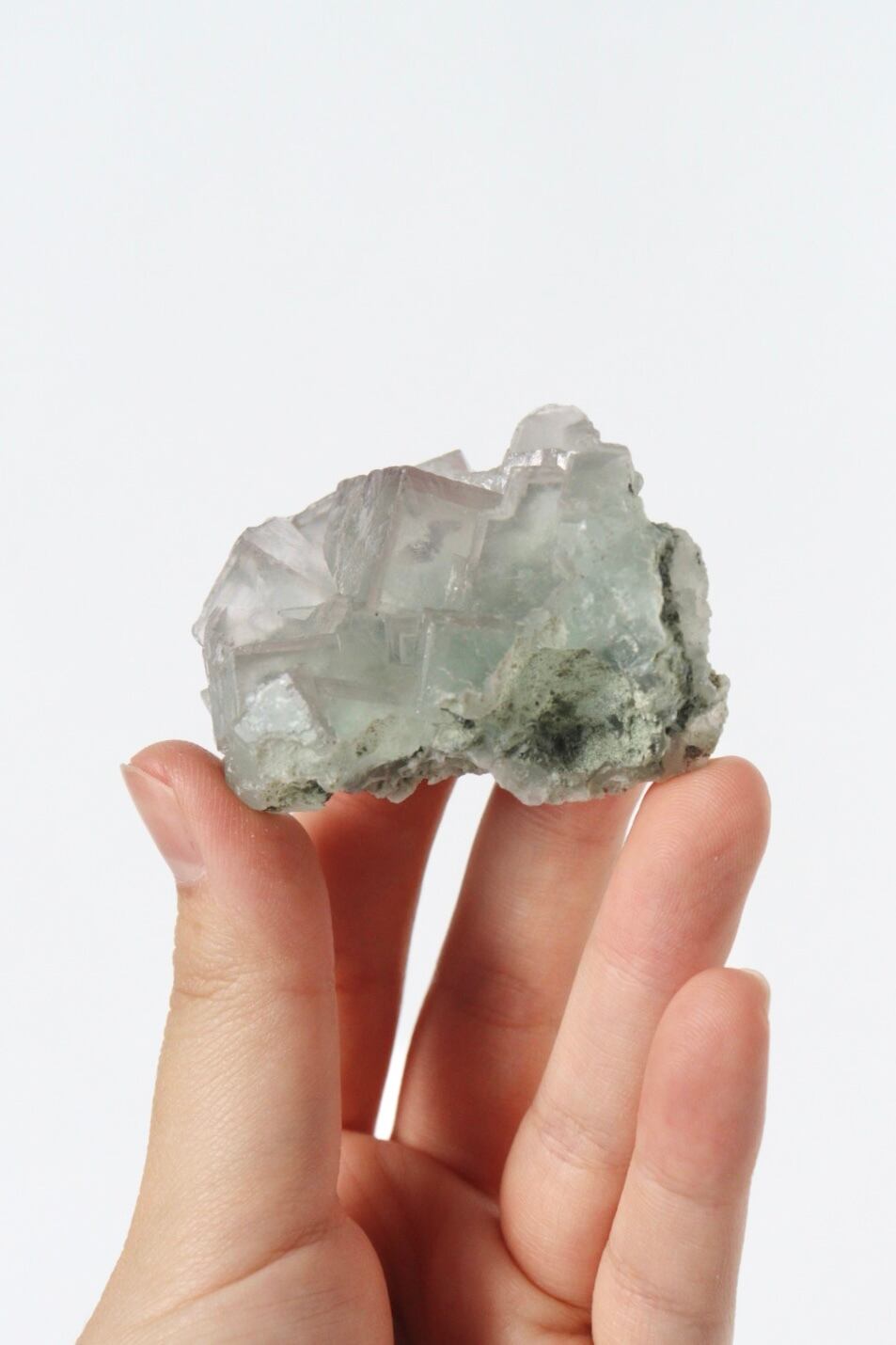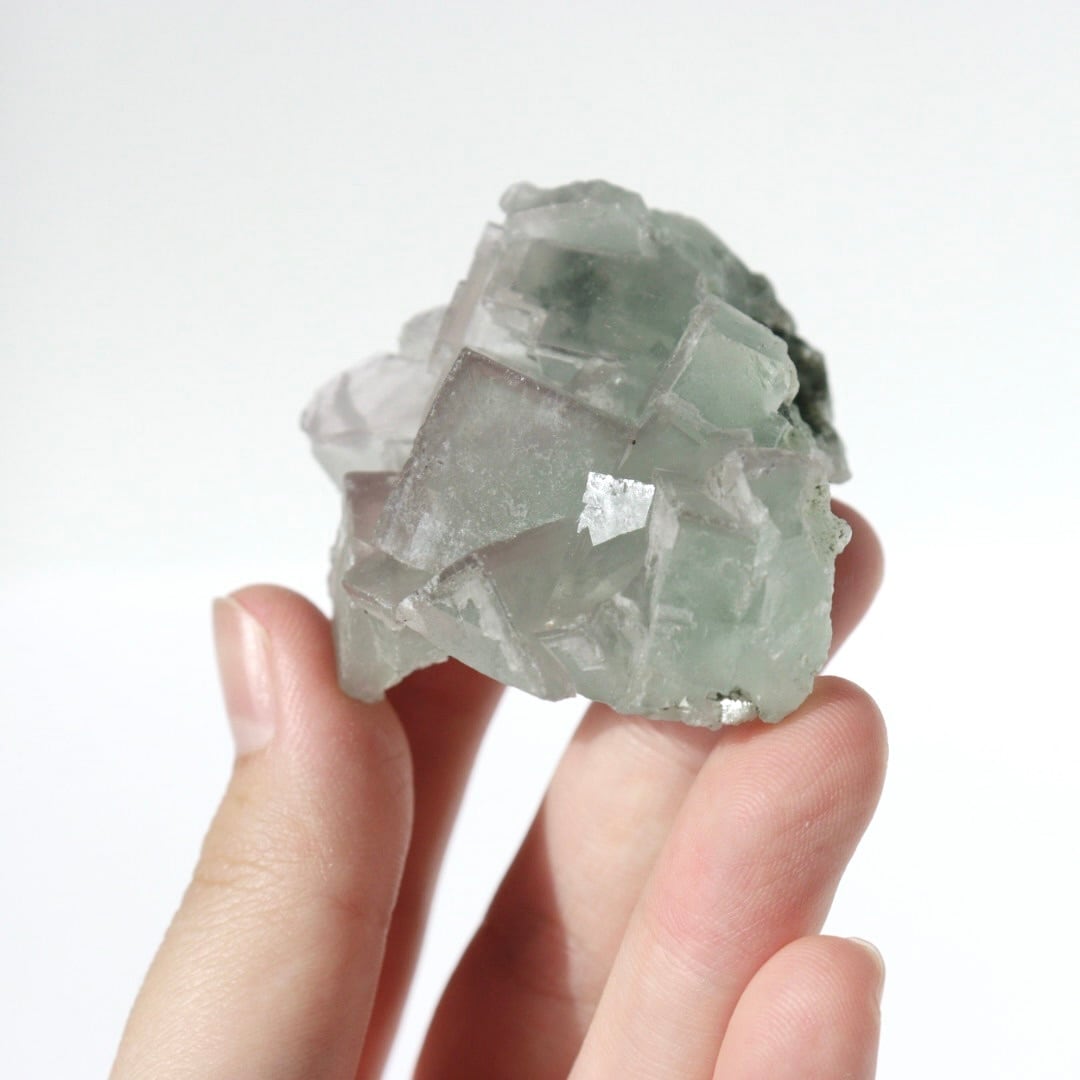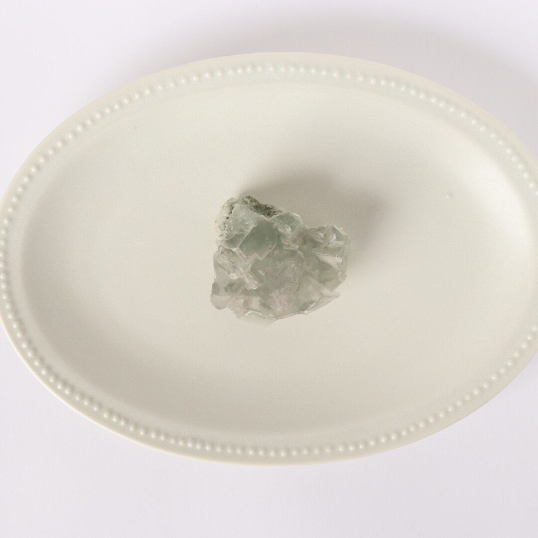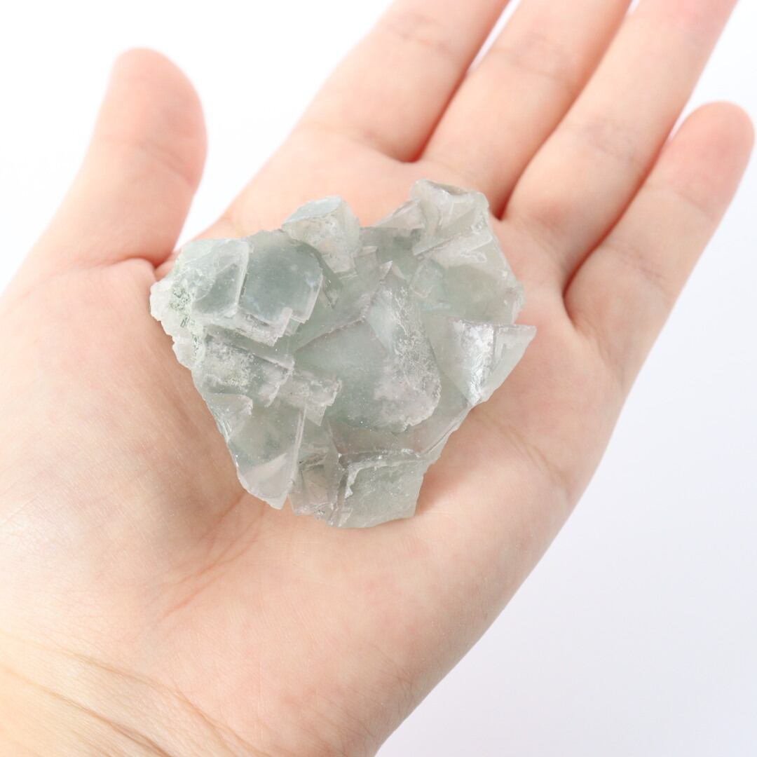 柔らかな半透明の緑みのブルーと幾何学的に積み重なる形状が可愛らしい、中国湖南省産フローライト原石です。