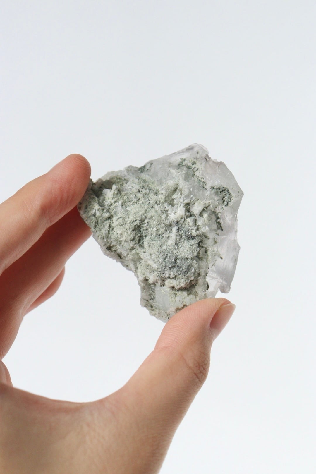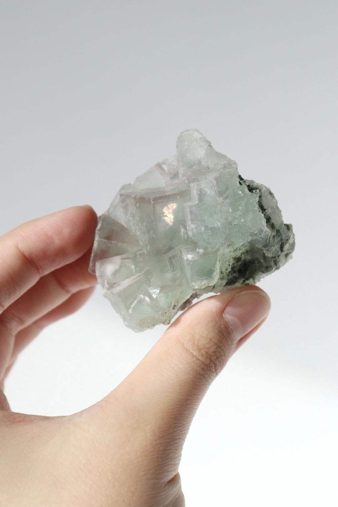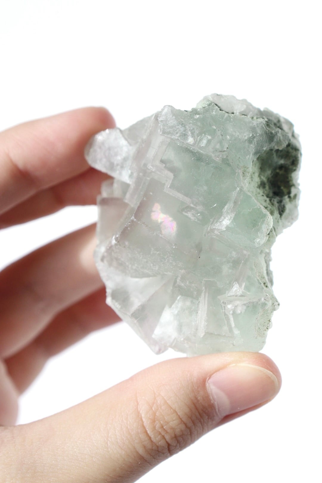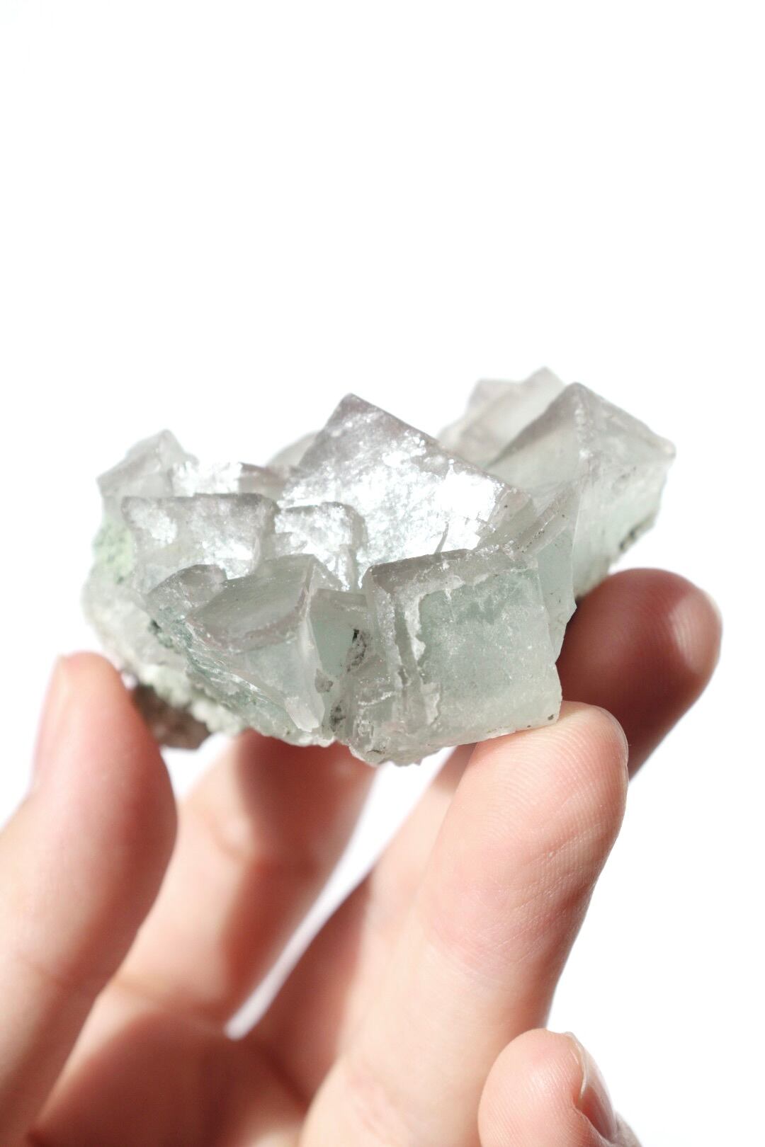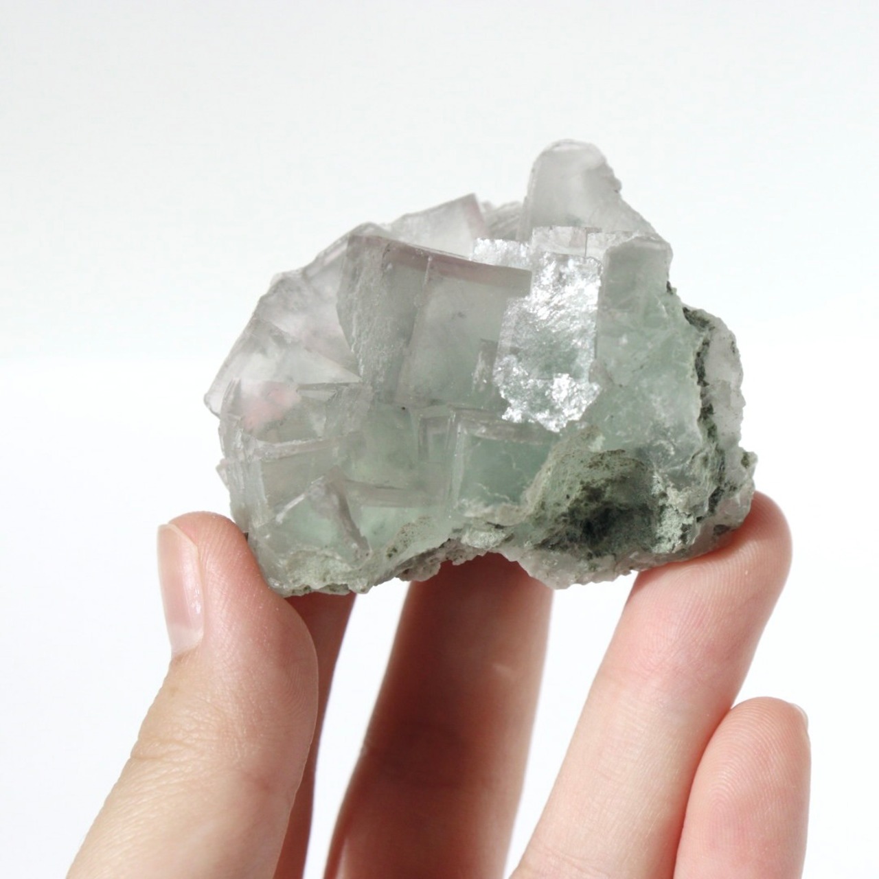 柔らかな半透明の緑みのブルーと幾何学的に積み重なる形状が可愛らしい、中国湖南省産フローライト原石です。