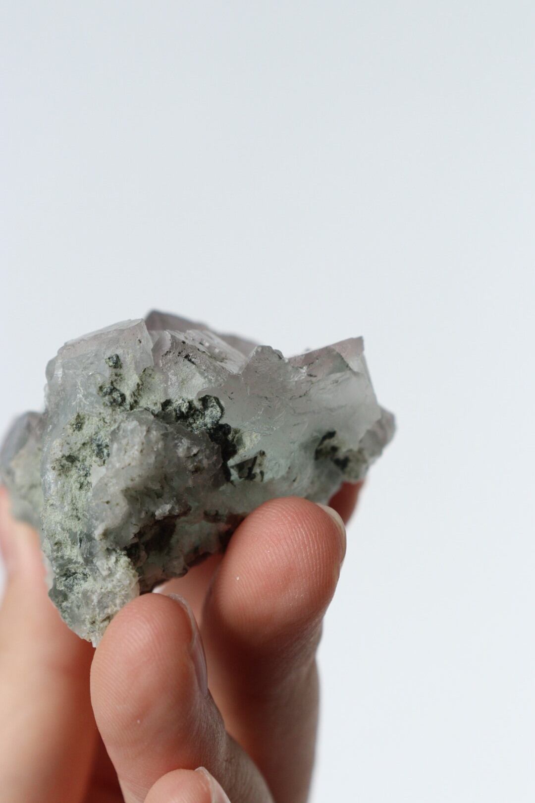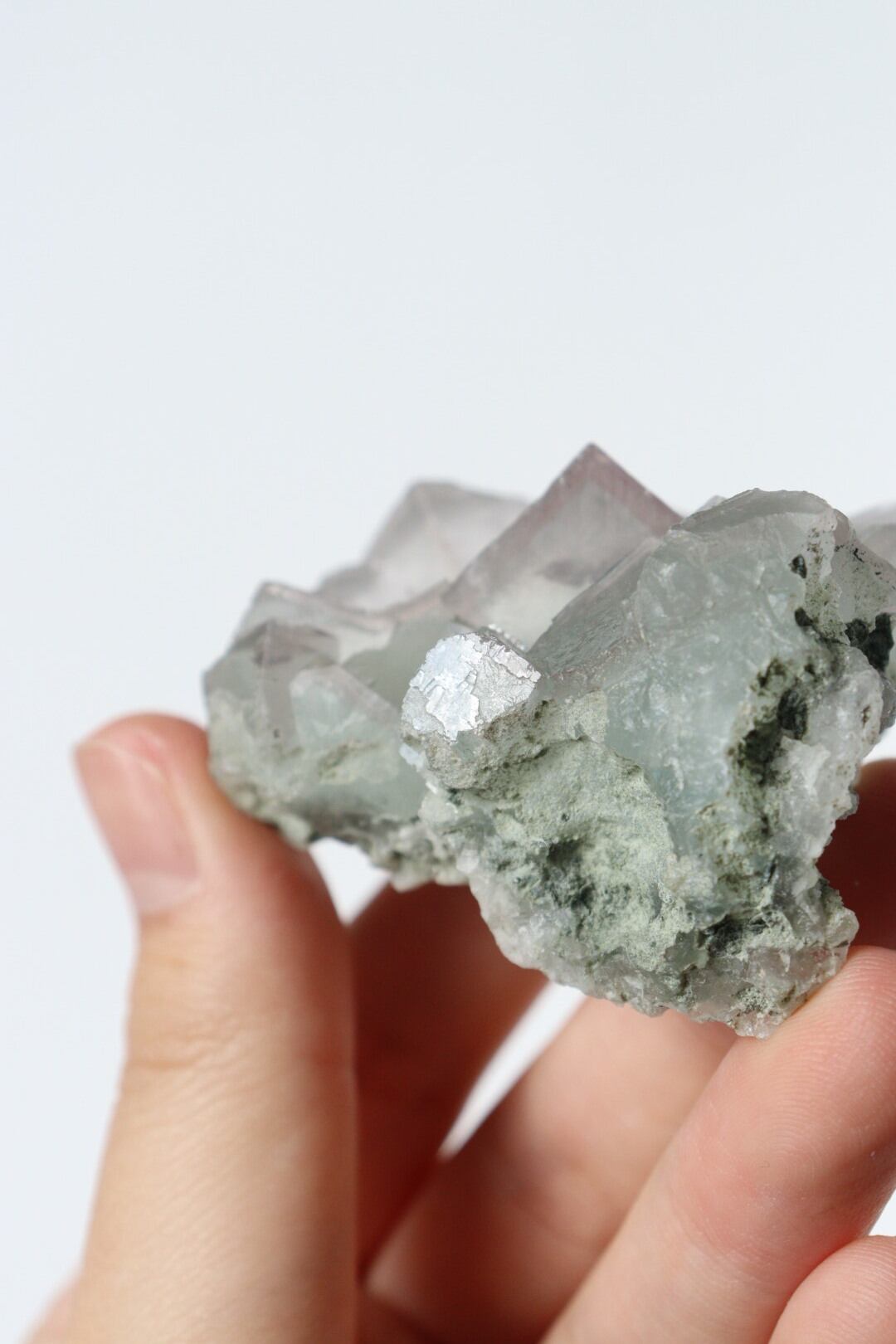 ほんのりグリーンブルーに発色した透明な結晶を、柔らかなパープルカラーが覆うように発色し、柔らかで落ち着くような雰囲気。