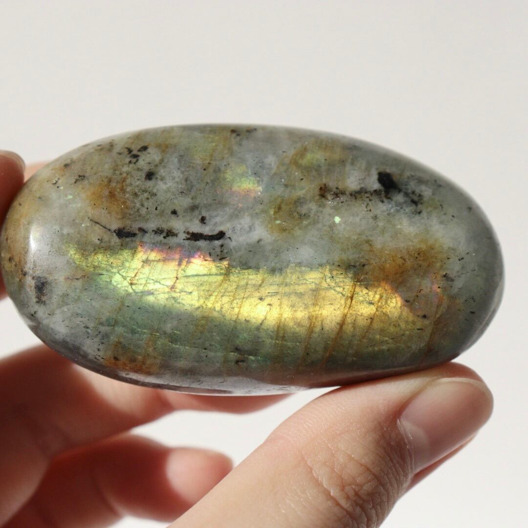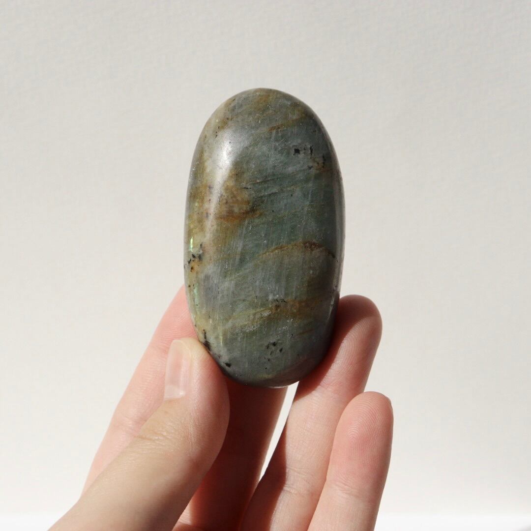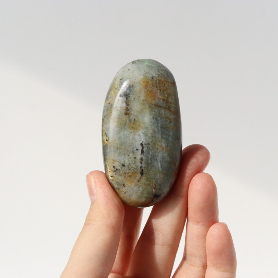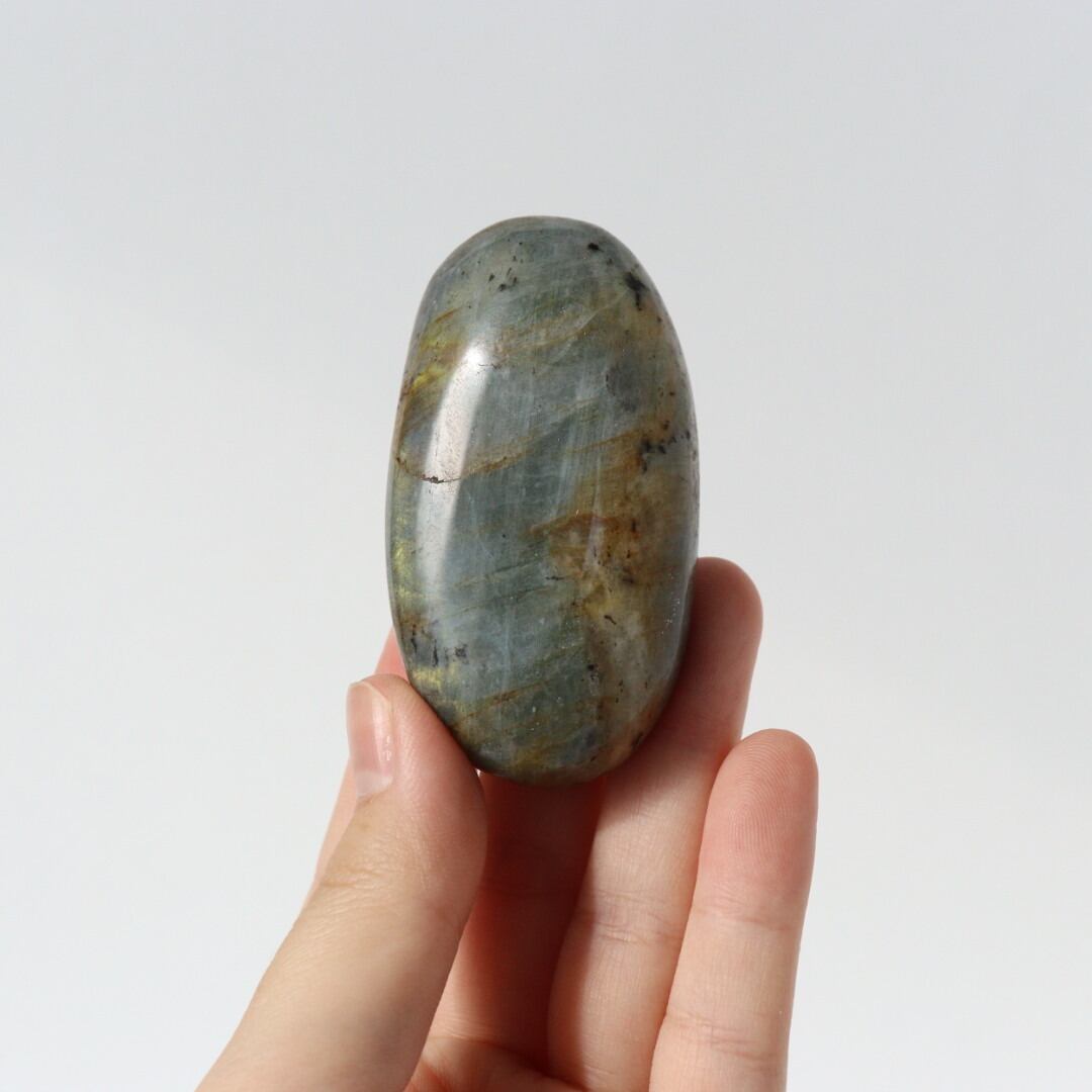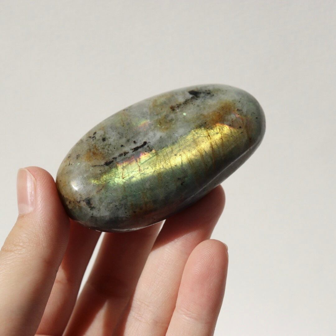 イエローシラーが両面に現れる、珍しい発色のラブラドライトの握り石。