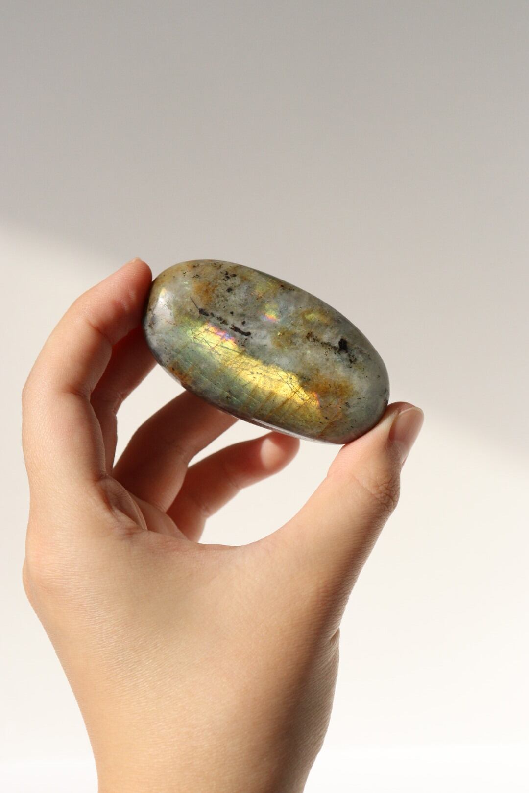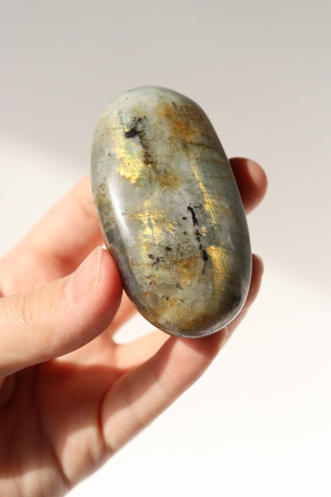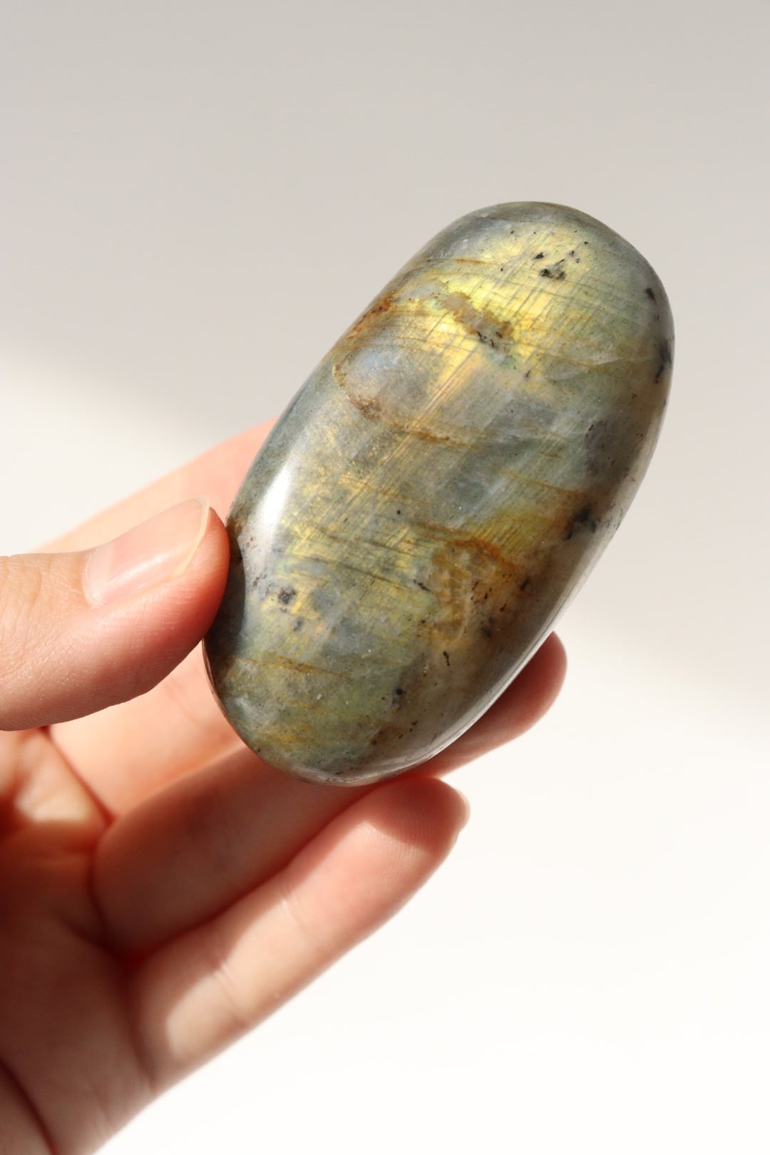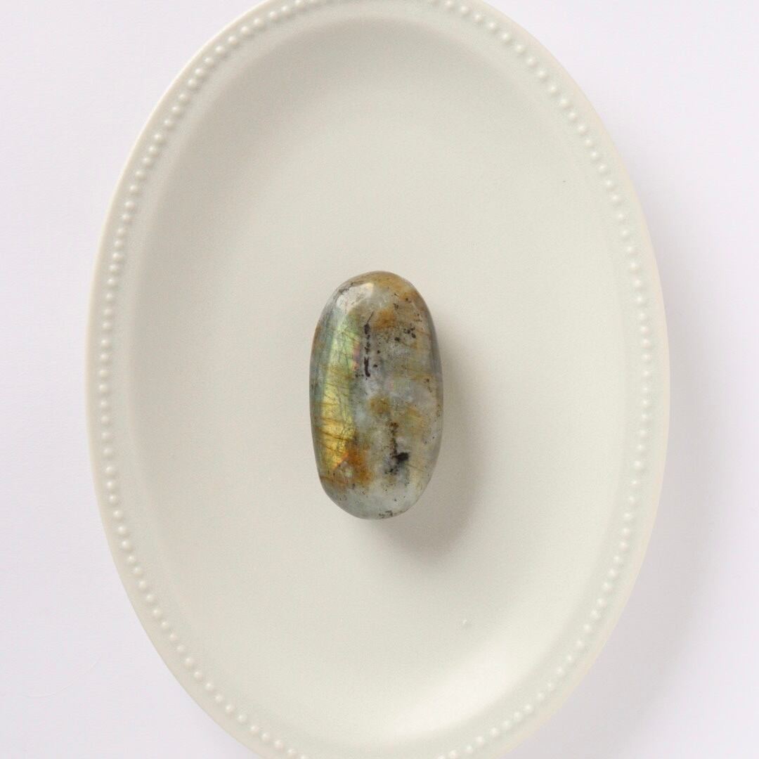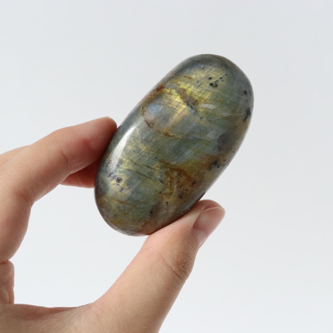 イエローシラーが両面に現れる、珍しい発色のラブラドライトの握り石。