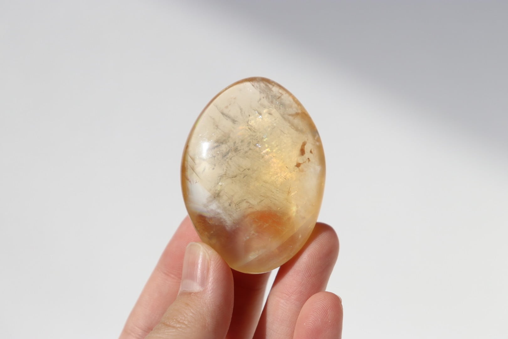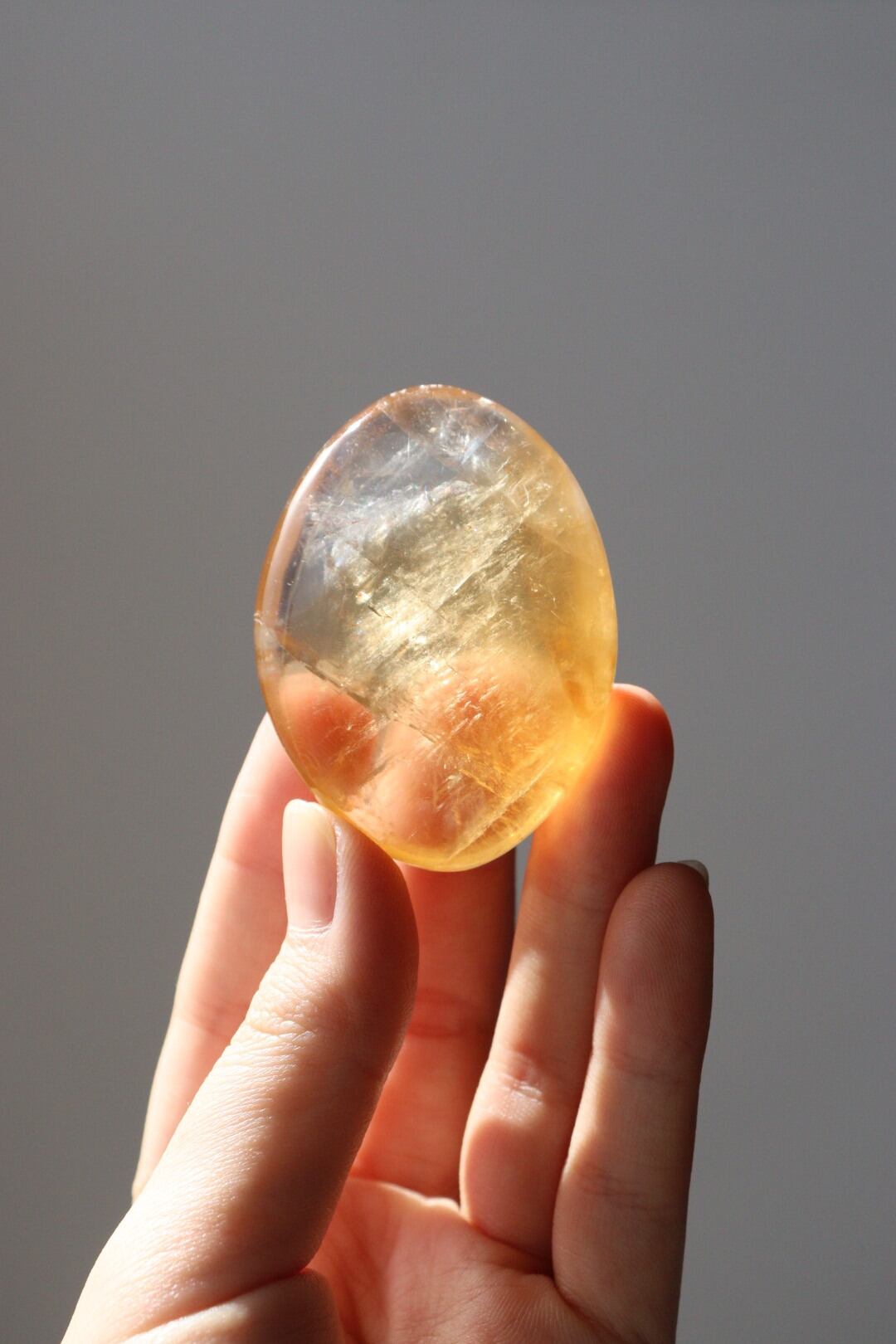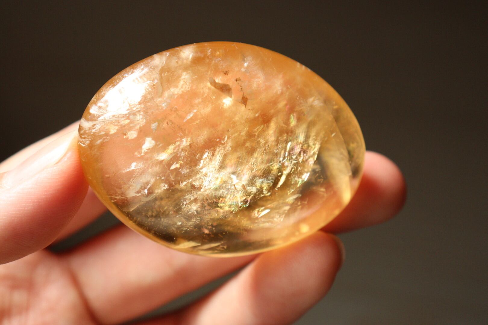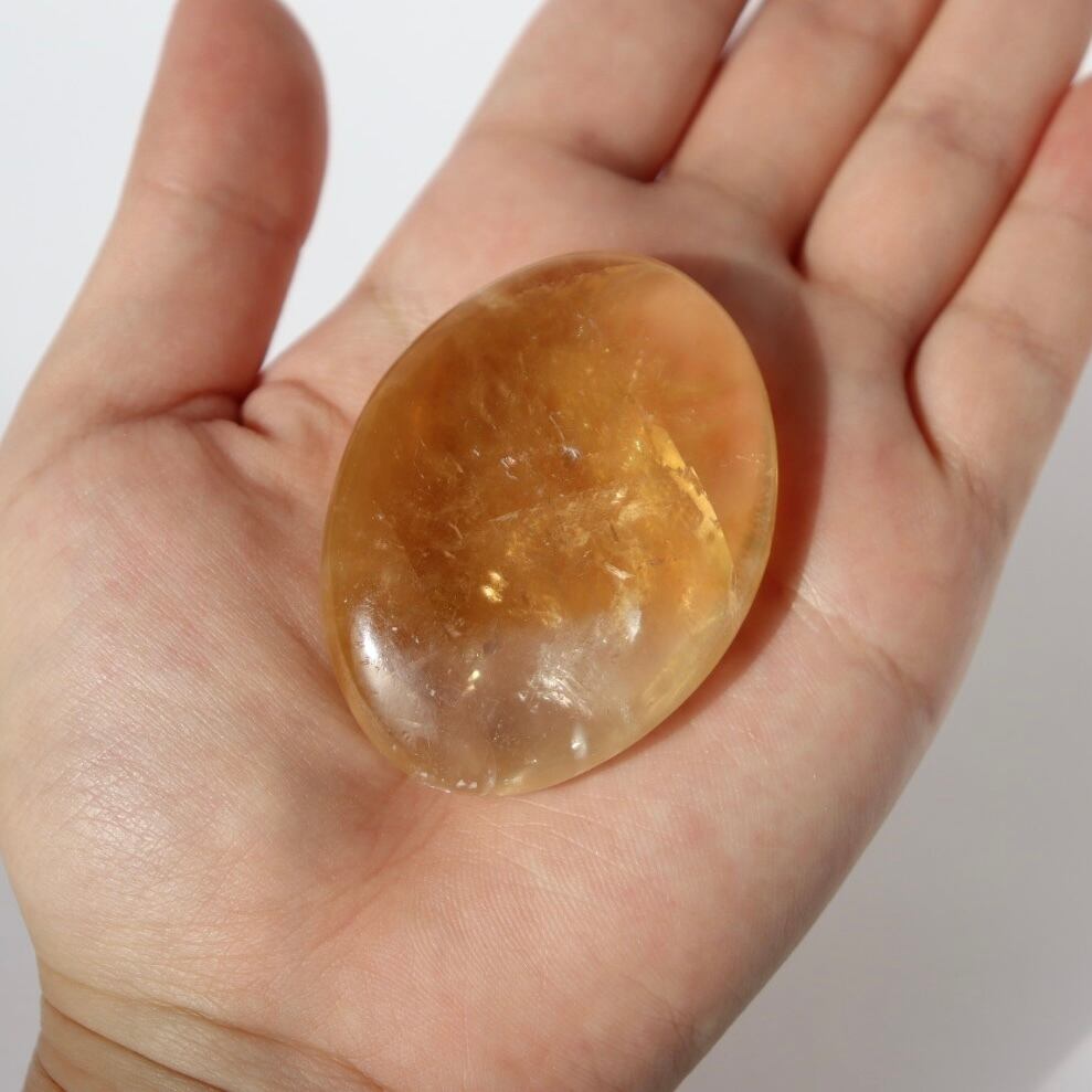 透き通るアンバーの結晶が美しい、ハニーカルサイトの握り石。
